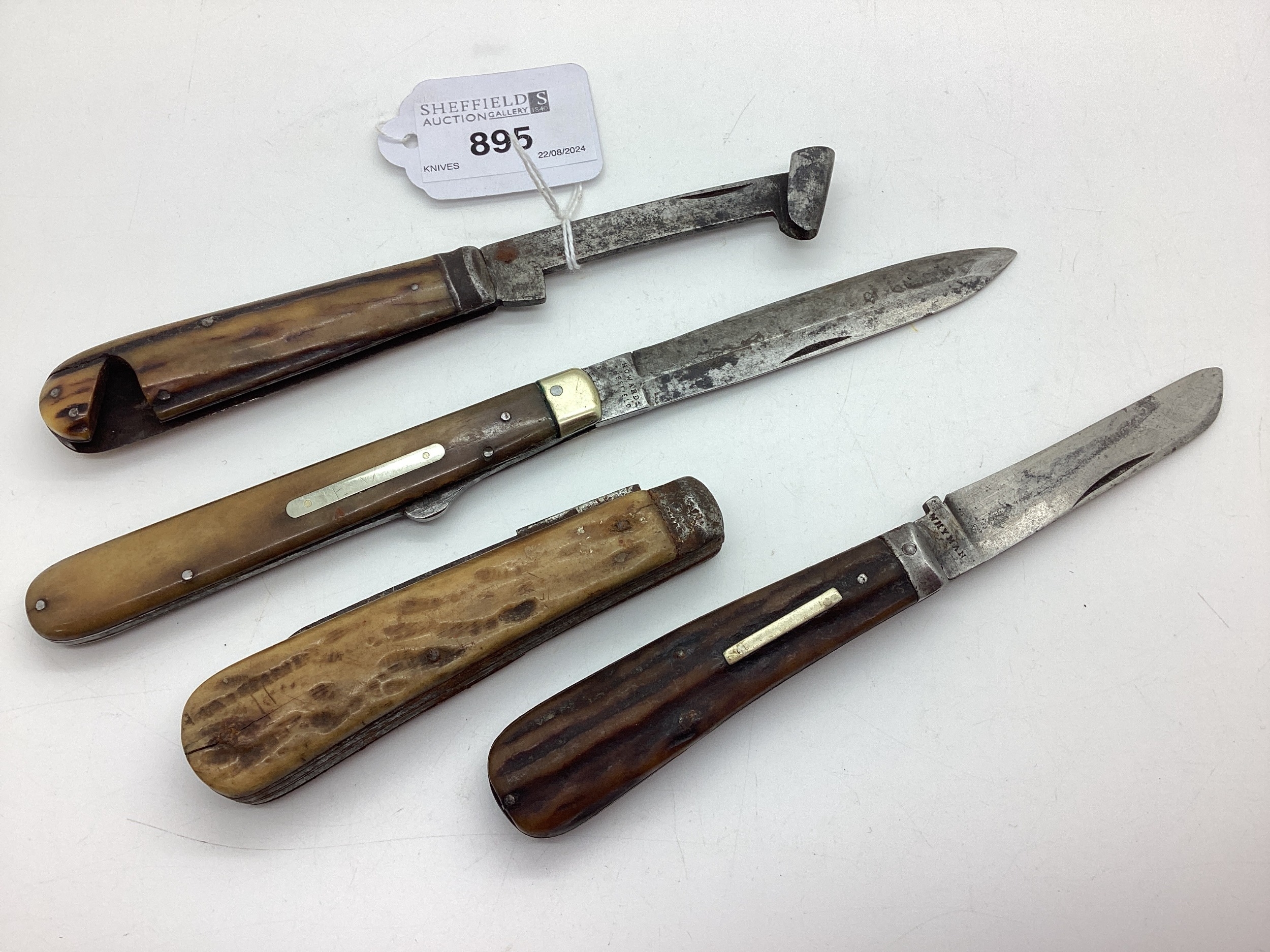 Single Blade Folding Knife, blade stamped "Howards Sheffield" (11.4cm closed); A Smaller Single Blade Folding Knife, blade stamped "Whyman" (9.1cm closed); Timber Scribe, blade stamped "Taylor Witness" (9.1cm closed); Another Knife, (damaged / incomplete / rust). (4)