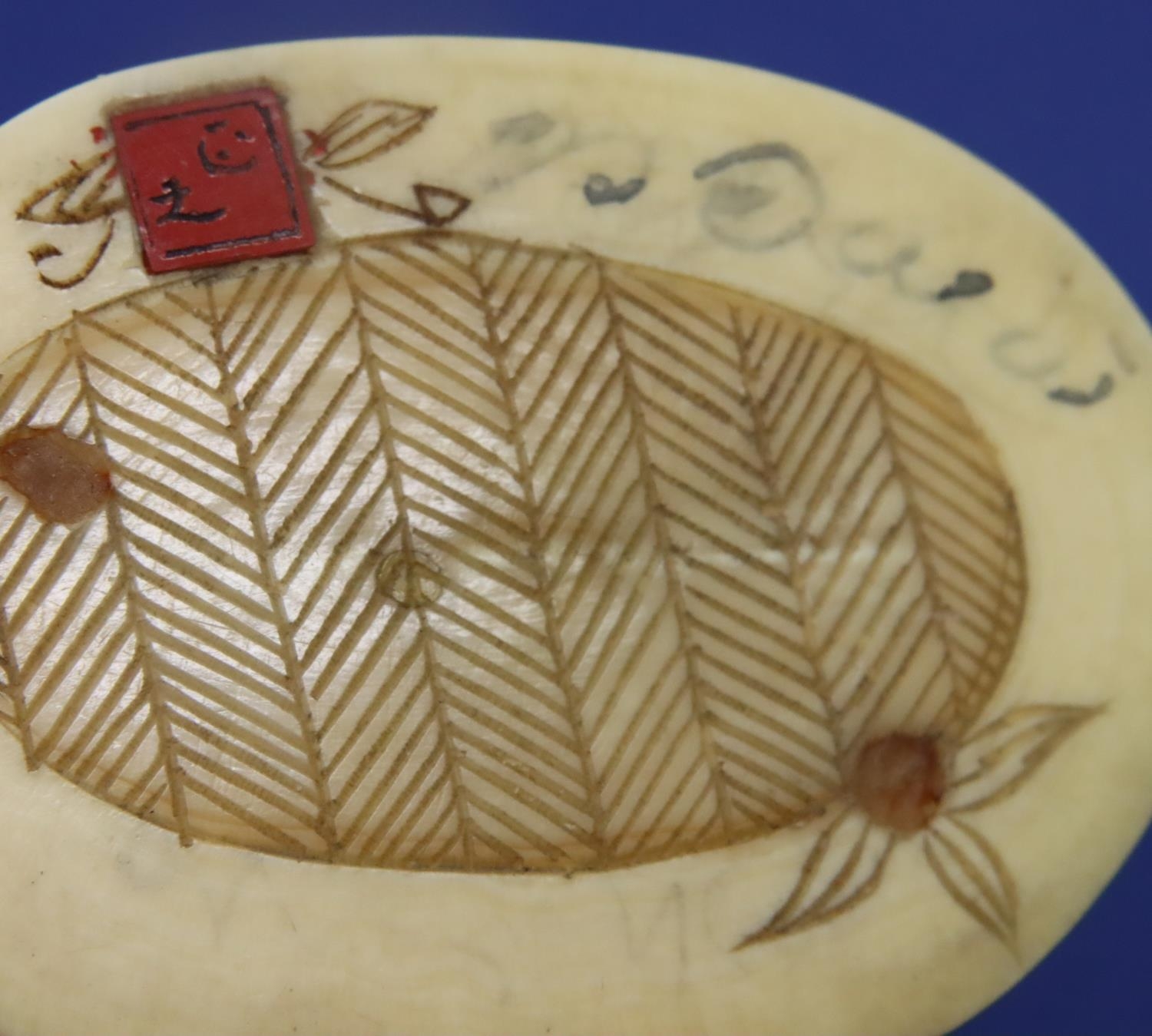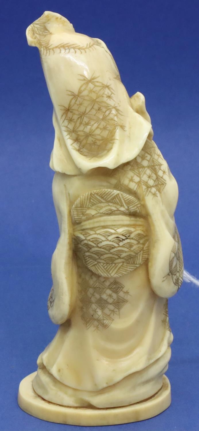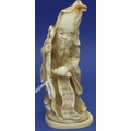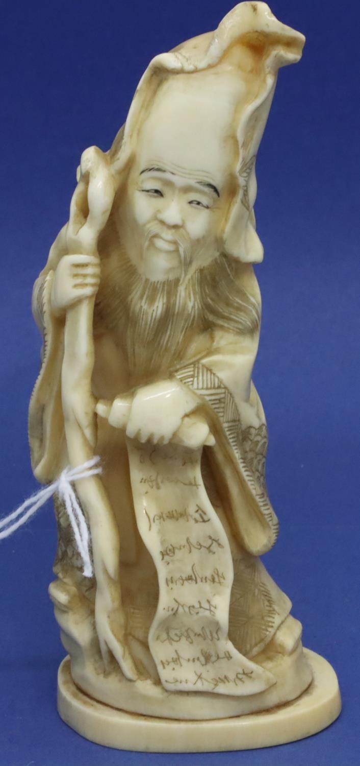 Carved ivory figurine of a bearded man with scroll and staff, H: 117 mm, signed in panel to base. P&P Group 1 (£14+VAT for the first lot and £1+VAT for subsequent lots)
