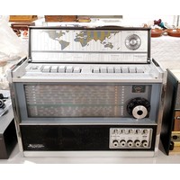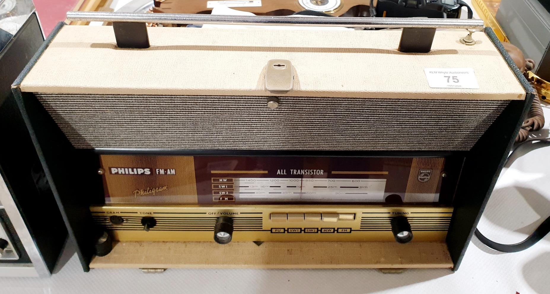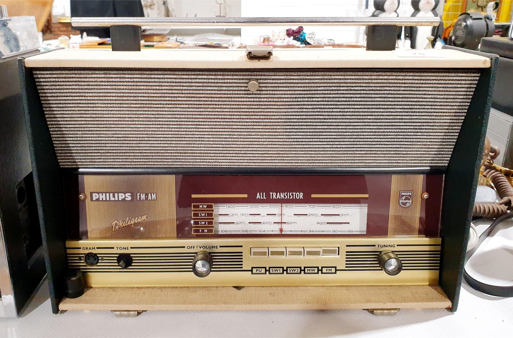 A vintage Phillips Philligram portable radio, A/F, width 38.5cm. No shipping. Arrange collection or your own packer and shipper, please. Electricals are sold as scrap.