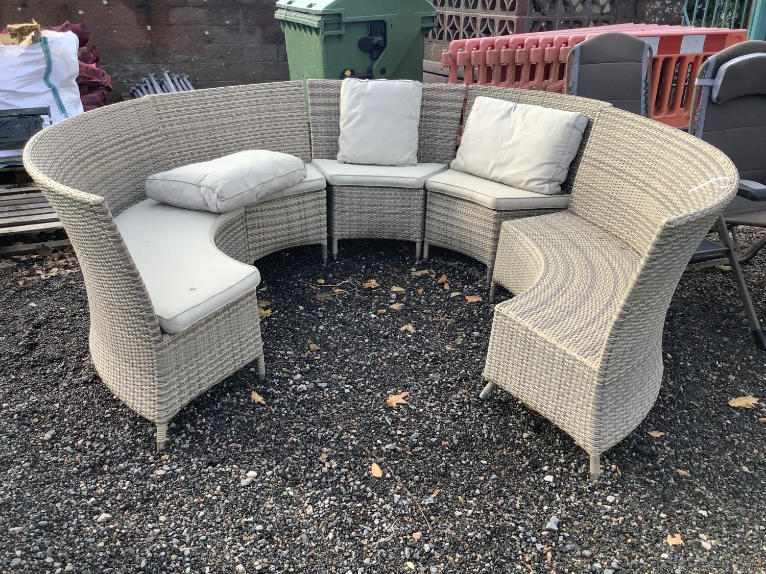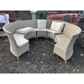 An all weather rattan patio suite of circular form (one cushion absent, one support leg damaged)