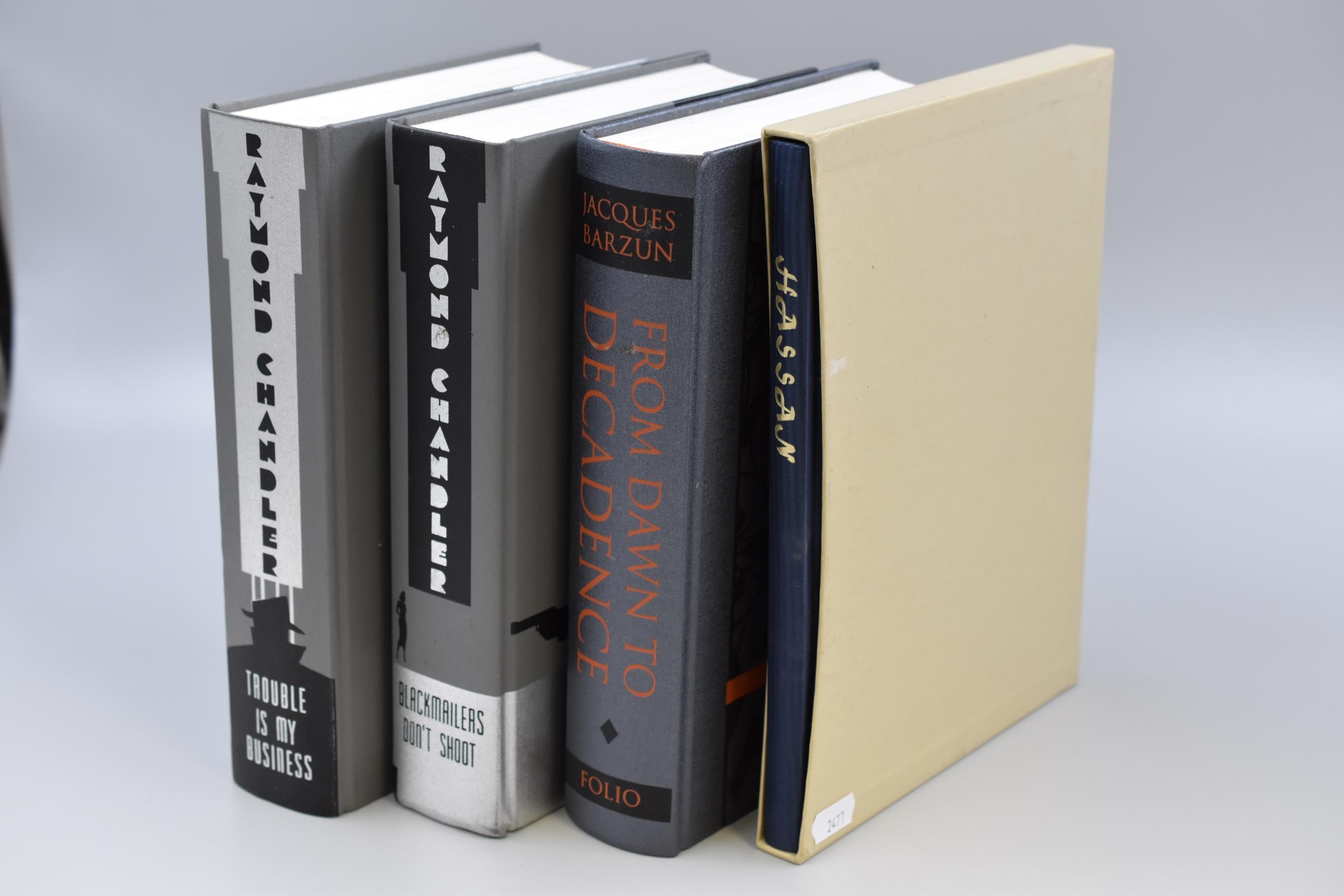 Four Hardback Folio Society Books, includes Raymond Chandler, Jaques Barzun and Hassan