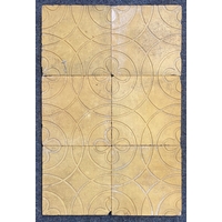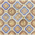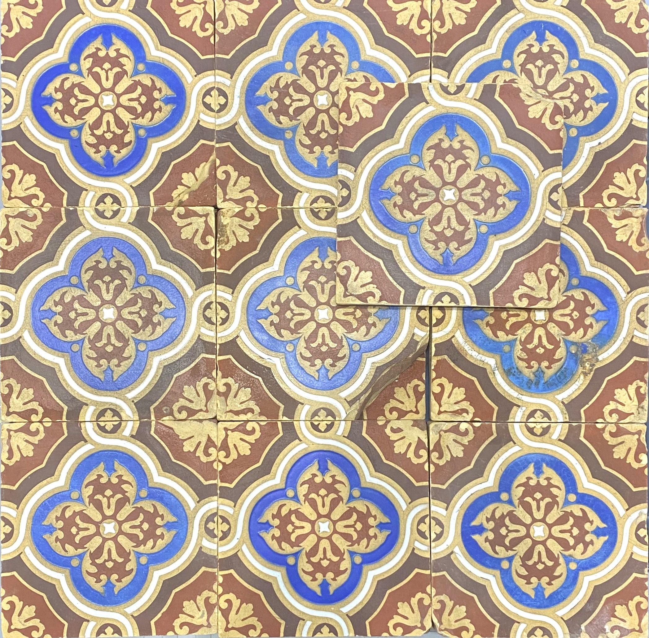 Nineteen Minton & Co tiles with repeating design in buff, red, brown, blue and white, 15.2cm by 15.2cm (a/f)
