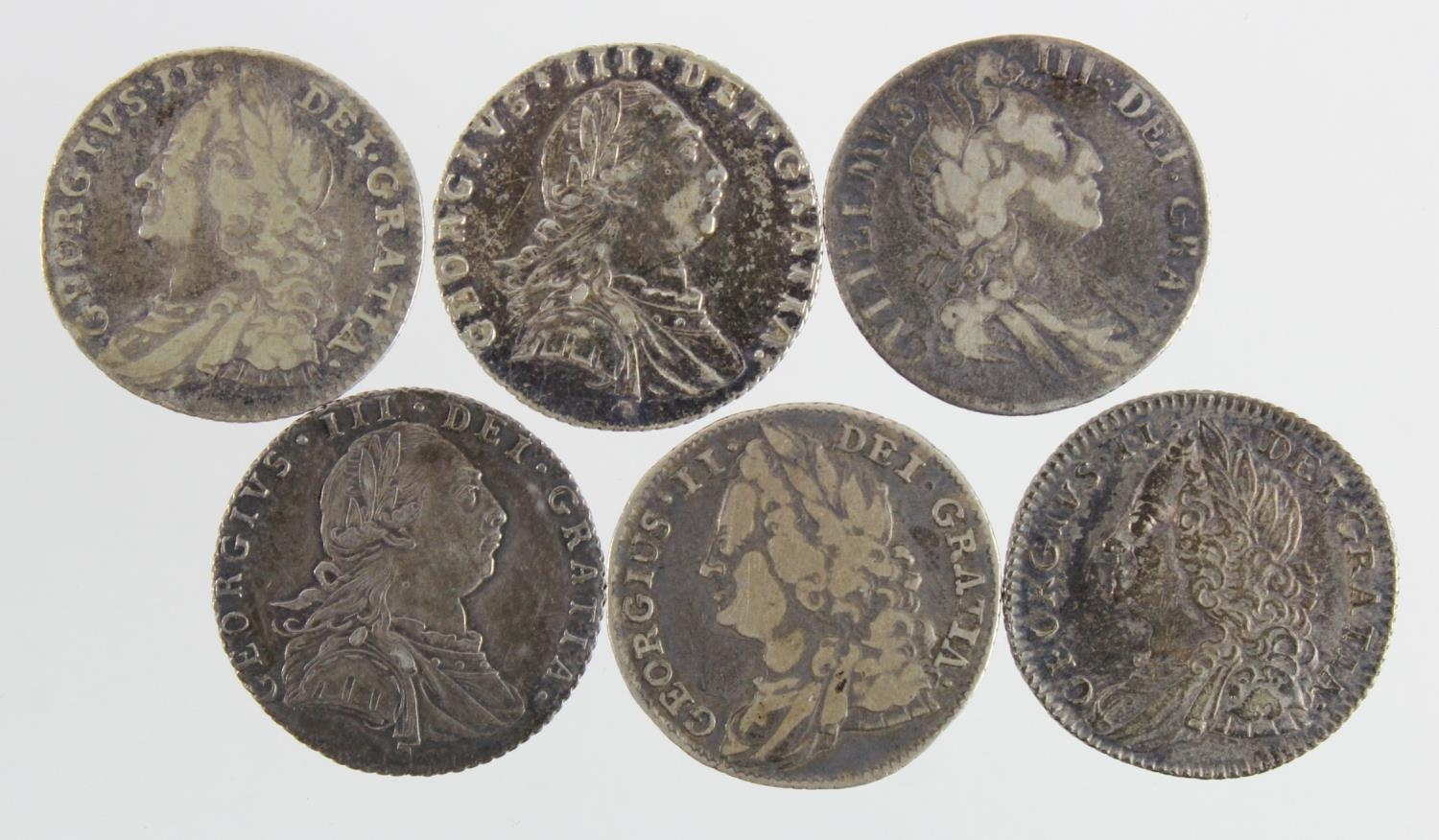GB Sixpences (6) early milled: 1697 late harp, large crowns, S.3538, Fine, 1743 rose, S.3709, Fine, 1757 nEF, 1758 nVF, 1787 with hearts nEF, and ditto GVF