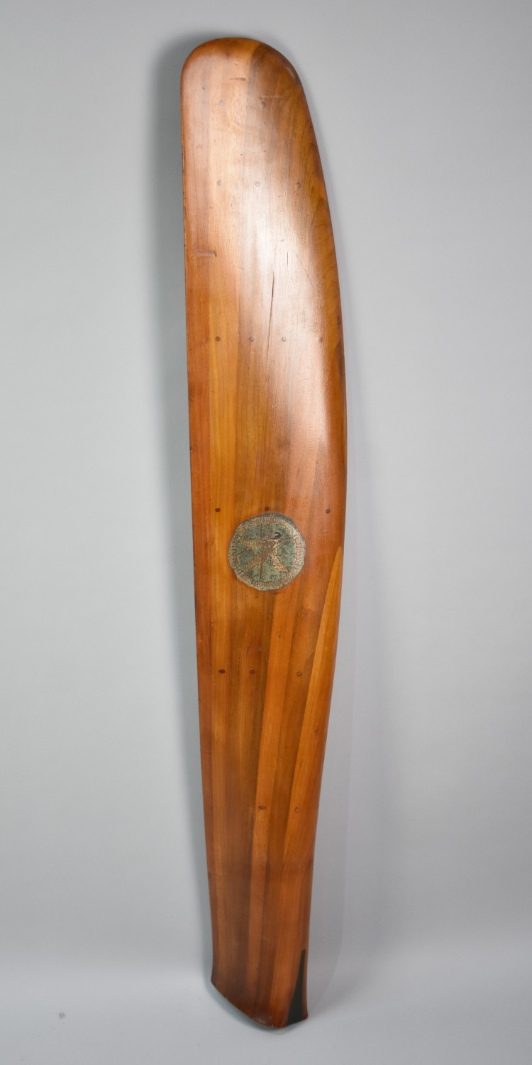 A WWI Half Propellor Blade from an Avro 504, Having Brass Plaque Inscribed 'Which Fell to Earth at Perham Down, Wiltshire. On the 25th April, 1918. Fatally Injuring Pilot Lieutenant HM Whitcut RFC and His Crew'
