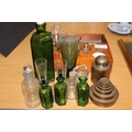 Apothecary items to include glass bottles, glass measure, cased set of weights, nesting weights, eye bath etc.