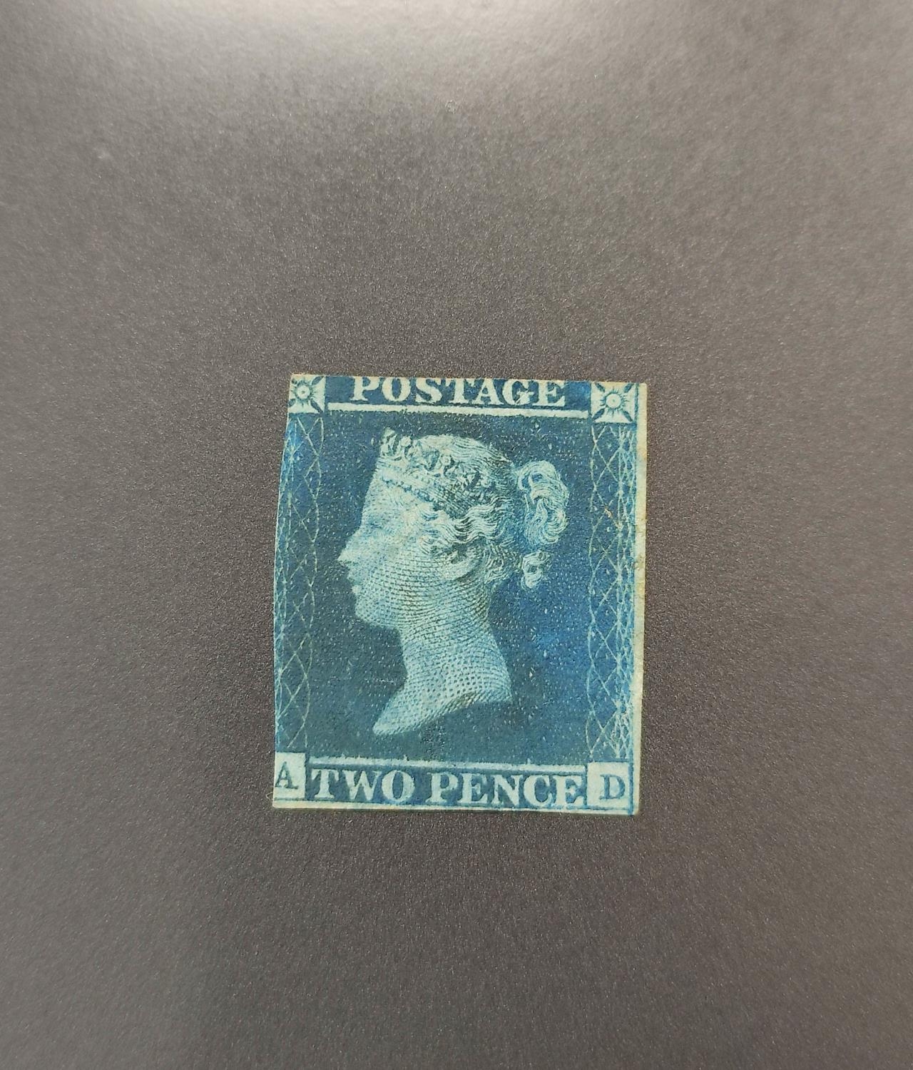 United Kingdom. Victorian 2d blue imperforated postage stamp lacking postmark with plate letters A.D & gummed reverse.