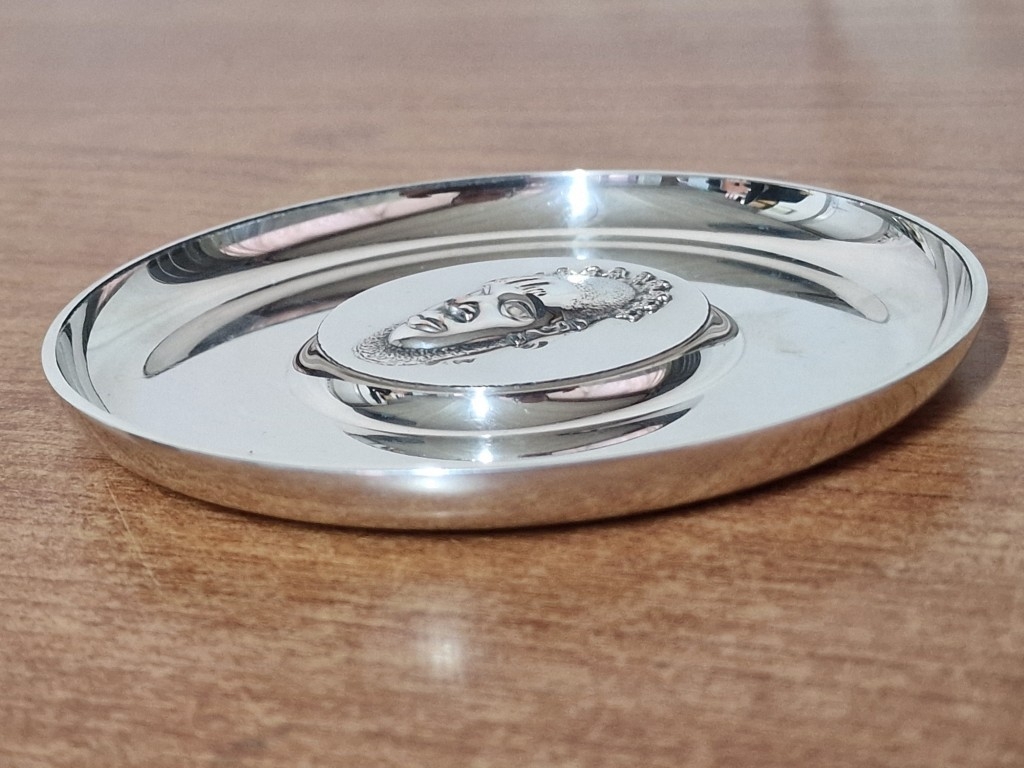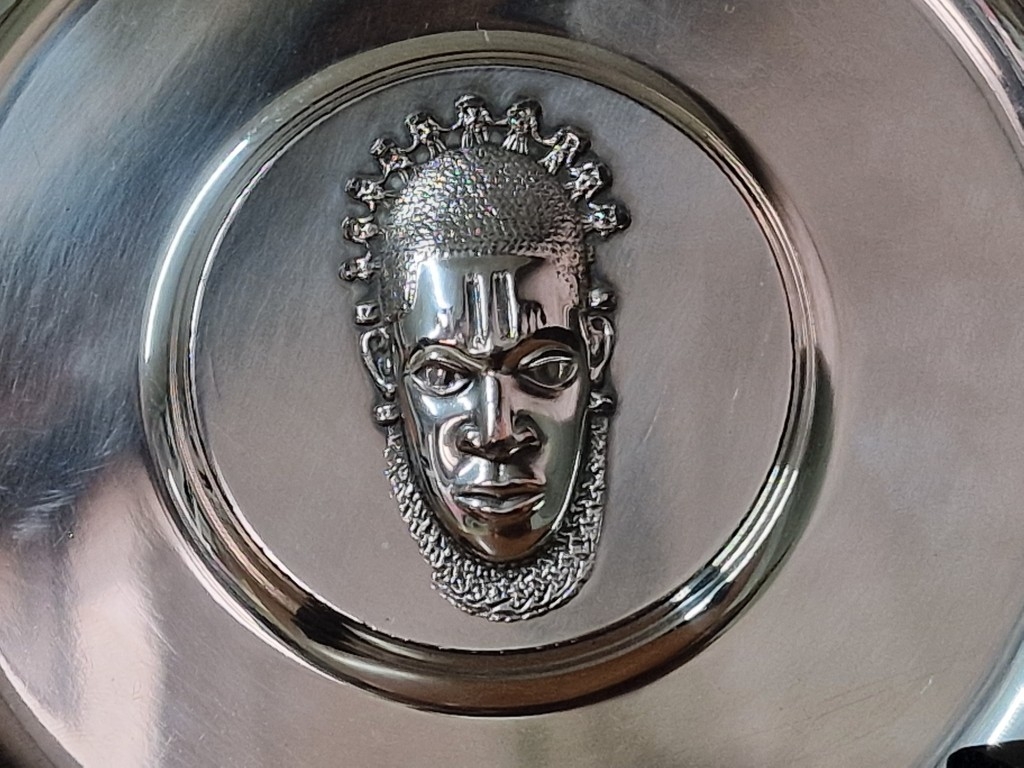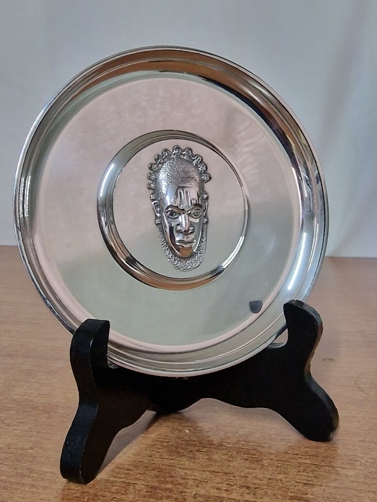 Christofle Silver Plated Dish / Small Plate with Mask of Benin Relief in Centre, Made in France, (Approx. Ø: 12cm, 225g)