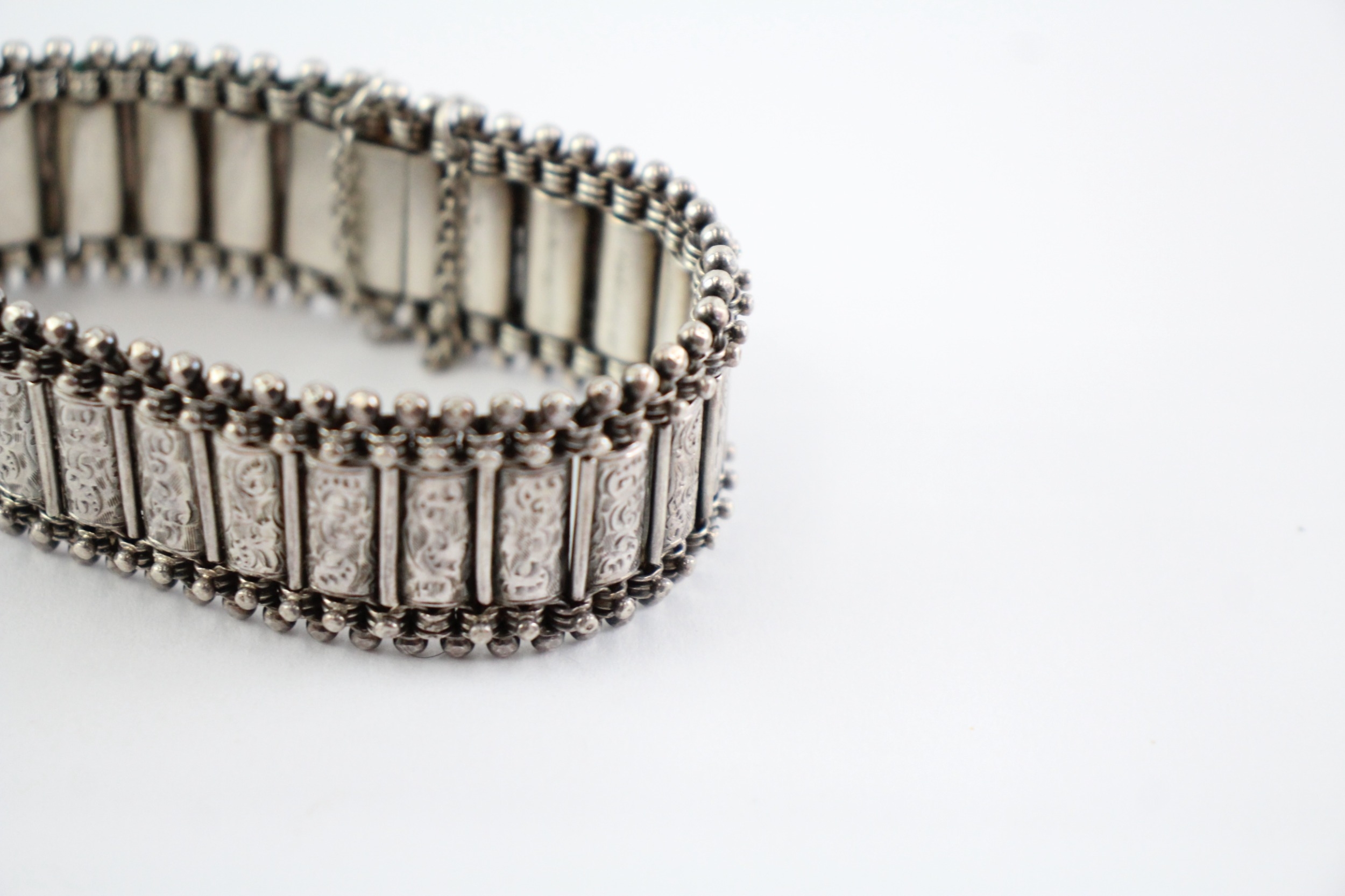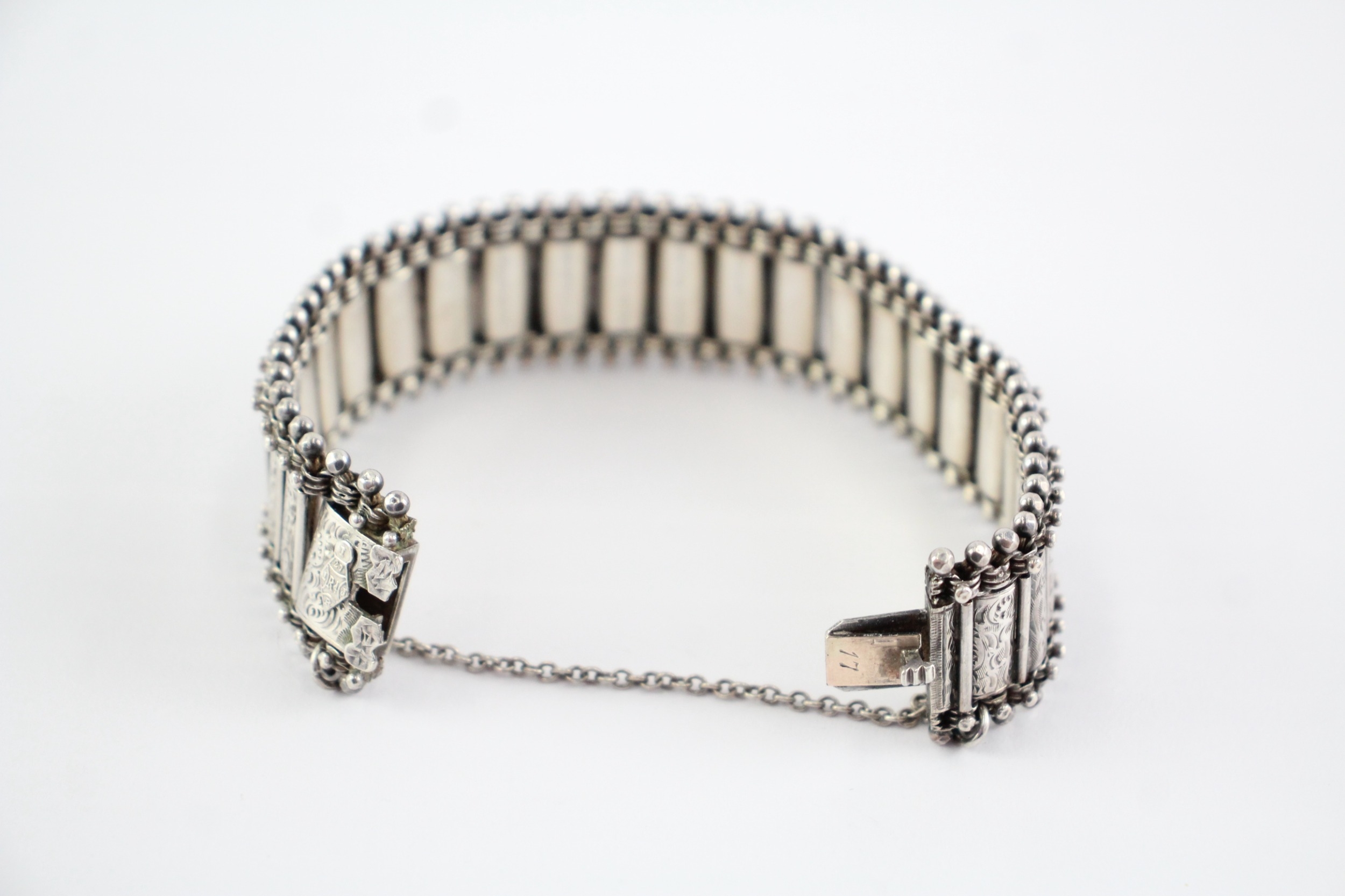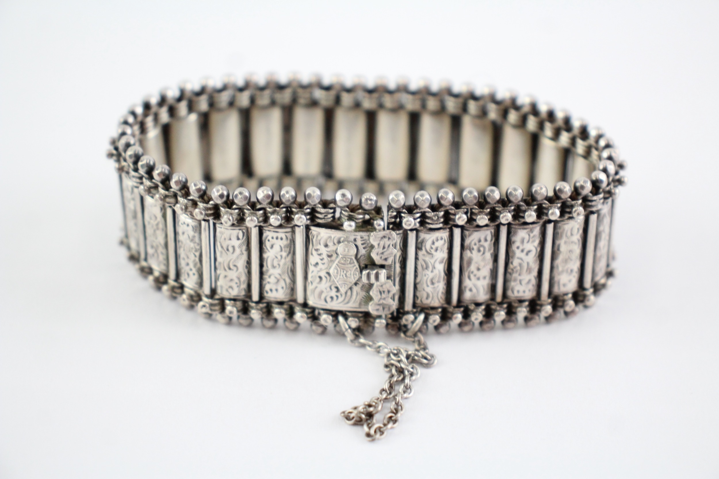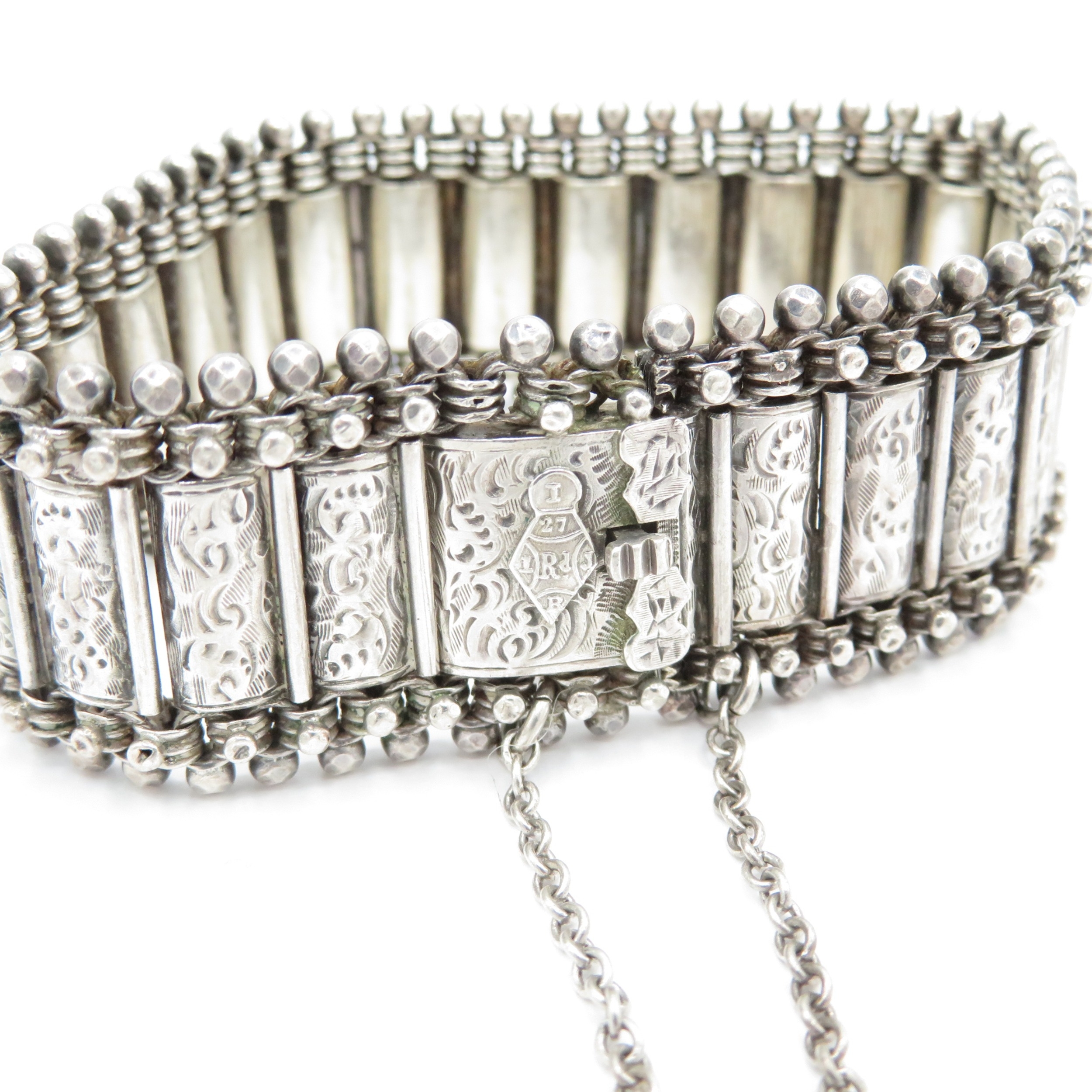 Sterling Silver Antique Bracelet, w/ Etched, Safety Chain, Box Clasp (37g)