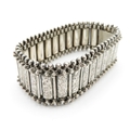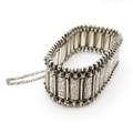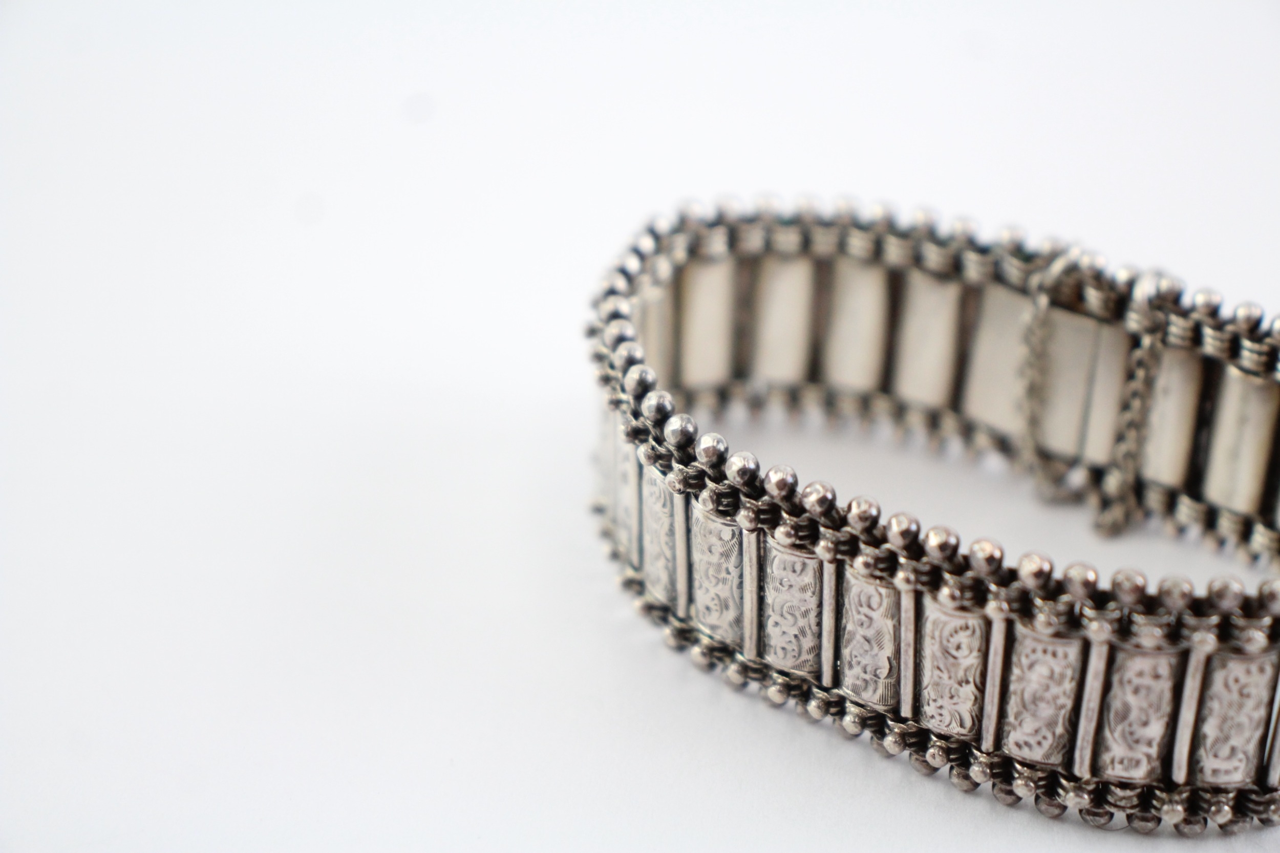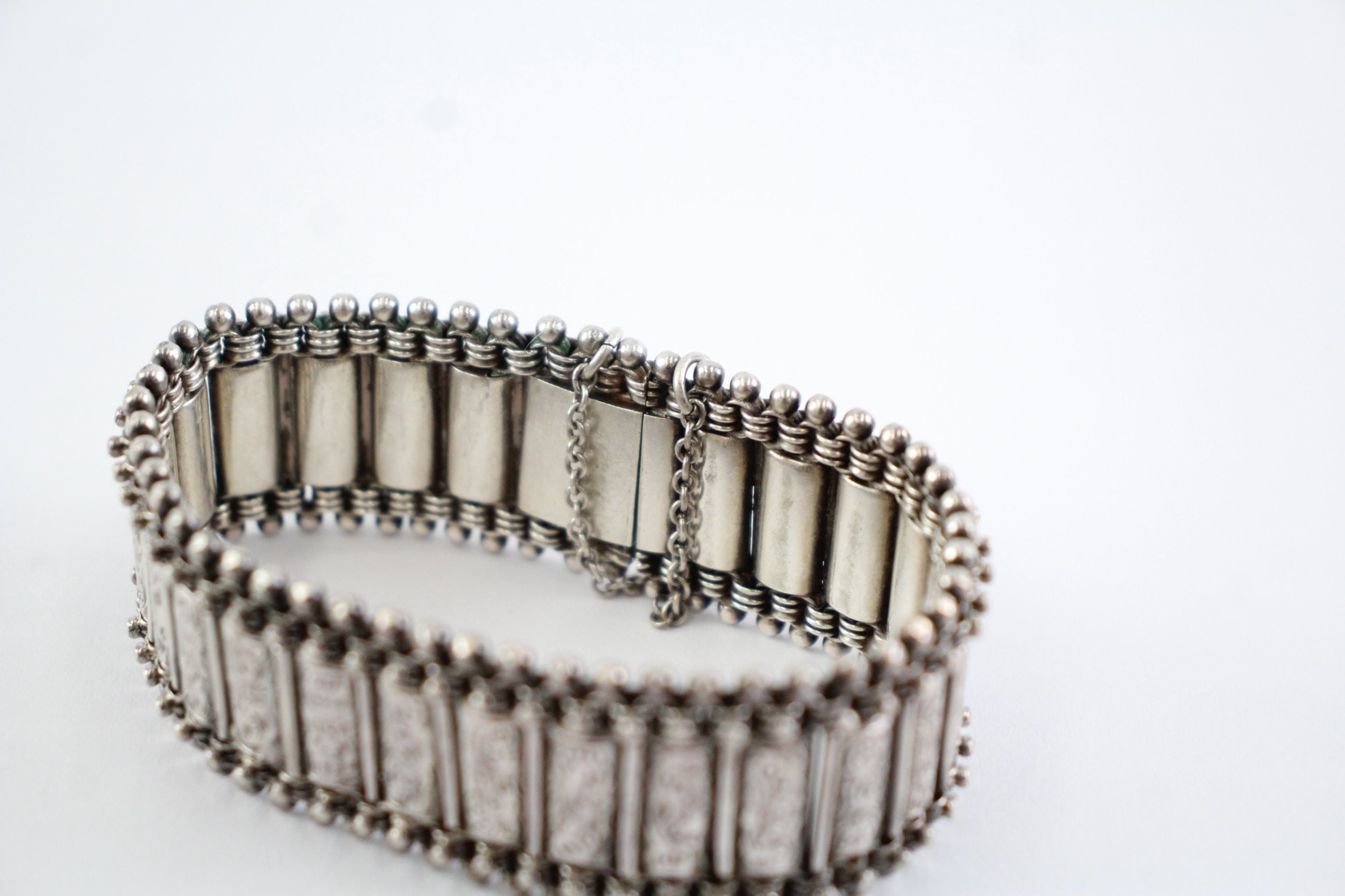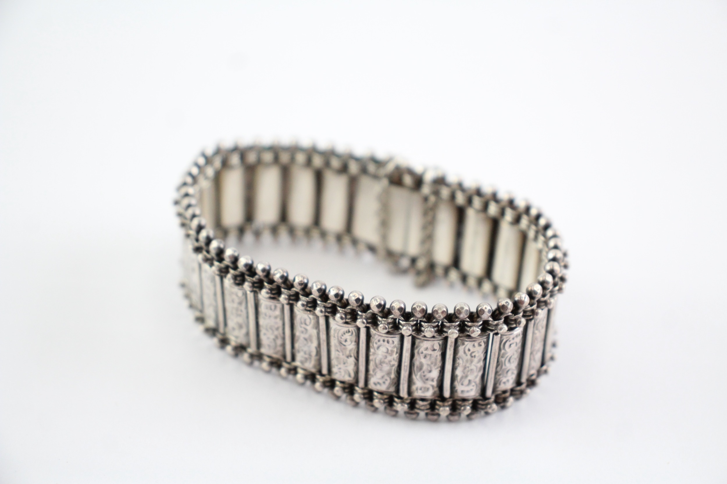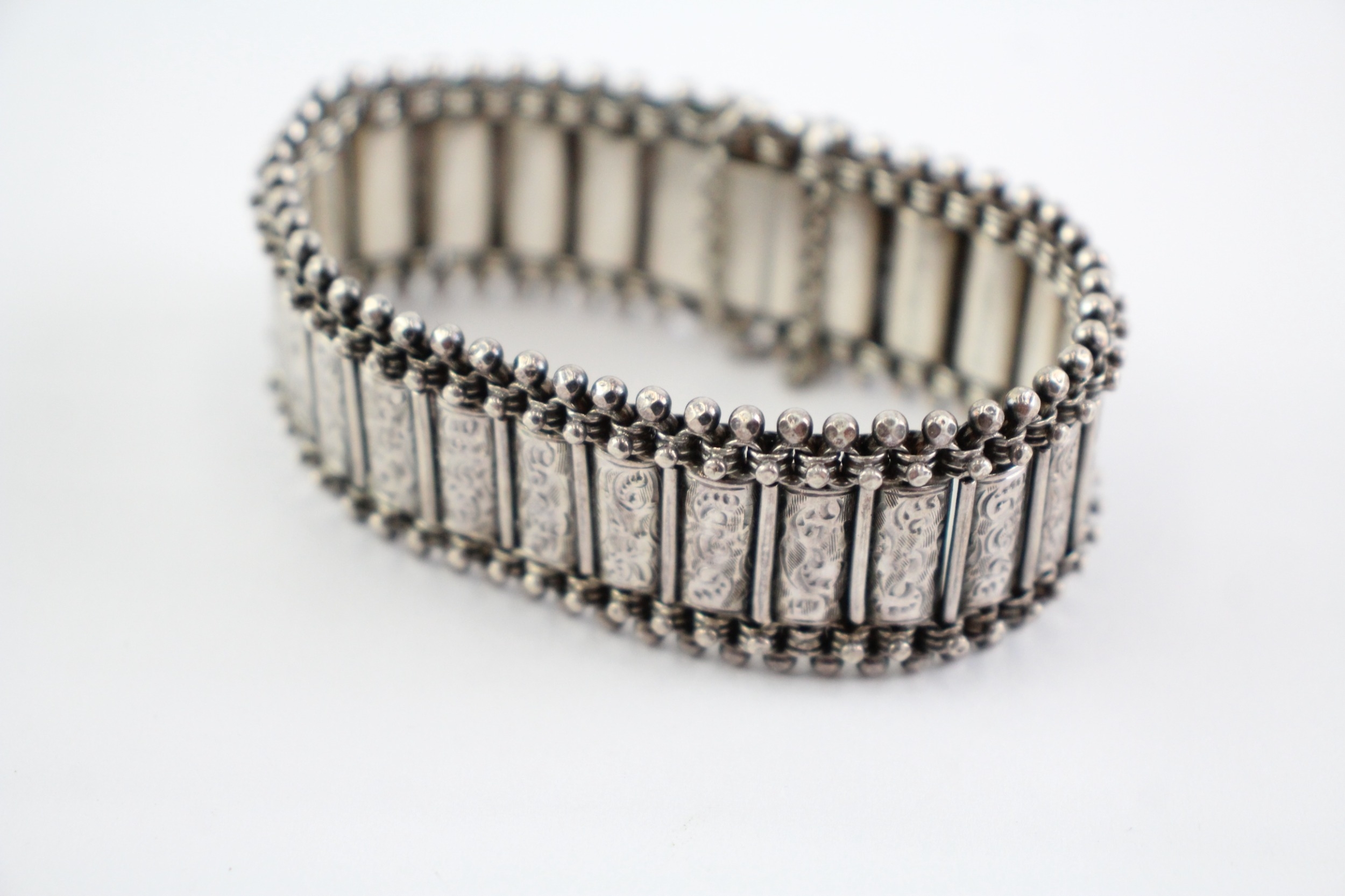 Sterling Silver Antique Bracelet, w/ Etched, Safety Chain, Box Clasp (37g)