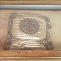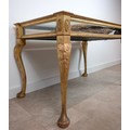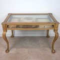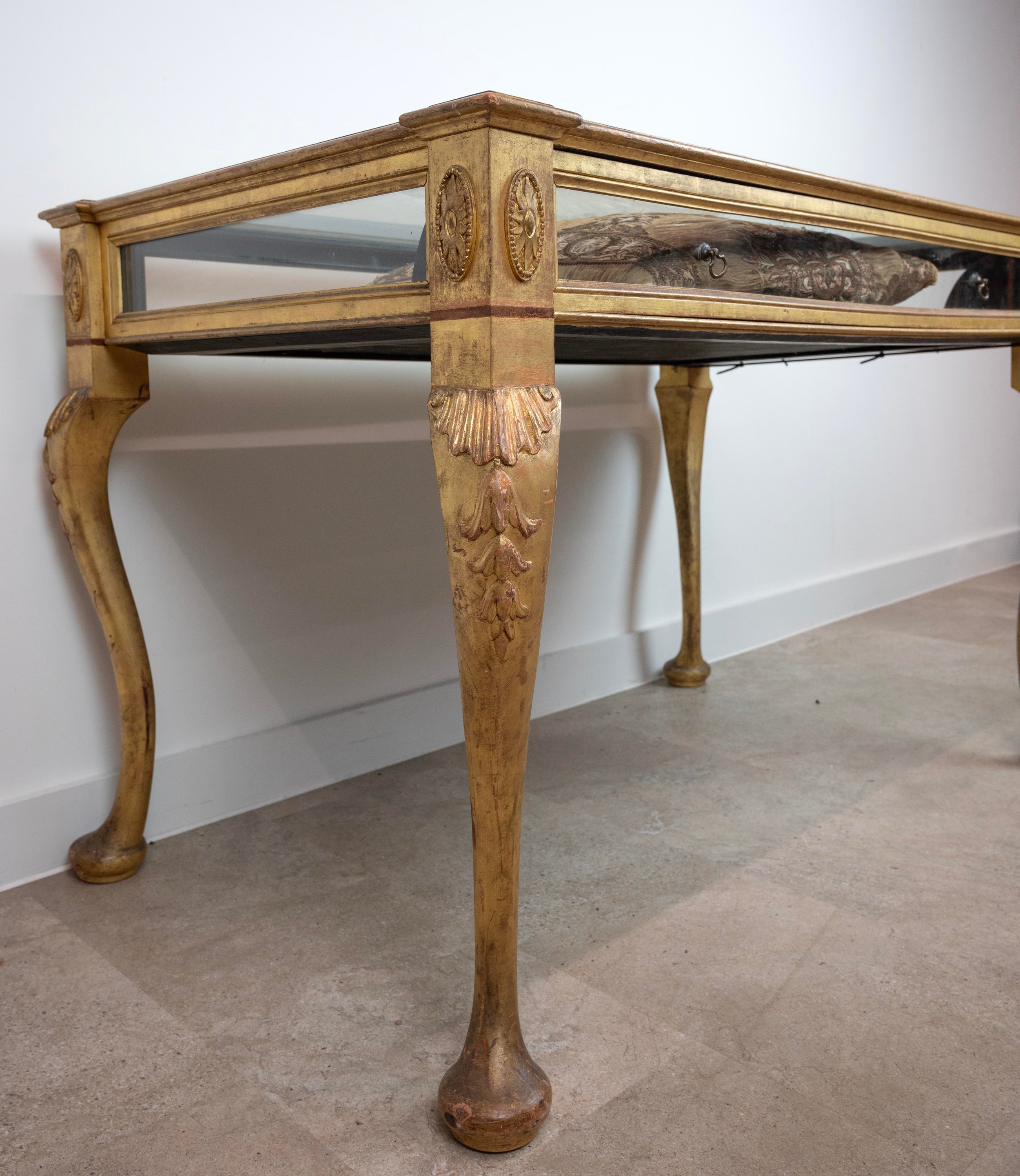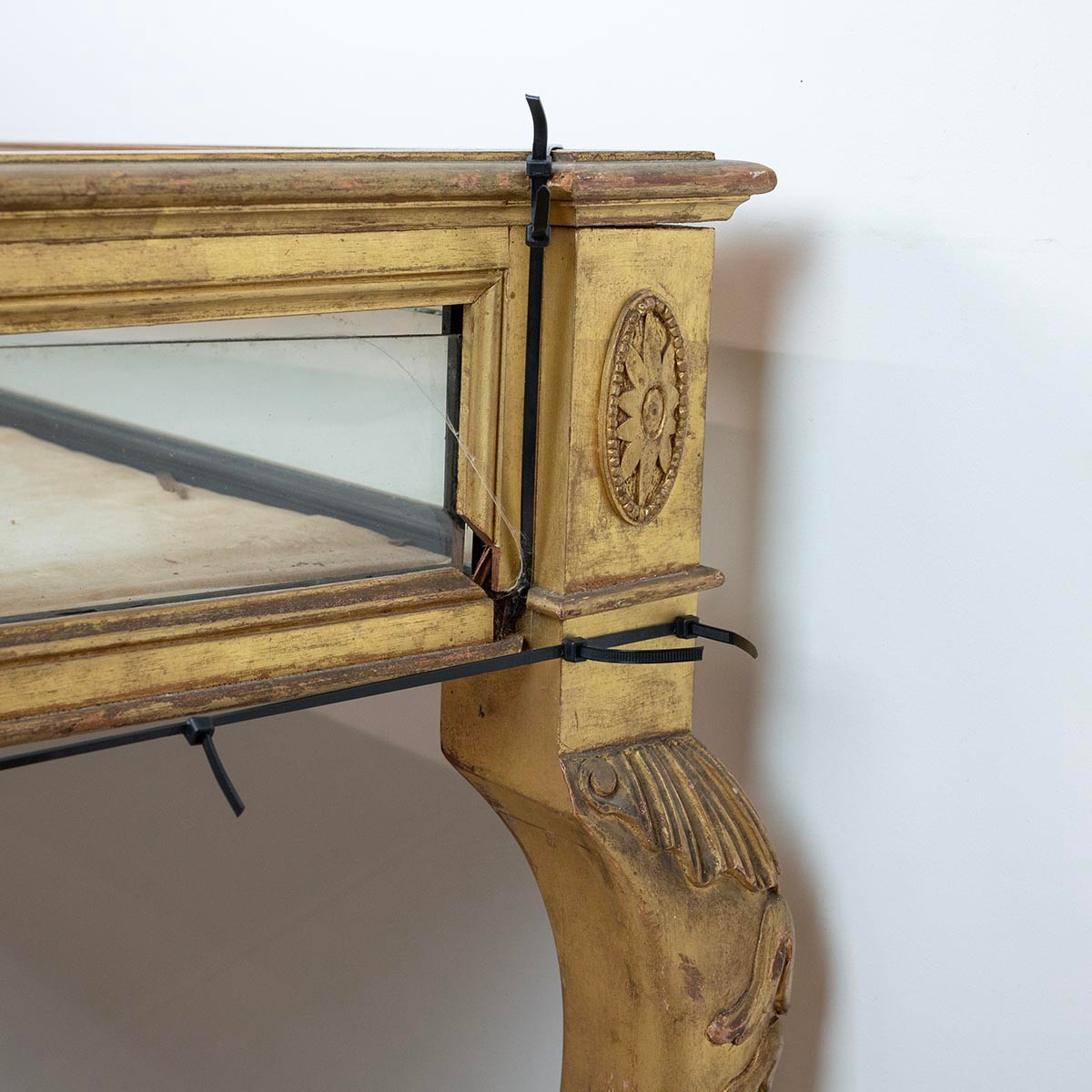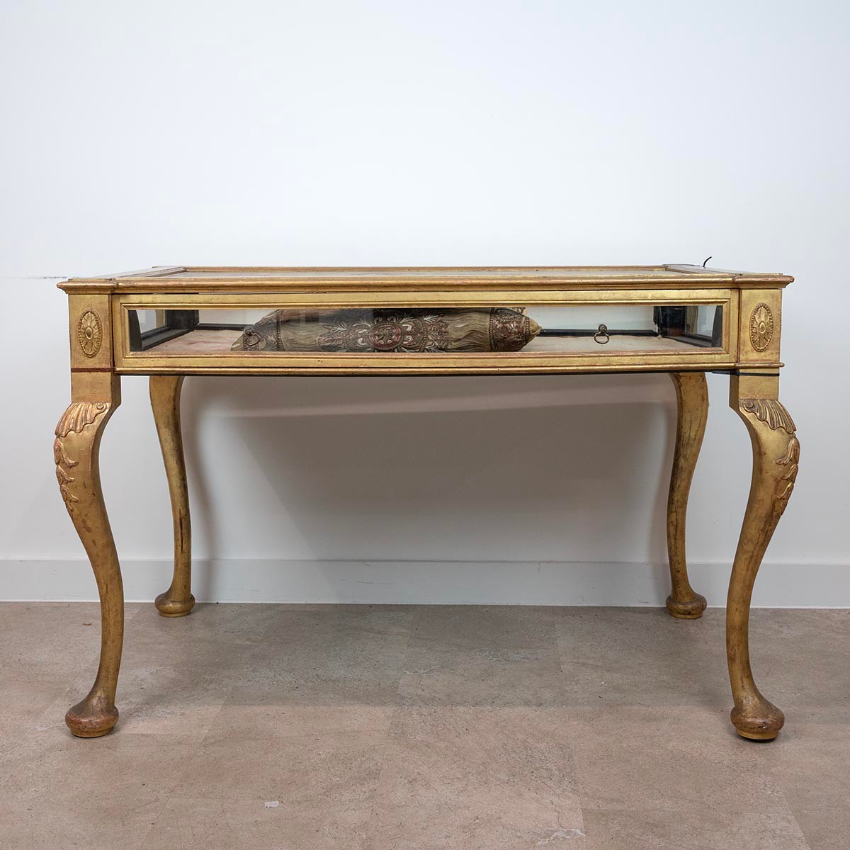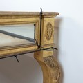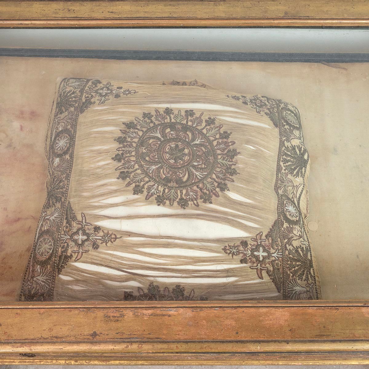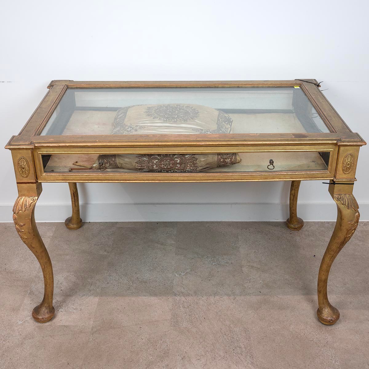 Antique giltwood display cabinet and silk cushion. Cabinet raised on cabriole legs carved with shell and acanthus details, W 120cm, D 72cm, H 77cm. Includes an antique silk cushion profusely decorated.