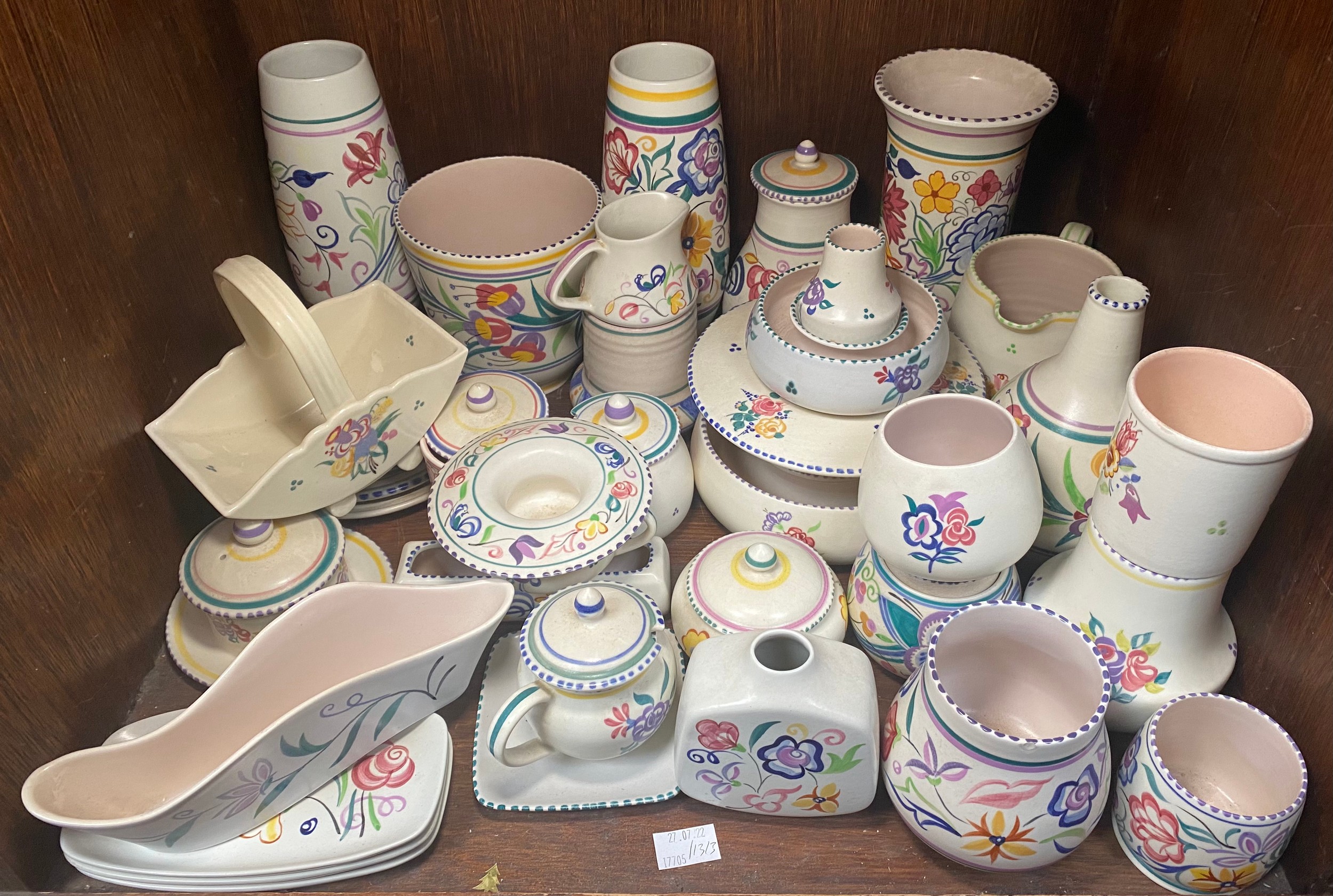 A collection of approximately 35 pieces of Poole Pottery, predominantly CS pattern wares, including vases, bowls, pot and covers, jugs and small dishes etc. (SECTION 36)