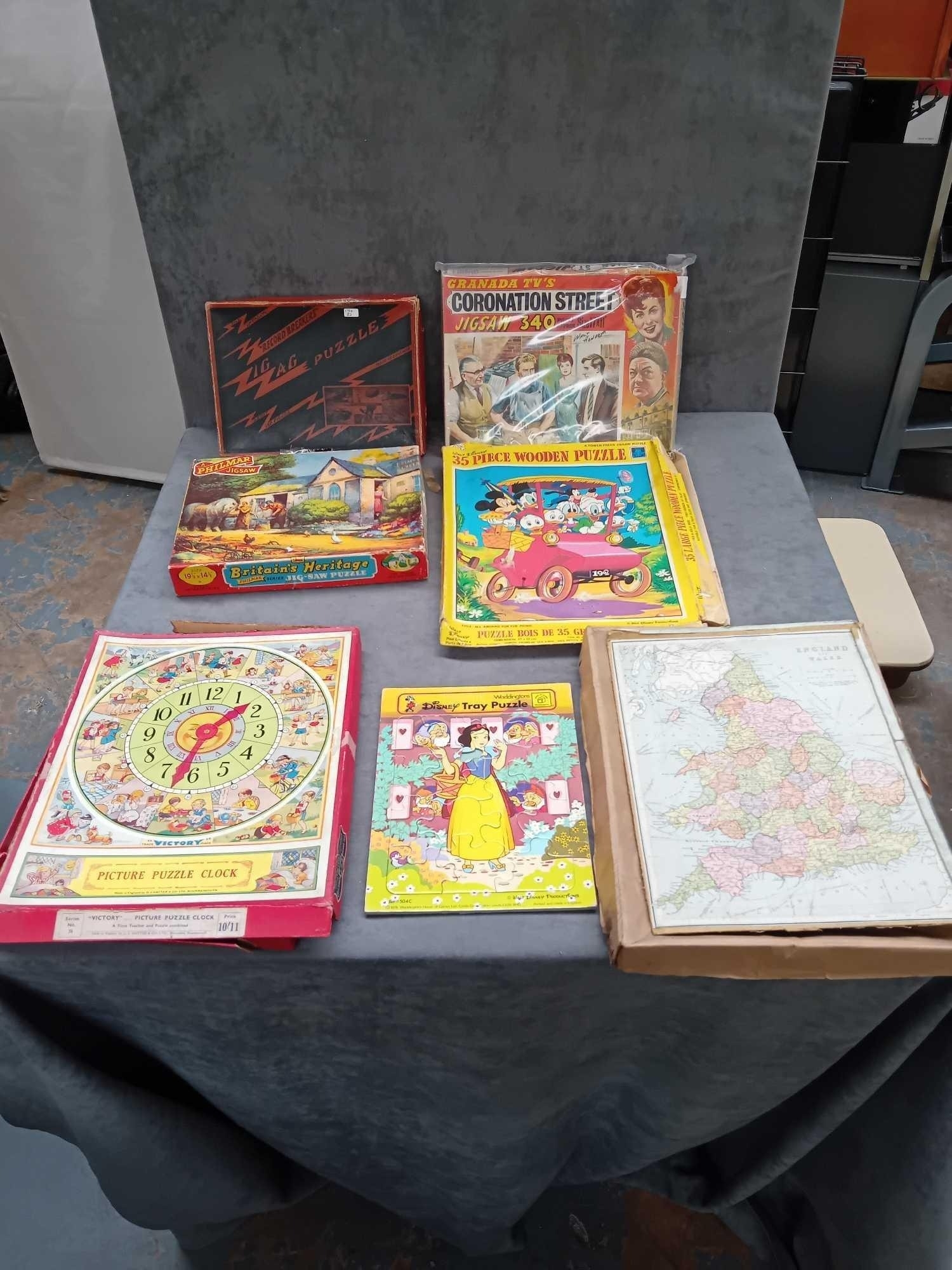 7 x puzzles 1 x zig zag puzzle record breakers 1 x Granada tvs Coronation street 1 x Britain's heritage 2 x Disney 1 x picture clock puzzle 1 x map of England puzzle