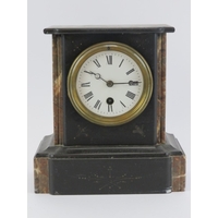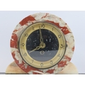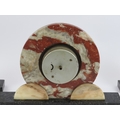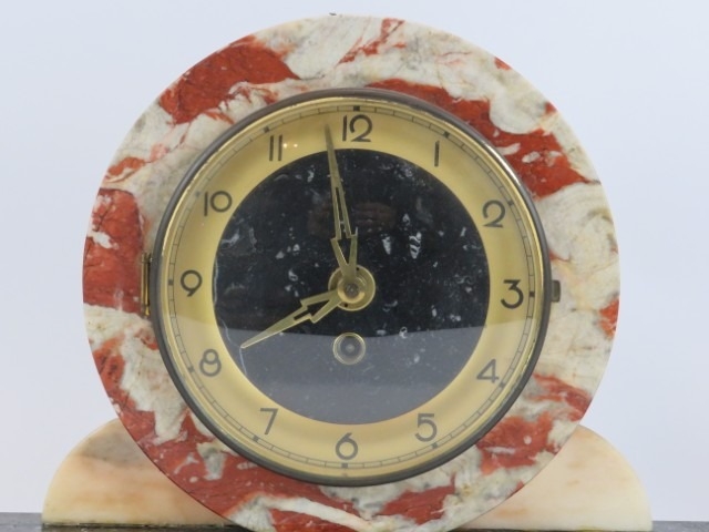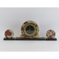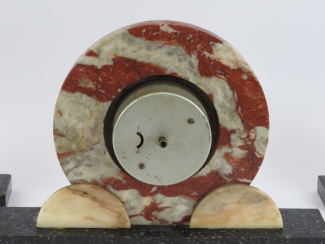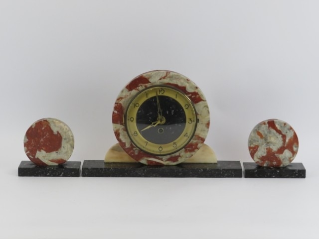 An Art Deco marble clock garniture. (3 items) Clock: 34.9 cm width, 23.2 cm height.