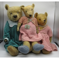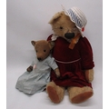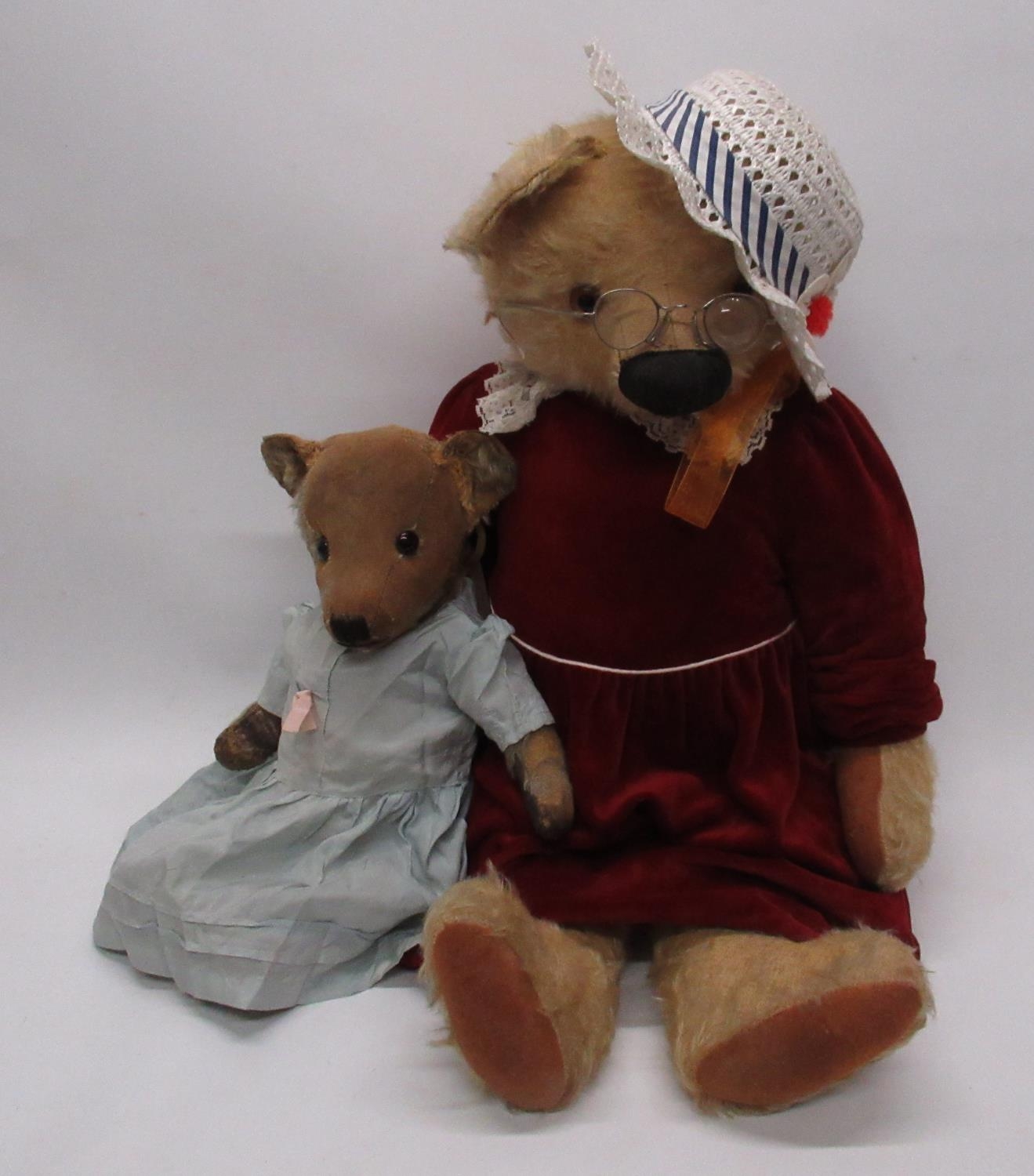 Circa 1930's large English teddy bear, possibly Chad Valley or Merrythought, with glass eyes, stitched nose and mouth and jointed arms and legs, wearing red velvet dress, white collar and white hat, H76cm, and c. 1940's English teddy bear possibly Deans, with glass eyes, jointed arms and legs and rexine pads, wearing blue dress, H43cm (2)