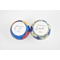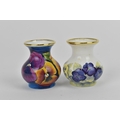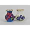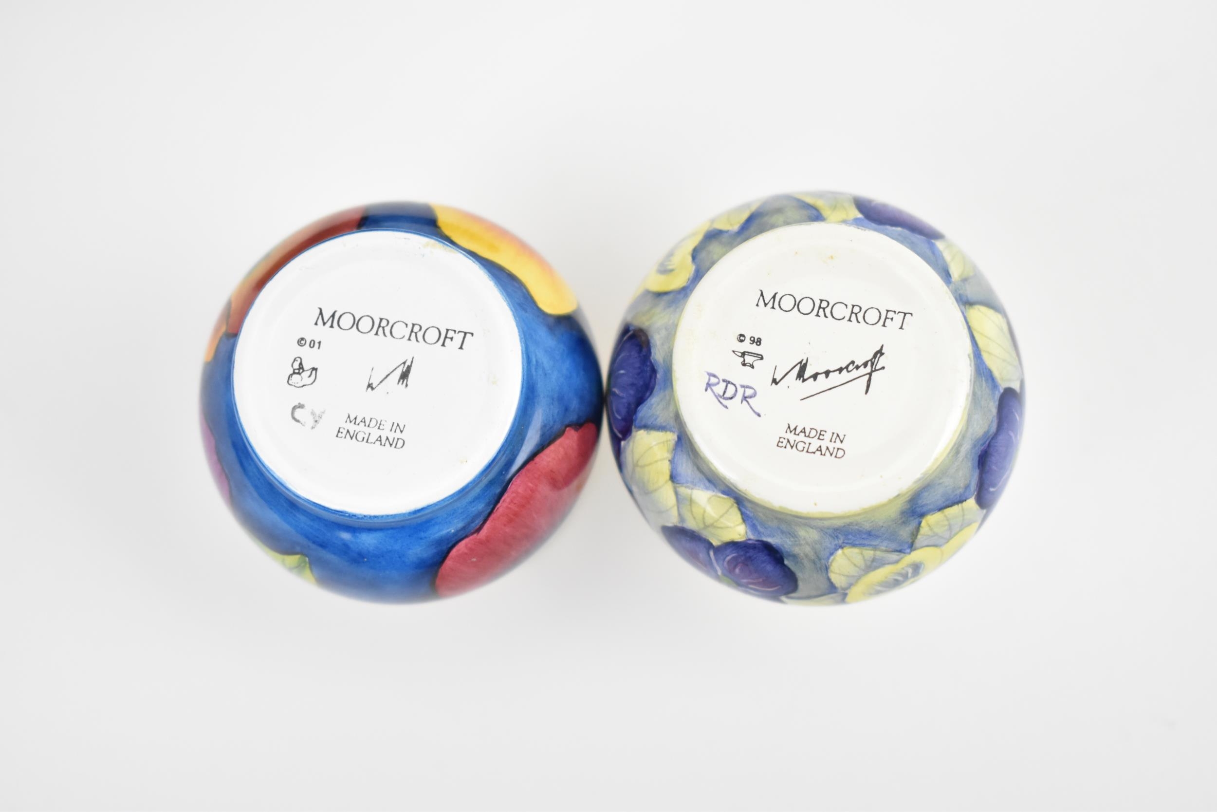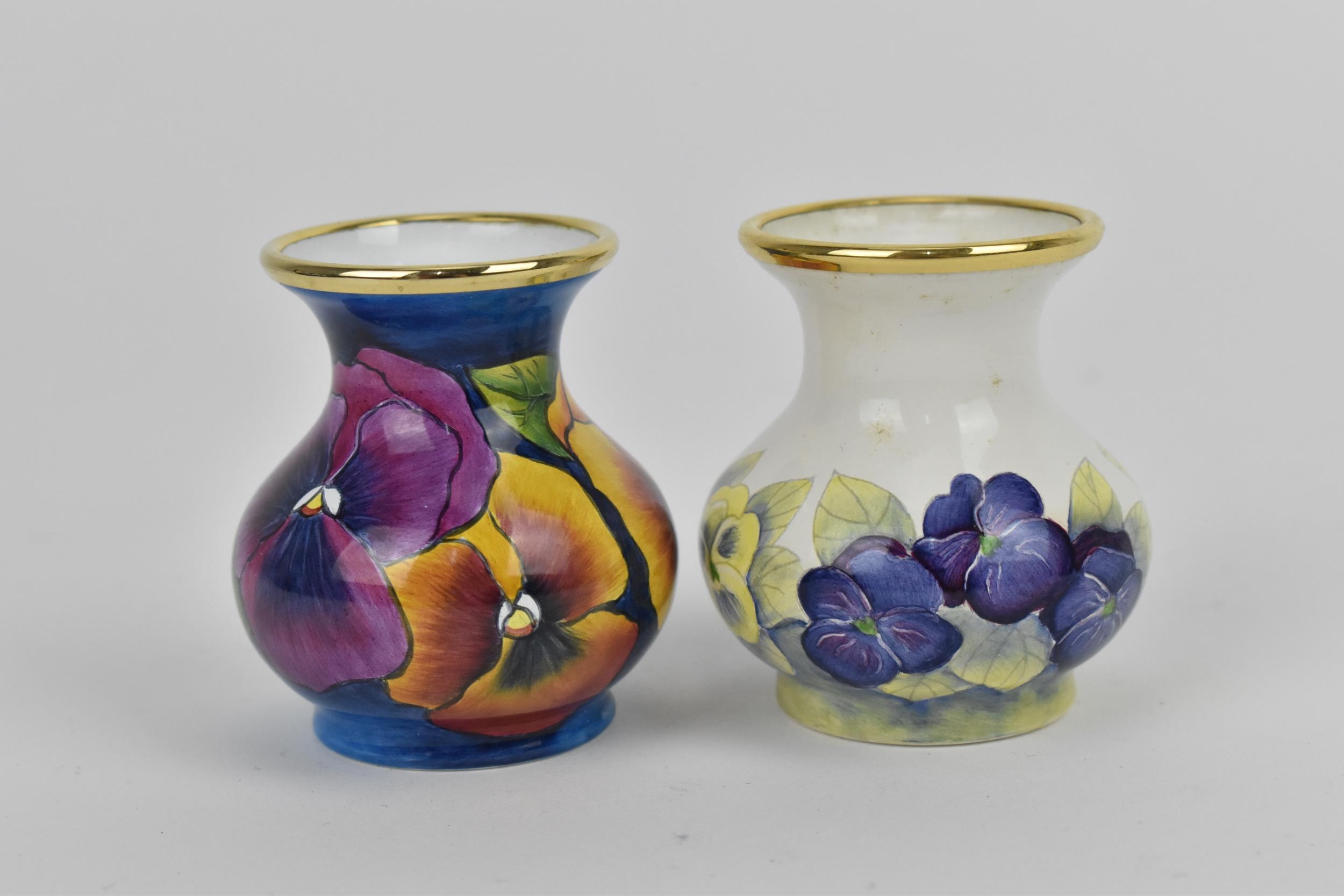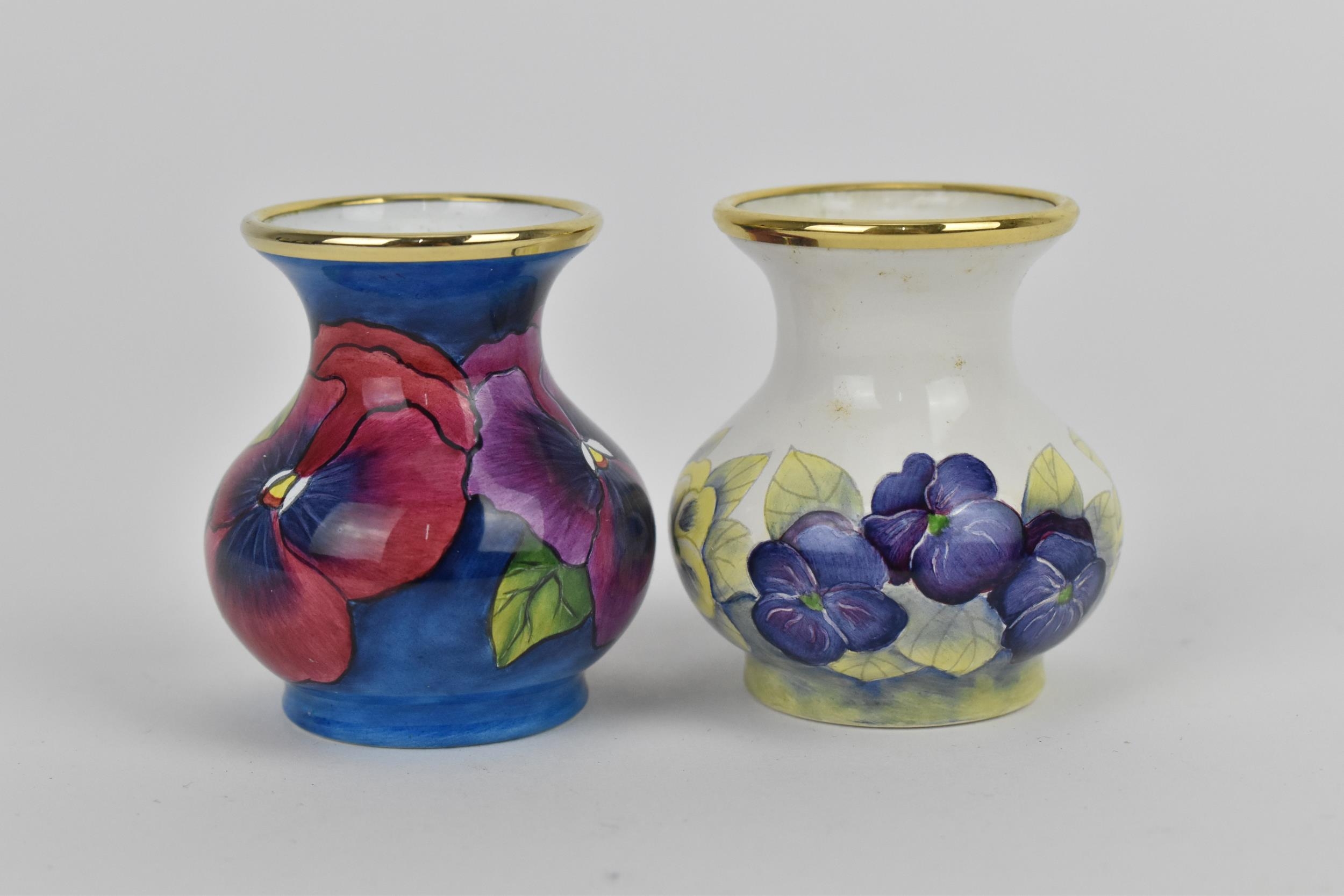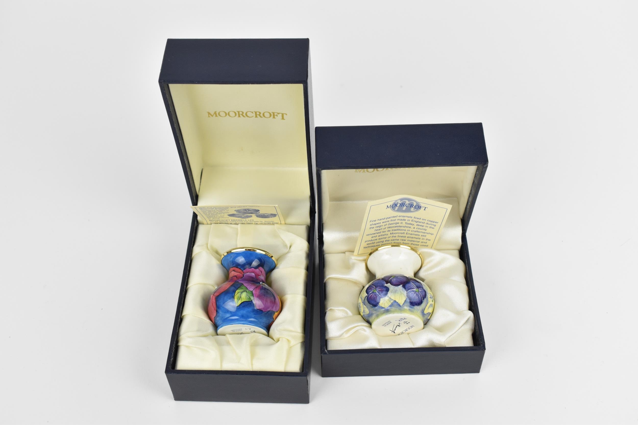 Two Moorcroft Enamels Ltd miniature vases, both of baluster form with painted pansies, the blue ground one painted by Carol Yarnold, the other by Rachel Douglas Ryder, each in a fitted box, both 5 cm high