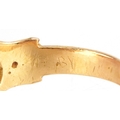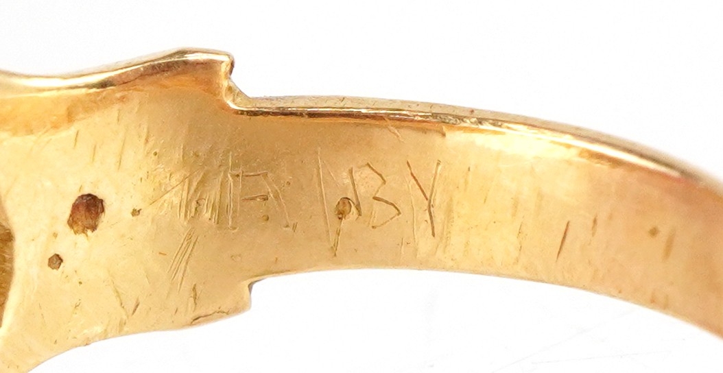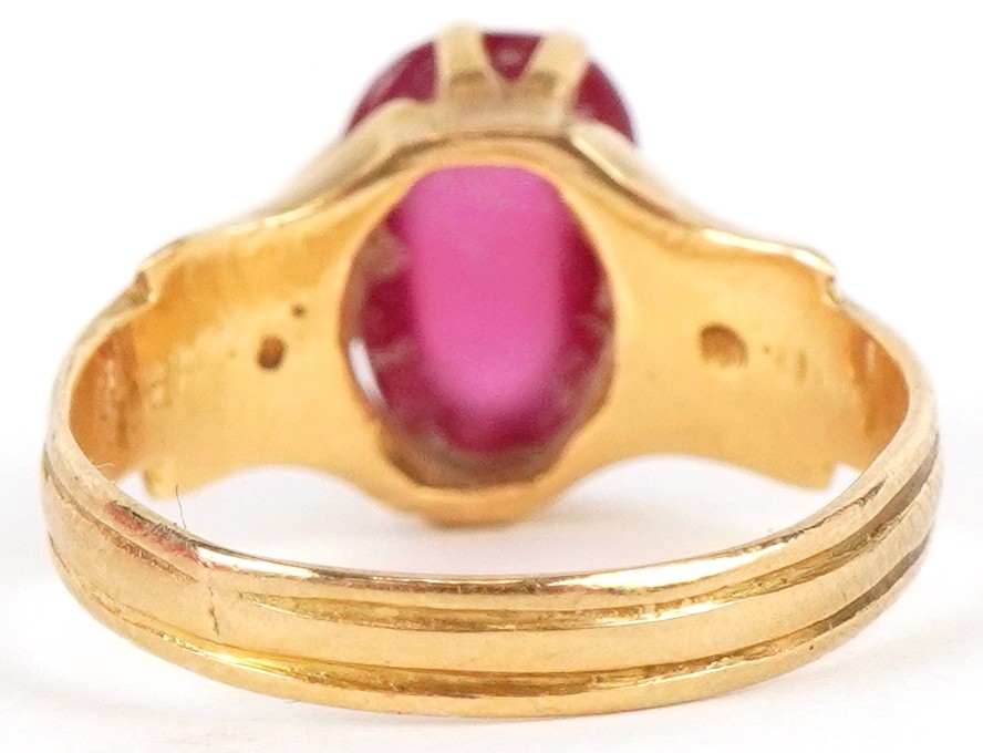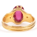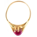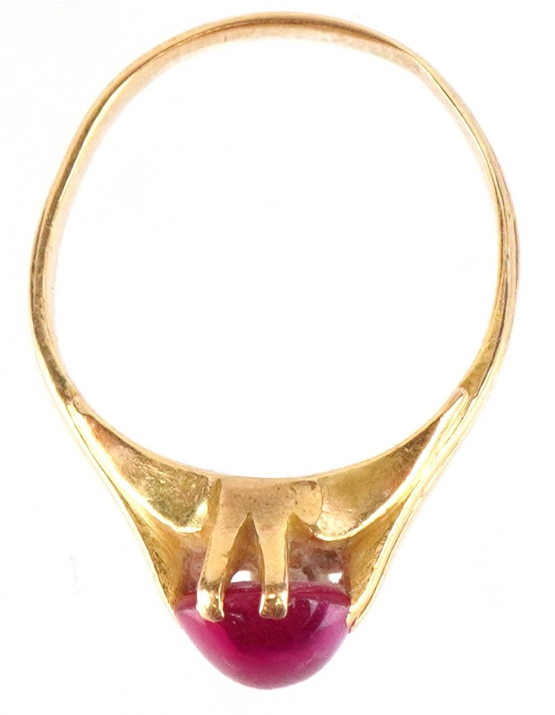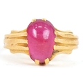 An unmarked high carat gold cabochon ruby ring, the ruby approximately 9.40mm x 6.0mm x 3.60mm deep, size J, 3.8g.