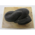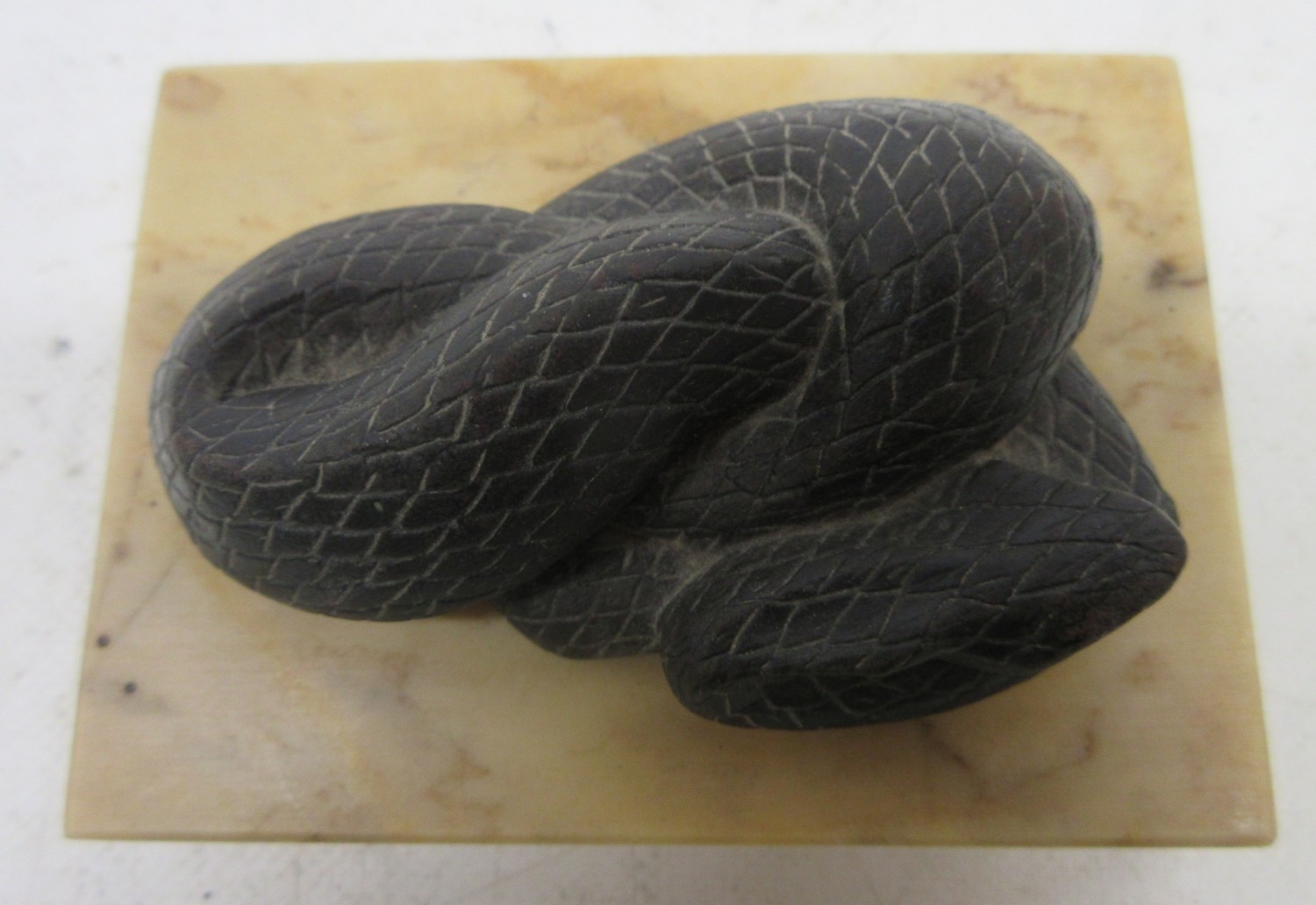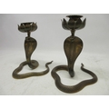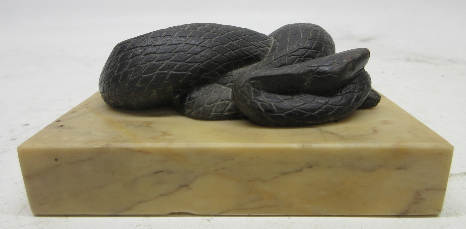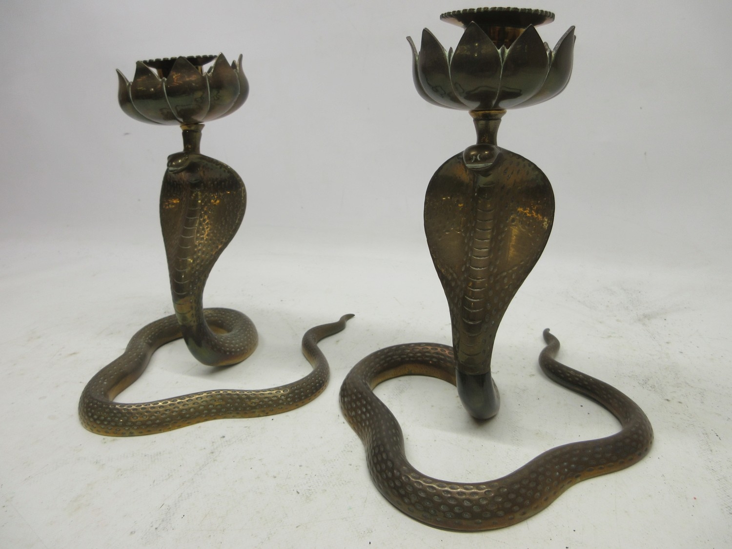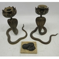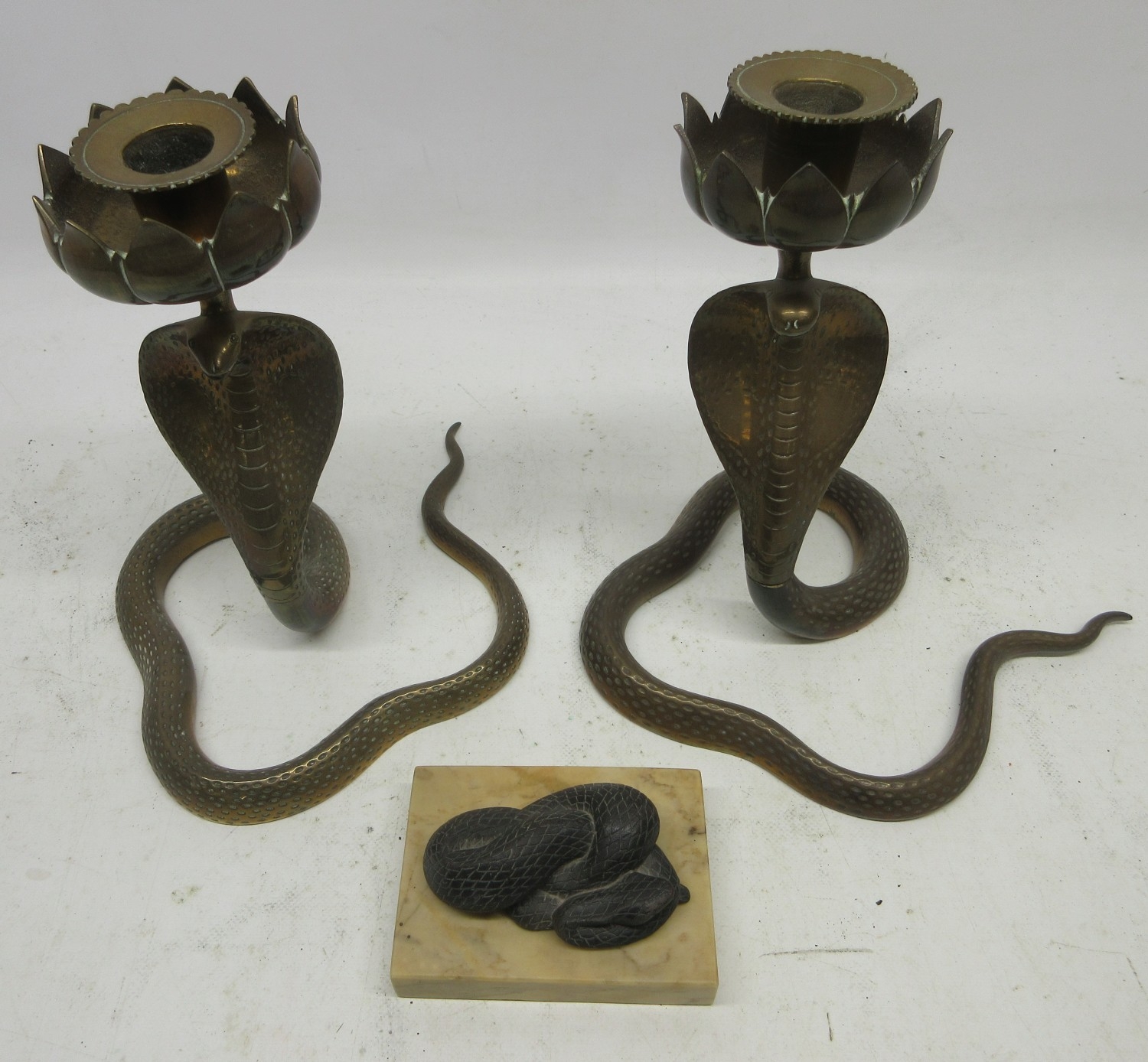 Selection of home-décor items including Victorian paperweight with coiled serpent metal motif mounted on a Siena marble plinth and a pair of cobra snake candlesticks with floral drip catchers; approx. H8.5" x D/W7", (compatible with standard-size candles), etc. Qty. 3
