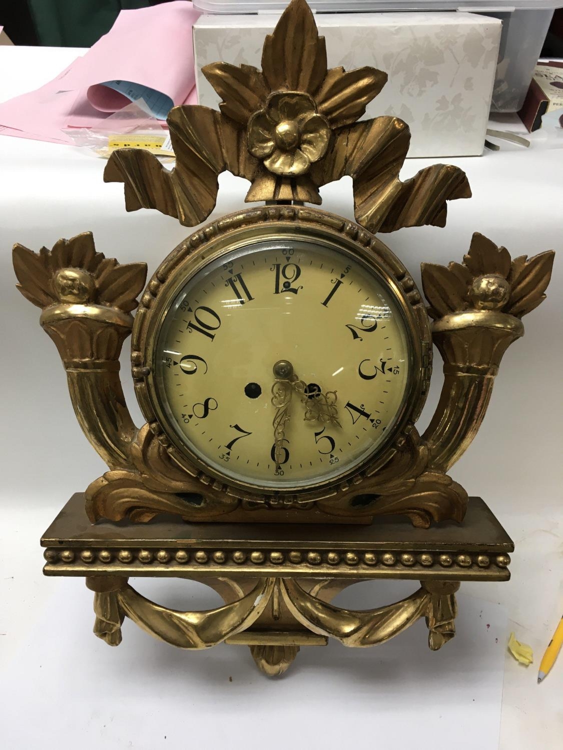 A wooden gilt wall clock.
