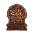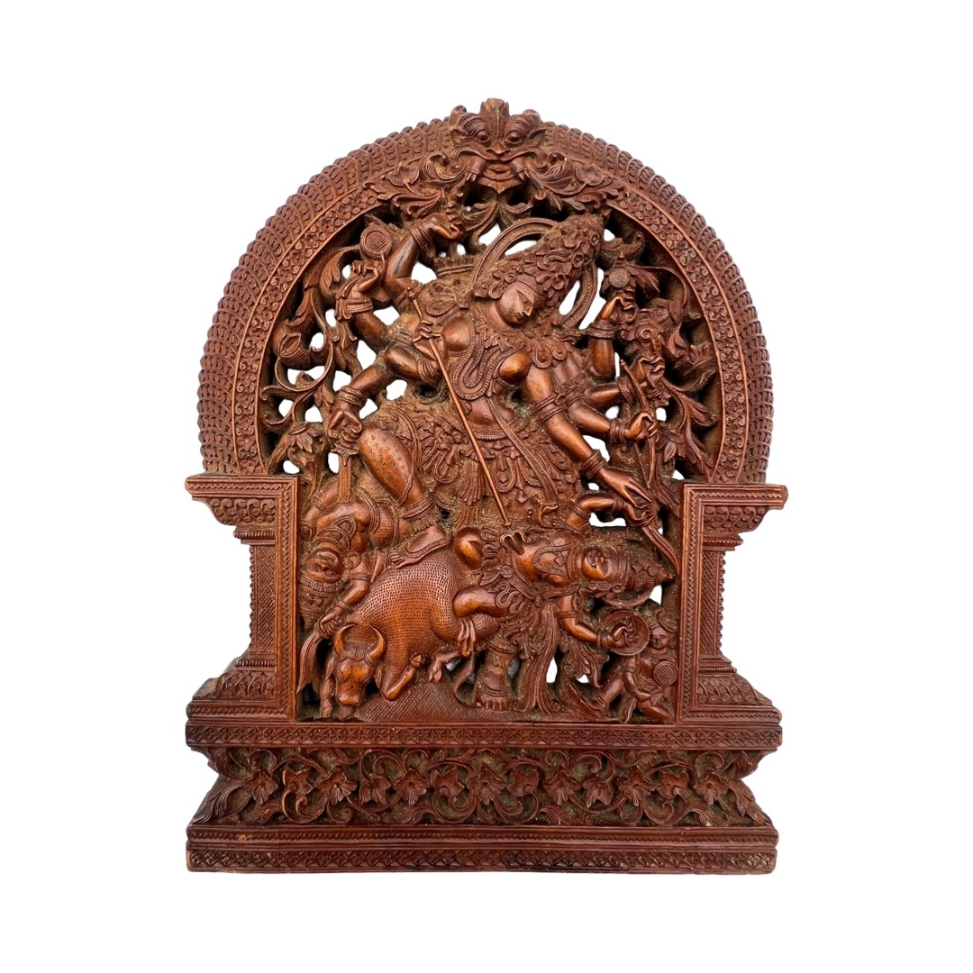 This pair of high-relief carved wood panels is characteristic of South Indian craftsmanship, likely from the Mysore region of Karnataka or Tamil Nadu, dating to the late 19th or early 20th century. The panels are carved from a dense, reddish-brown hardwood, consistent with the appearance and grain of sandalwood. Each panel features a central figure within a pierced, arched frame known as a prabhavali, which is topped with a kirtimukha mask. The left panel depicts the Goddess Durga as Mahishasuramardini, the slayer of the buffalo demon. She is shown with multiple arms wielding various weapons, including a trident being thrust into the back of the buffalo, Mahishasura, from whose neck a human figure emerges. The right panel depicts a crowned figure on horseback, possibly the deity Revanta or the local guardian Aiyanar, carrying a bow and arrow. Below the horse are three attendants, including a drummer and a figure holding a fly-whisk. Both panels are set upon stepped rectangular bases featuring carved floral and foliate patterns. No maker marks or signatures are present on the bases or bodies of the items.