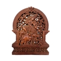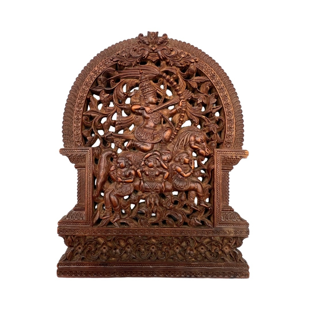 A PAIR OF SOUTH INDIAN CARVED WOOD PANELS DEPICTING MAHISHASURAMARDINI AND A HEROIC FIGURE ON HORSEBACK
