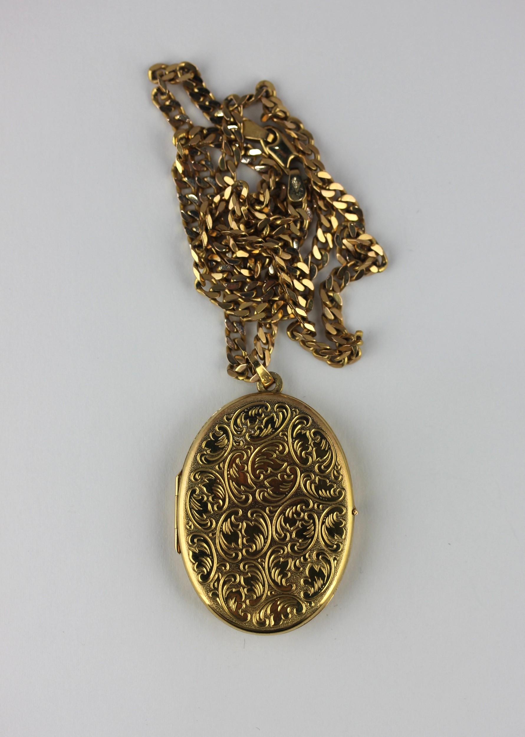 A 9ct gold oval pendant locket with scroll engraved decoration with a 9ct gold faceted curb link neck chain on a sprung hook shaped clasp, gross weight 17.3g