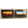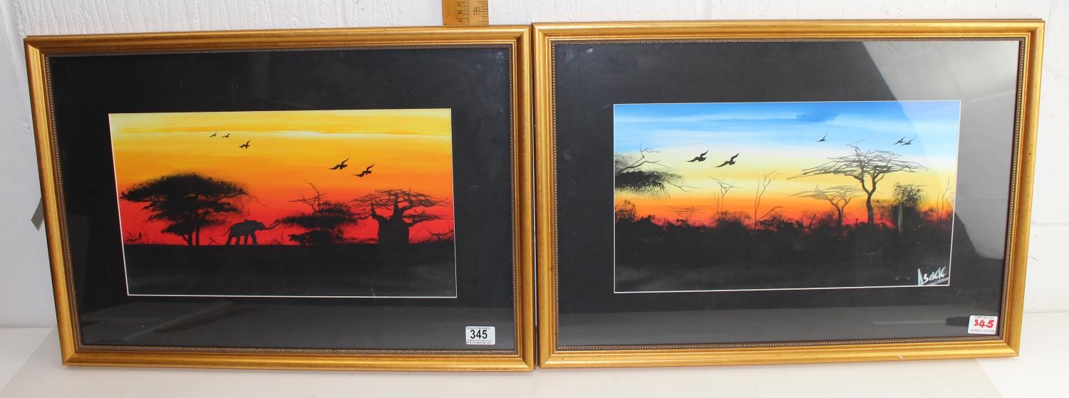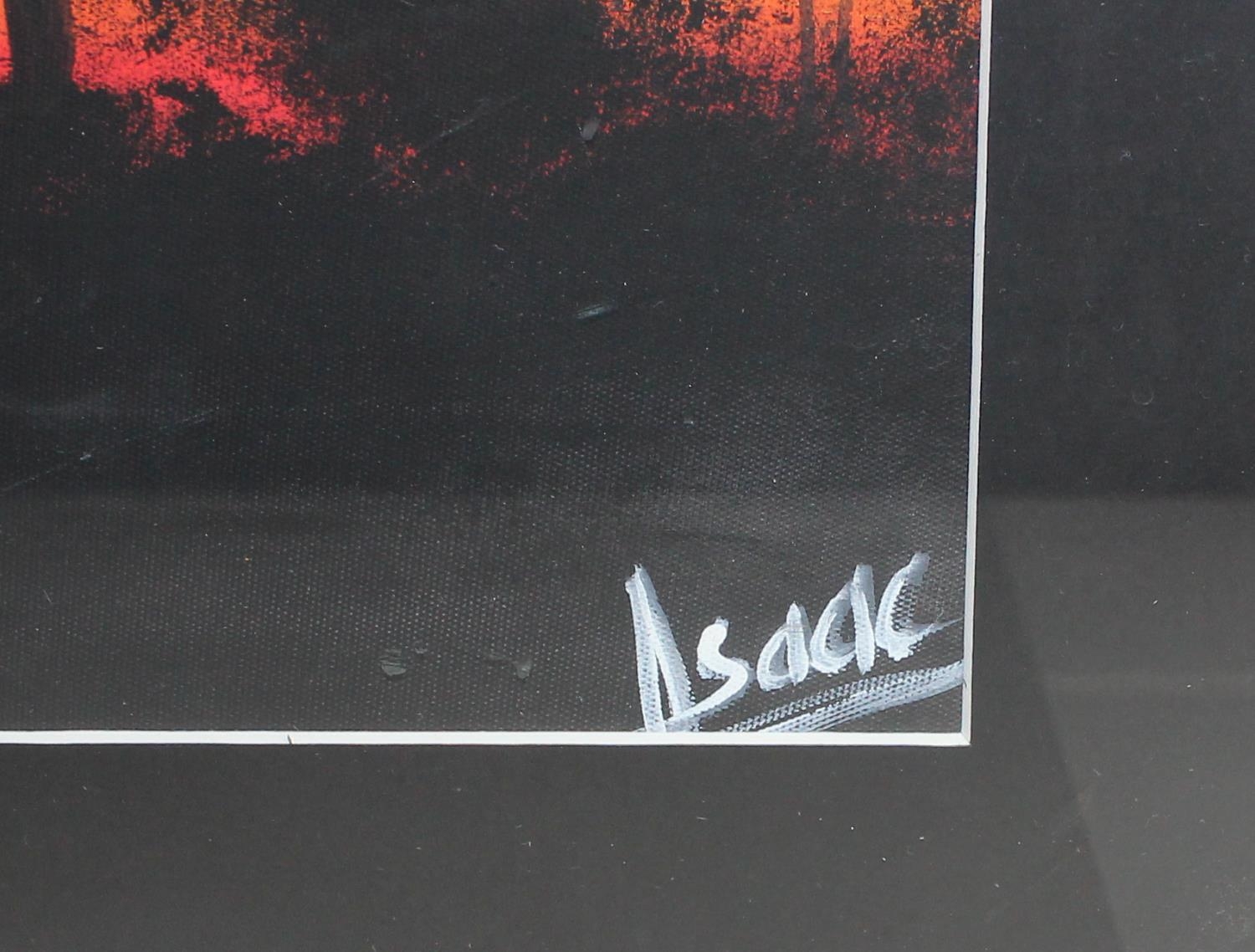 In the manner of Nkonyo Isaac, 2 sunset silhouette oil on canvas paintings, one signed Isaac