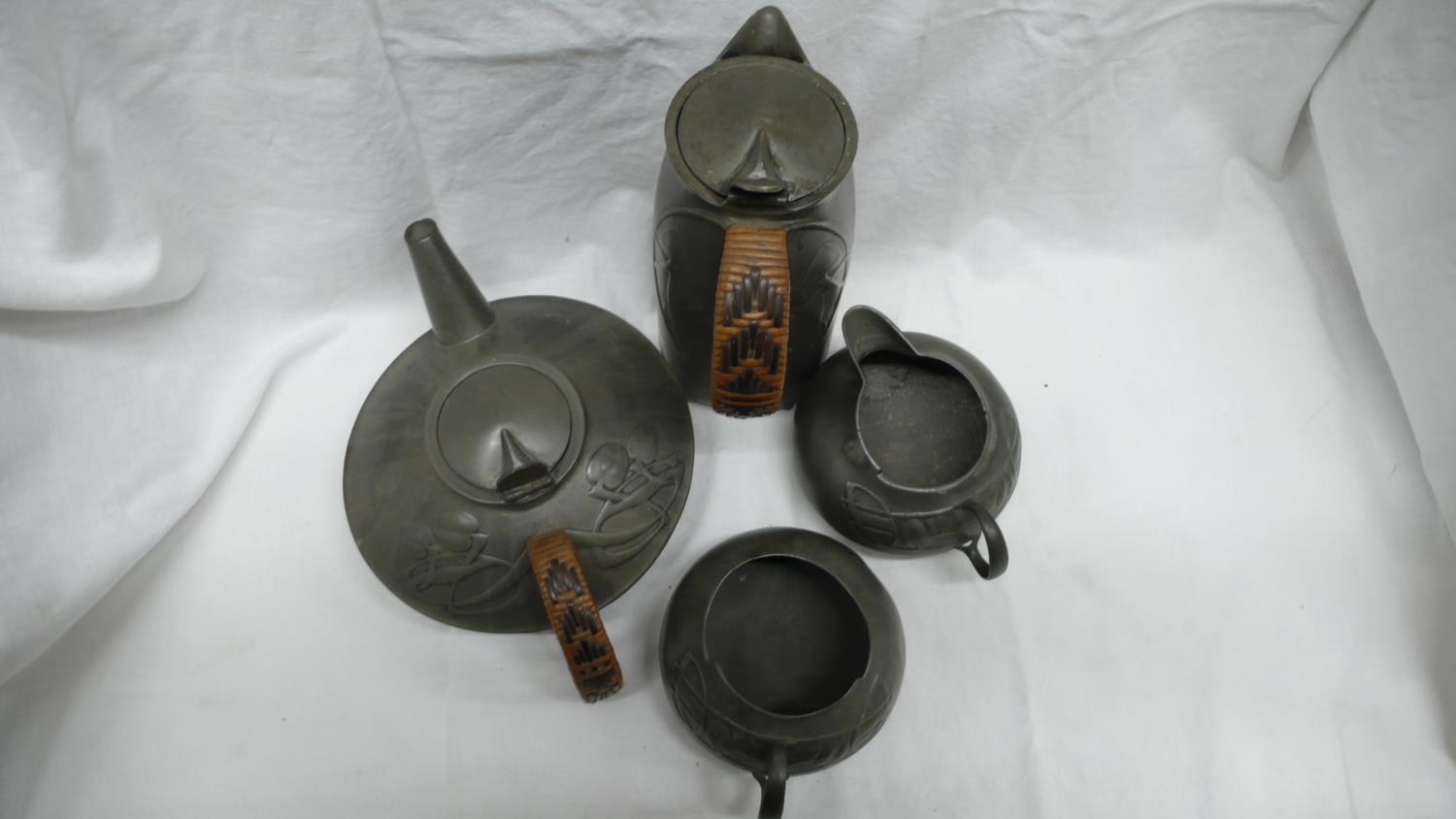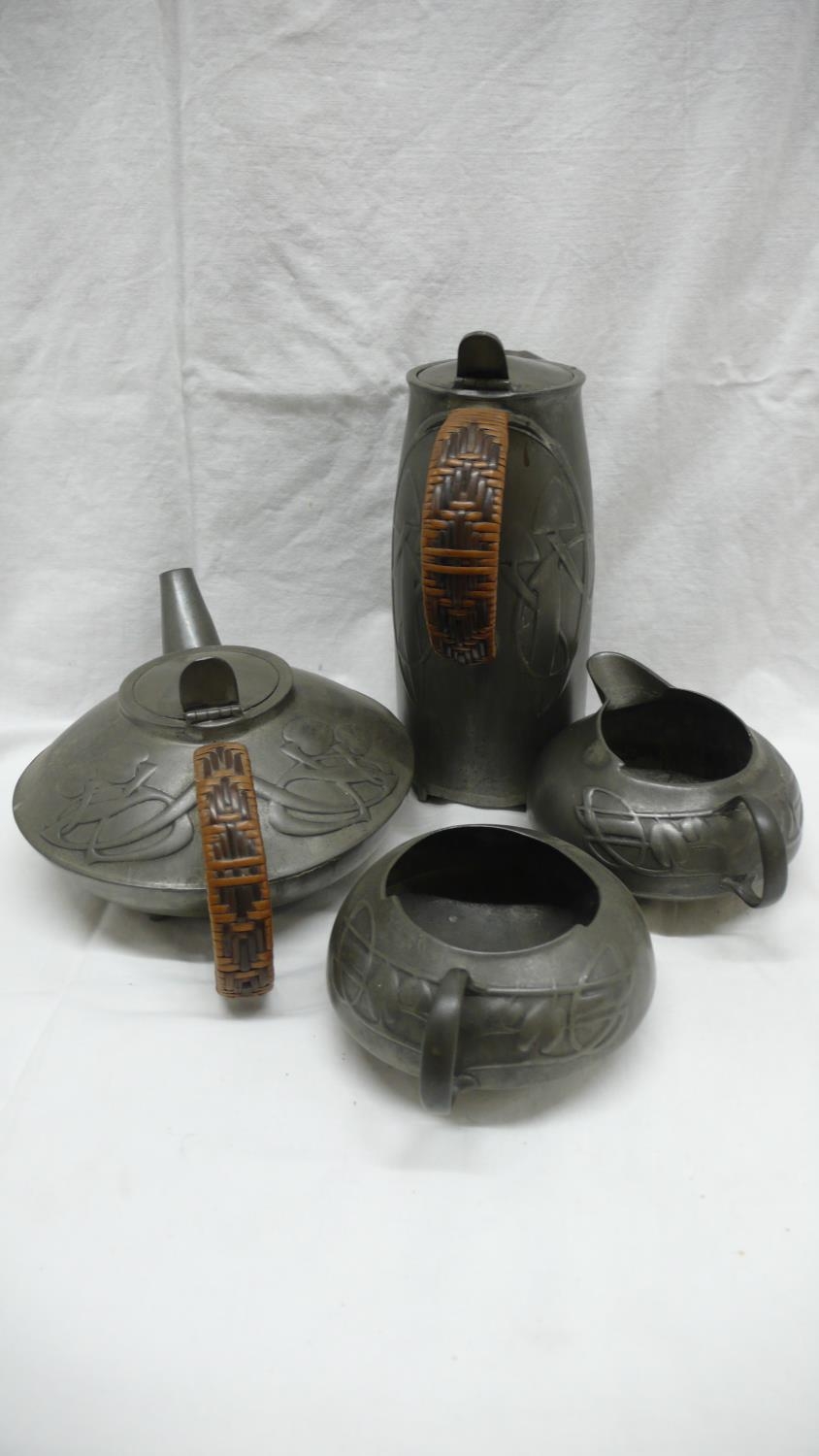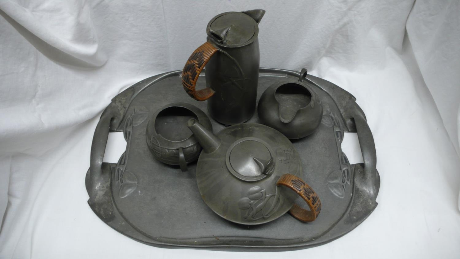 Archibald Knox for Liberty & Co. English Pewter five piece tea service, entwined leaf design, circa 1901, No. 0231, length of tray 48 cms