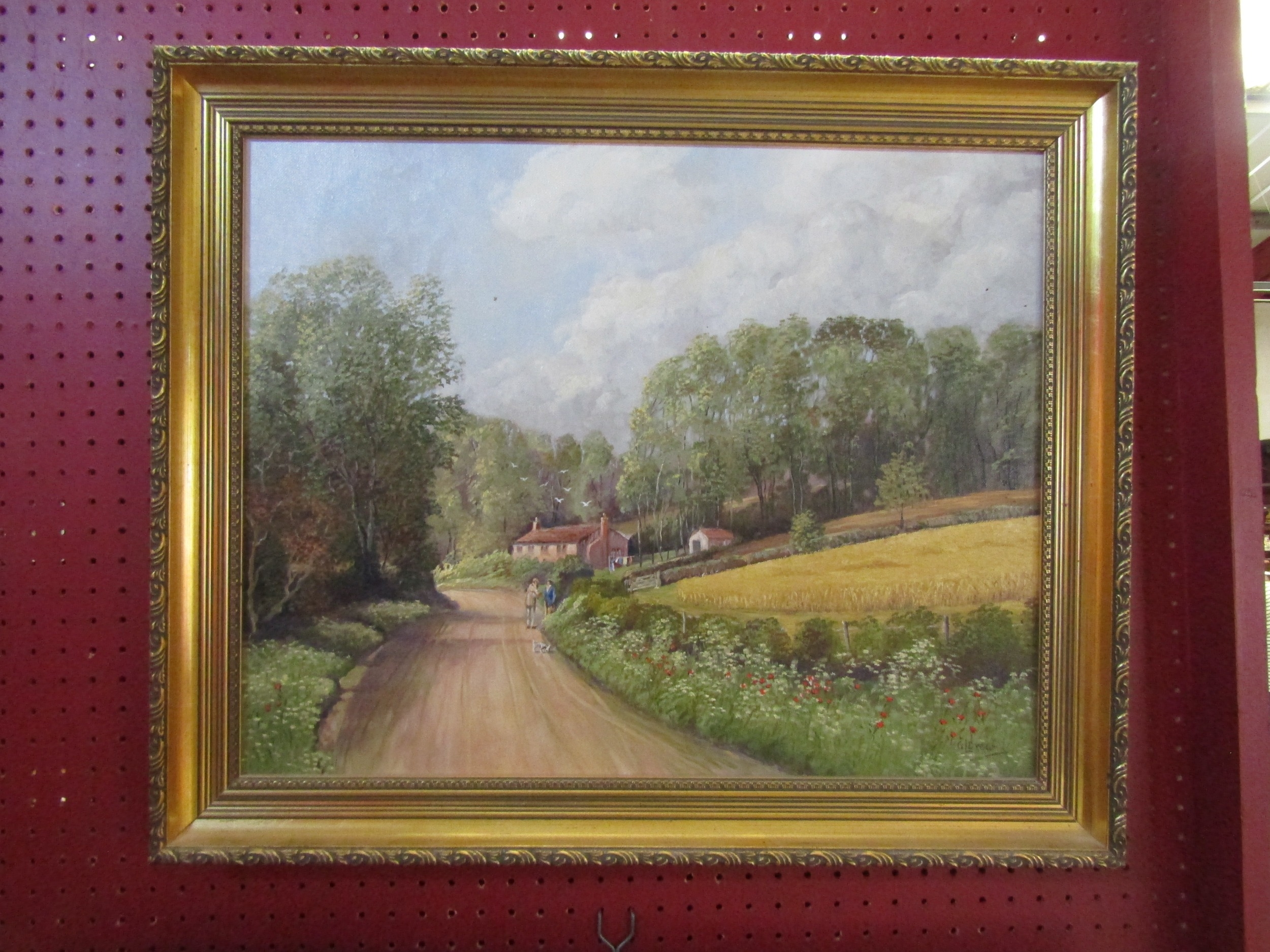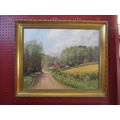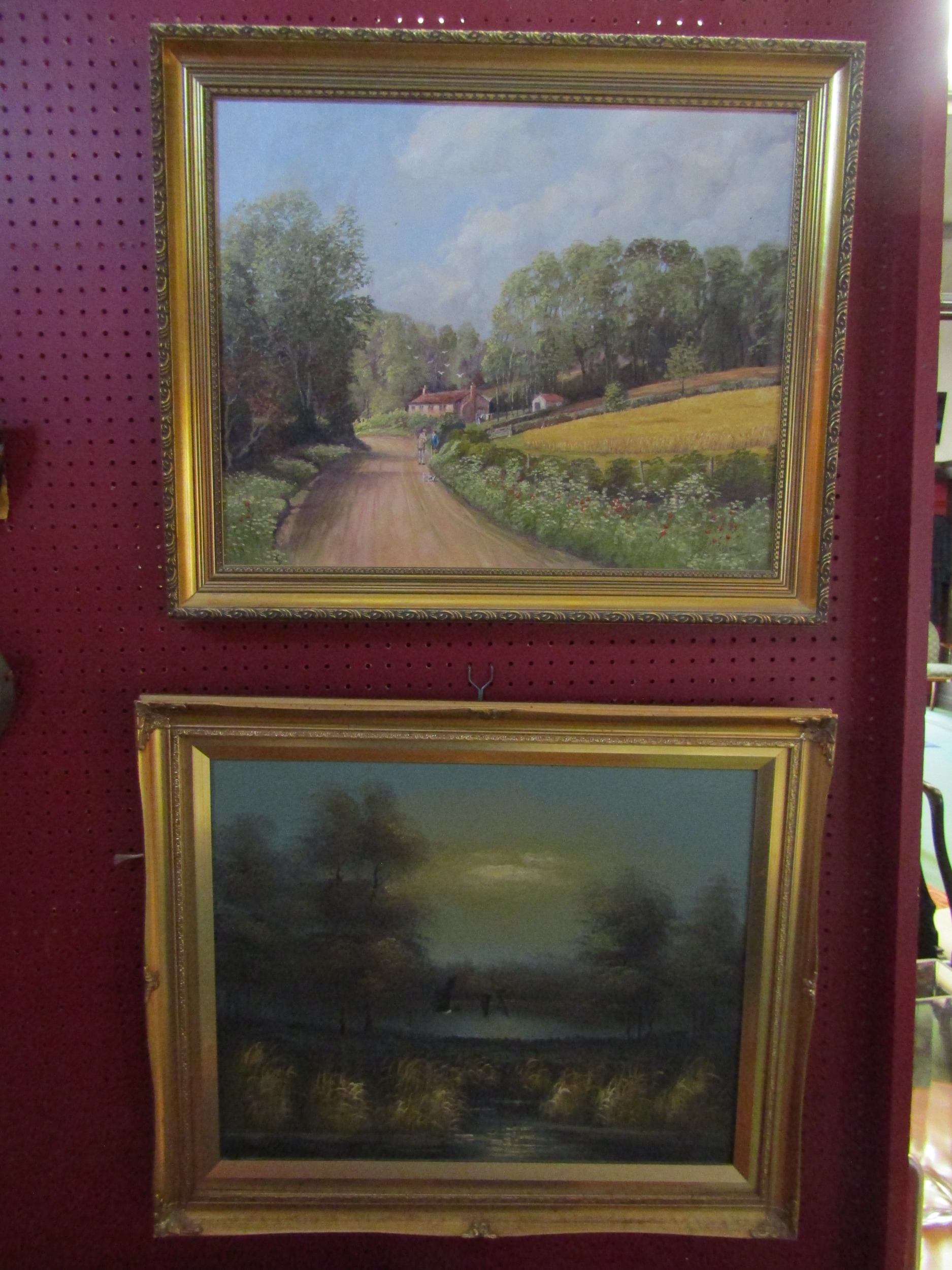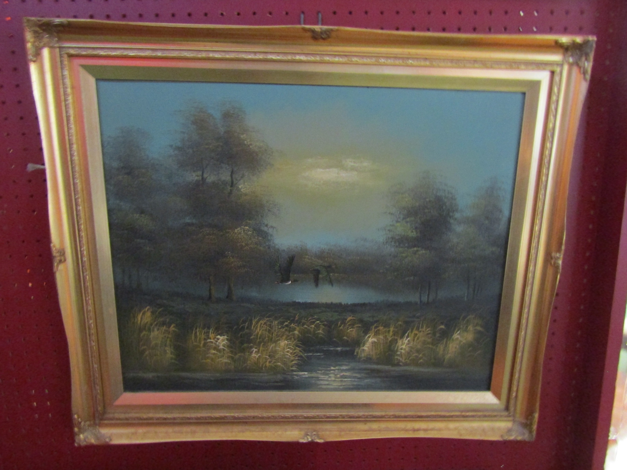 Two oils on canvas paintings, "Passing Clouds" below Shotford Bridge 1982 and "Ducks in Flight", gilt framed, 39cm x 49cm and 40cm x 50cm image sizes