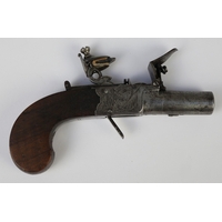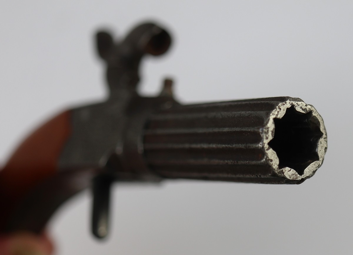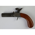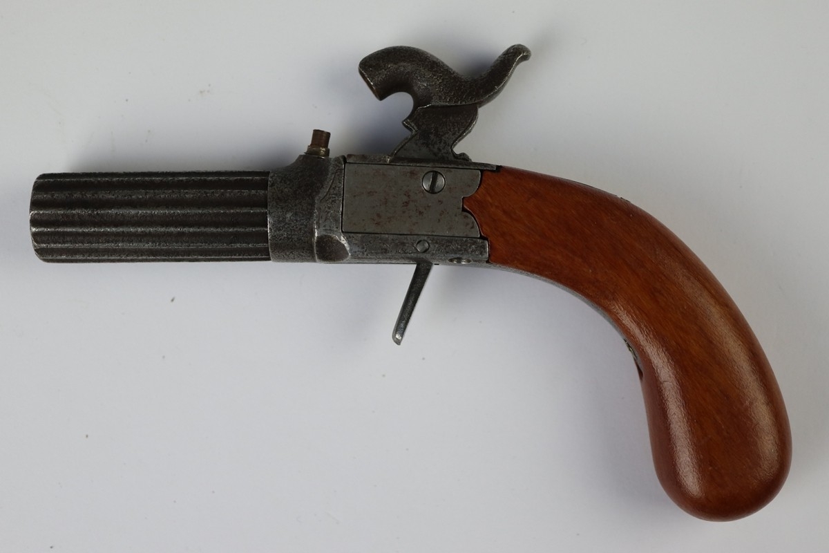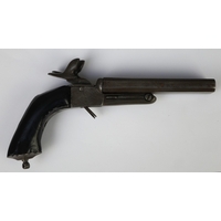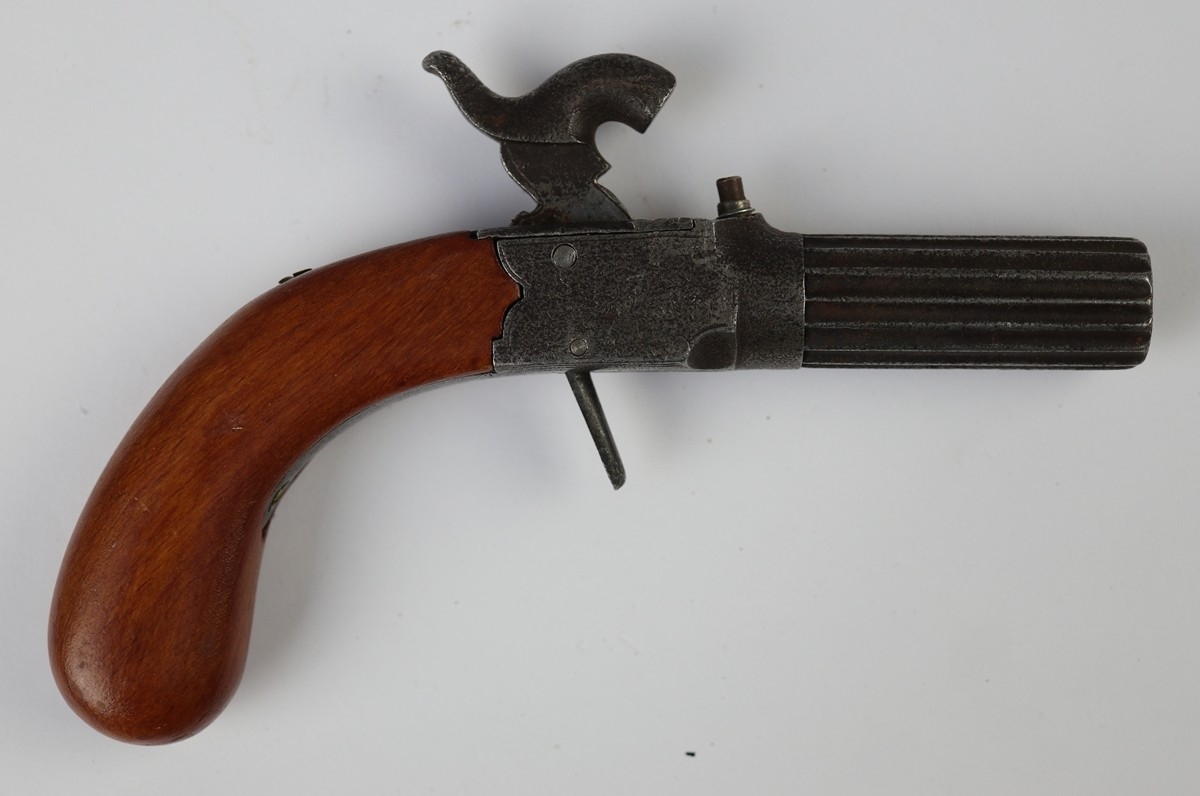 50 Bore percussion pocket pistol, 2" fluted twist-off barrel, clear proof marks under frame & barrel – from 1850’s. Folding trigger, bag shaped walnut grip, centre hammer, boxlock action, in good working order.