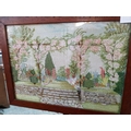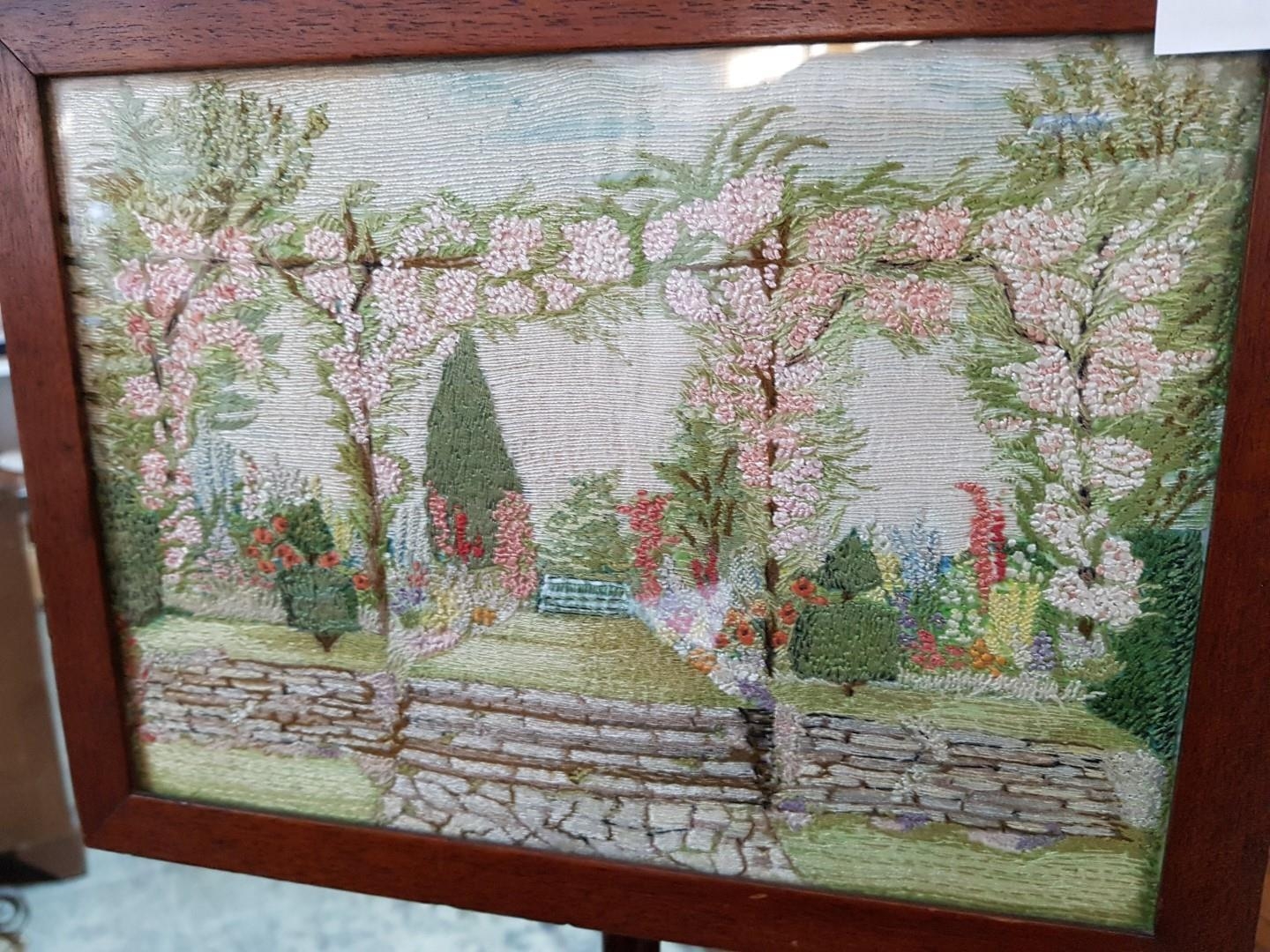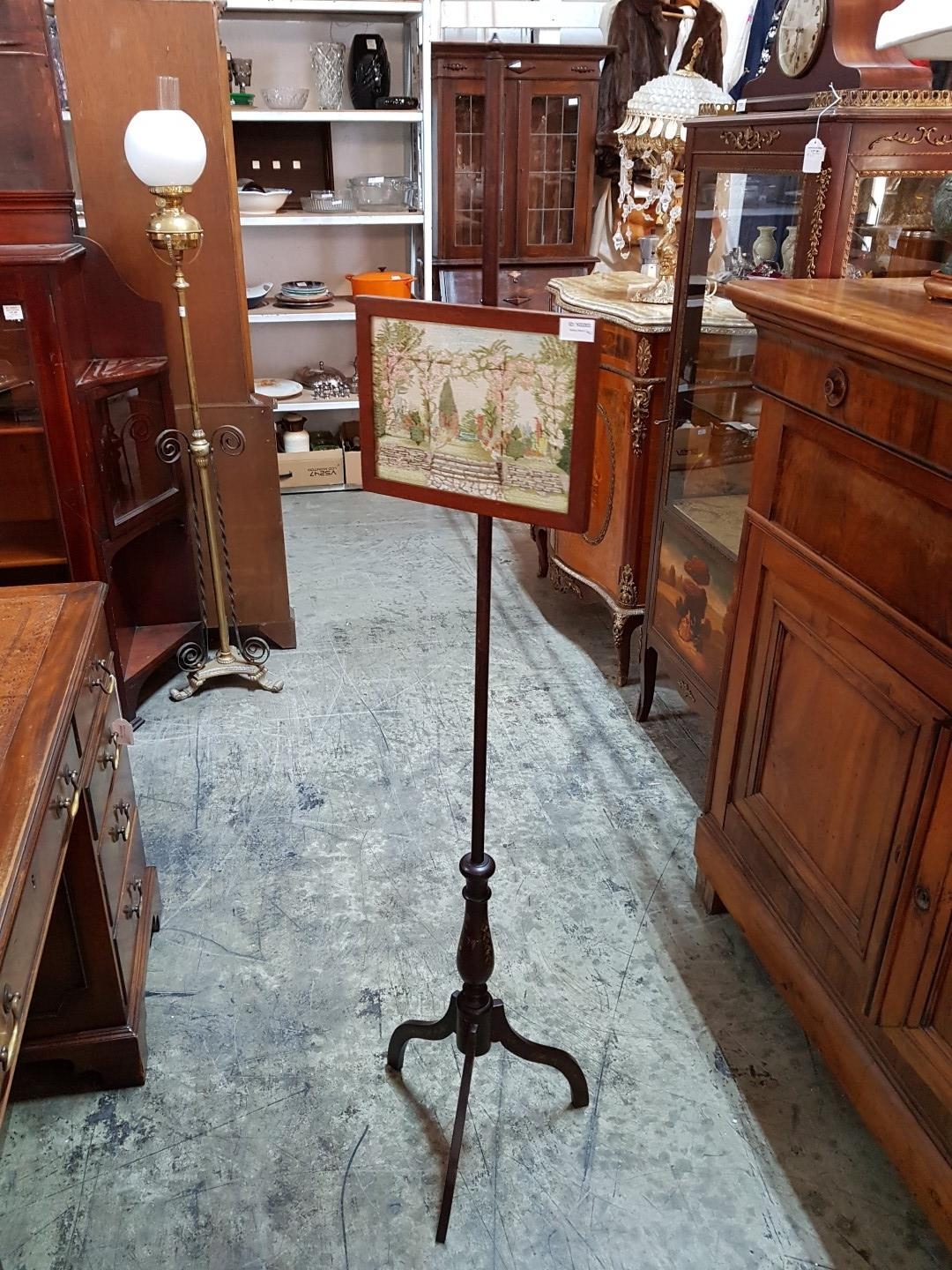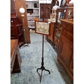 Victorian Fire Screen On Tall Upright with Tripod Base and Embroidered Garden Scene