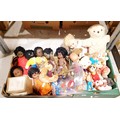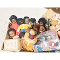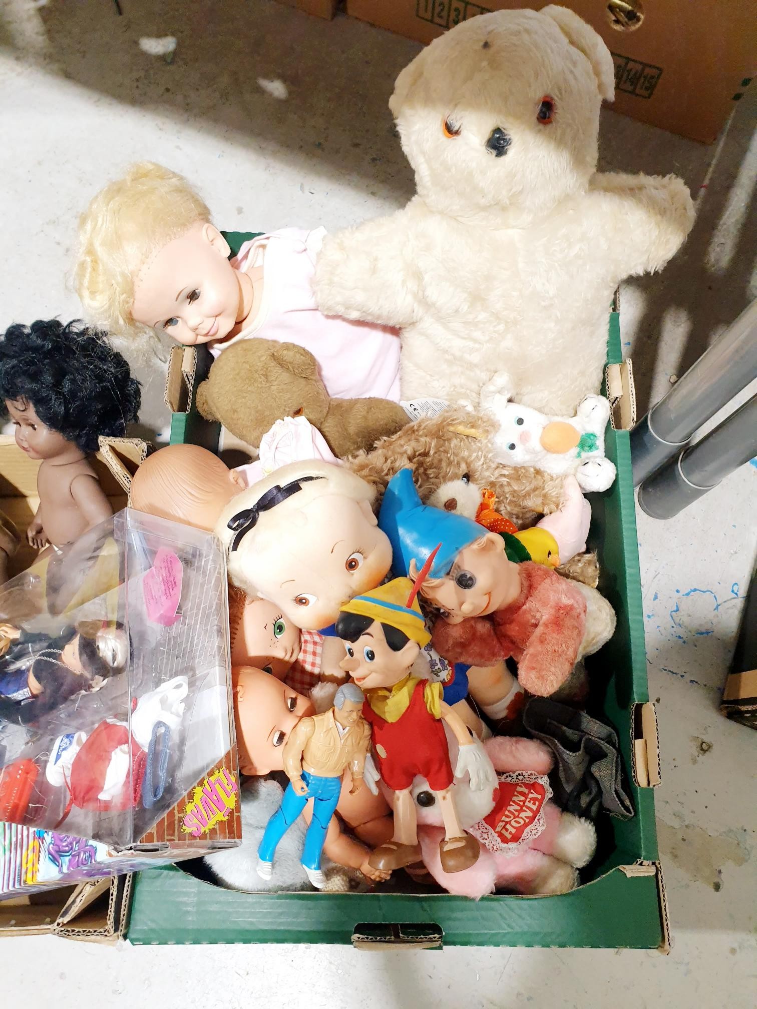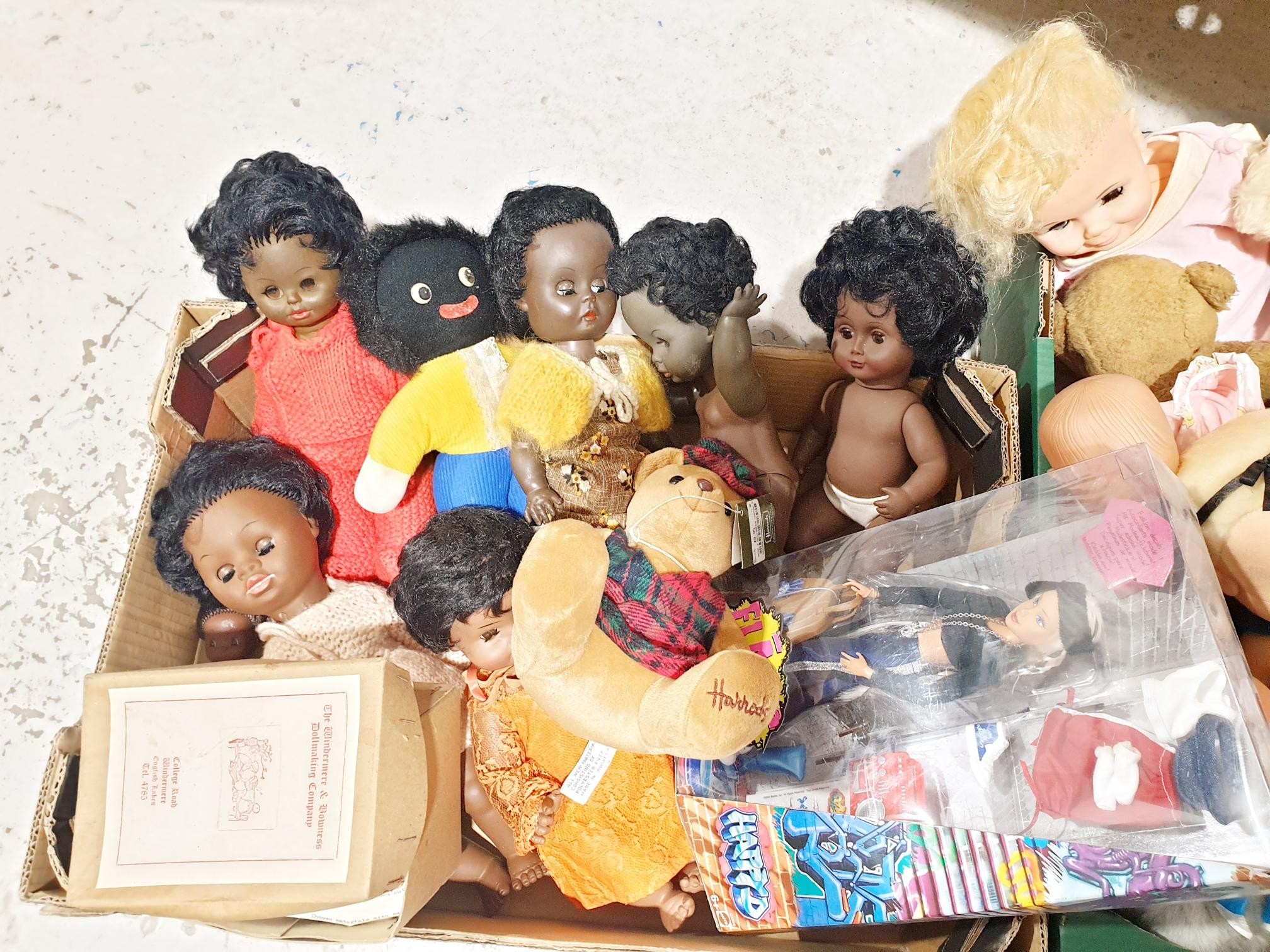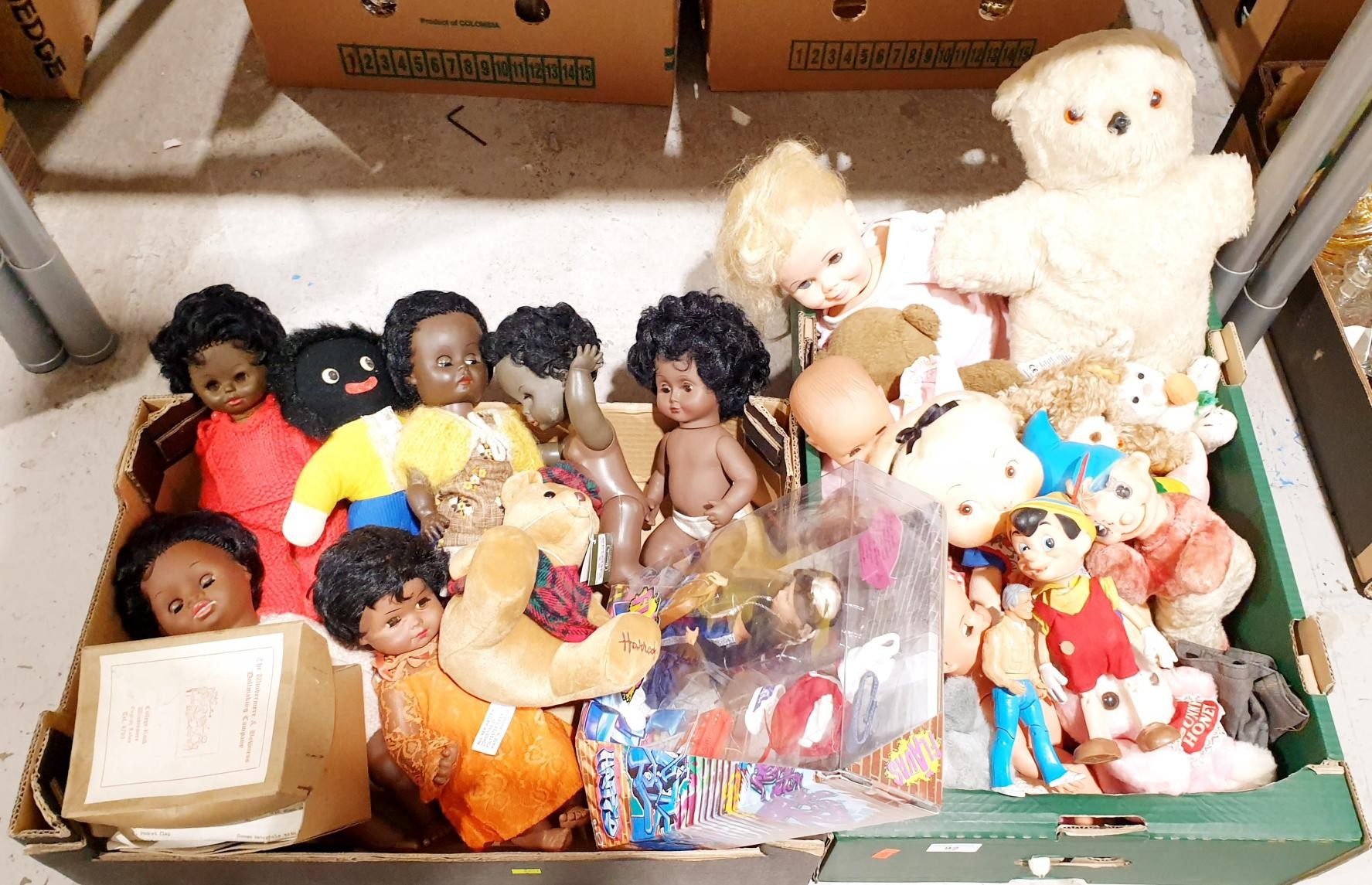 Two boxes of vintage and later soft toys and dolls including an A-Team figure and a Harrod's bear. No Shipping. Arrange collection or your own packer and shipper, please. Electricals are sold as scrap.
