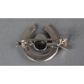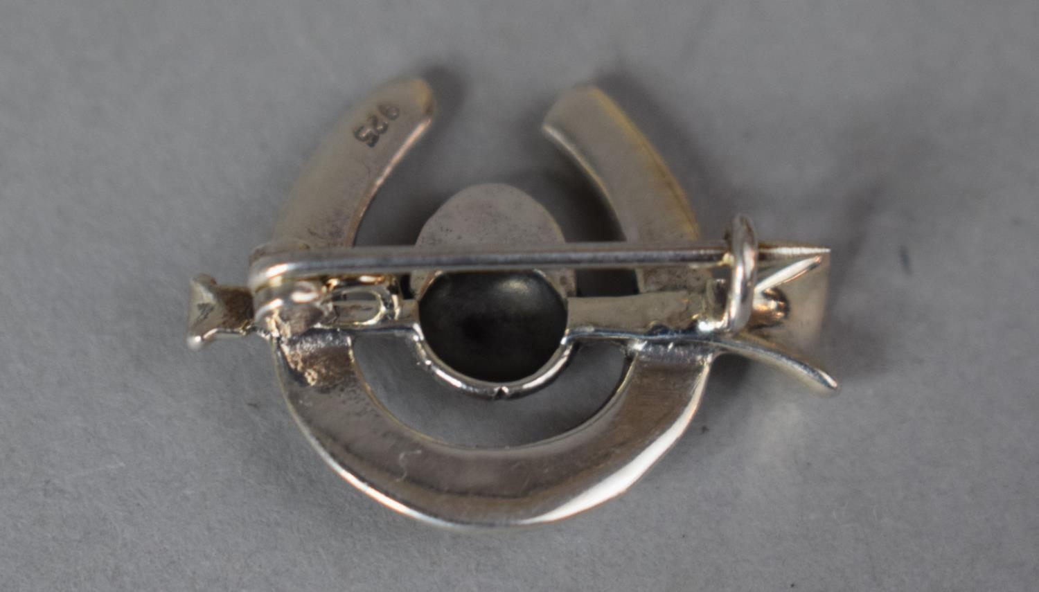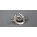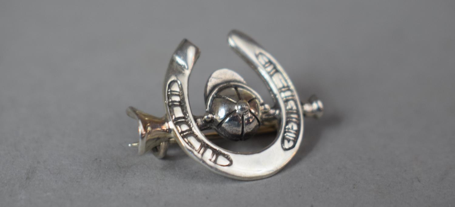 A Silver Hunting Pin Brooch with Horseshoe, Horn and Riding Hat, Marked 925 to Back