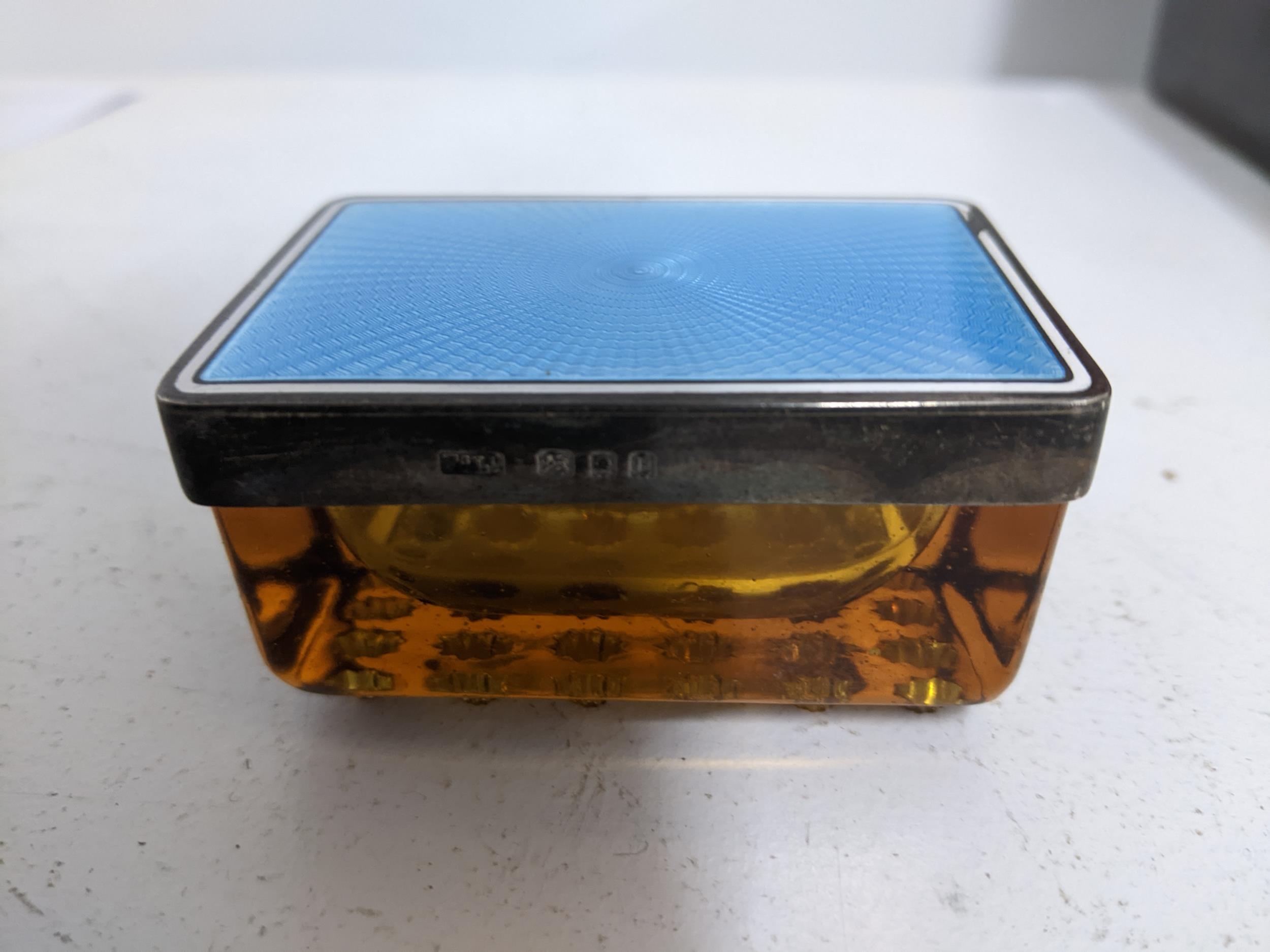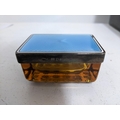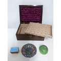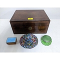 A rosewood Victorian work box with inlaid brass stringing and petal shaped cartouche, fitted tray interior 14cm x 30cm x 22.5cm, along with a Murano marine and millefiori glass ashtray, Art Deco green glass and enamel dressing table pot, and a silver and blue guilloche enamelled and amber glass dressing table box, London 1930 mark for Finnigans Ltd Location:R2.3