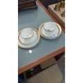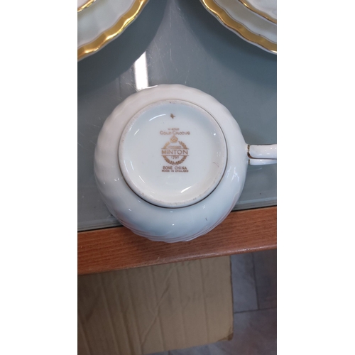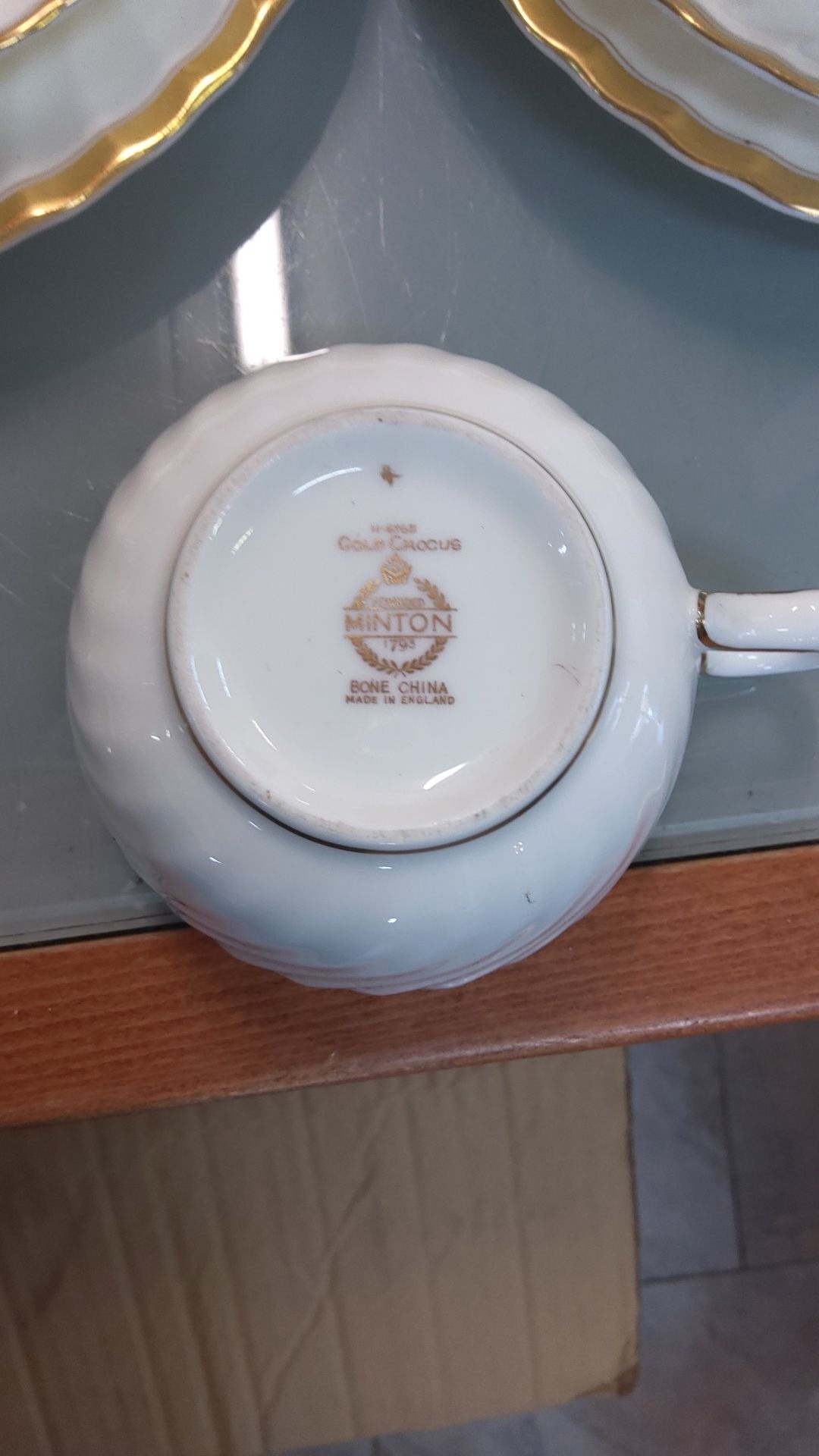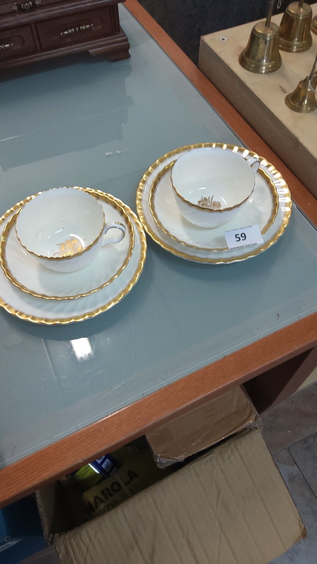 Minton bone china trios x 2, "Gold Crocus" pattern, features gold detailing. Made in England, with scalloped edges.