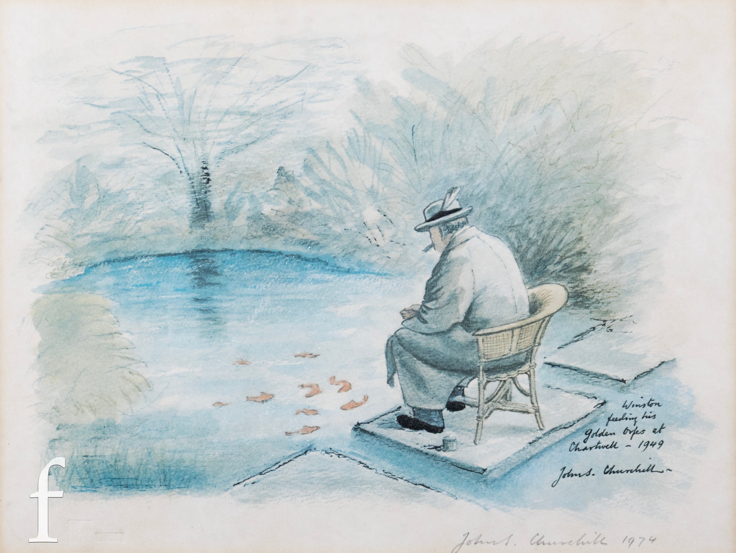 John Spencer Churchill (1926 - 2014) - 'Winston feeding his Golden Orfes', colour print, signed and dated 1974 in pencil, blind stamp, framed, 27cm x 35.5cm, frame size 52cm x 60cm.