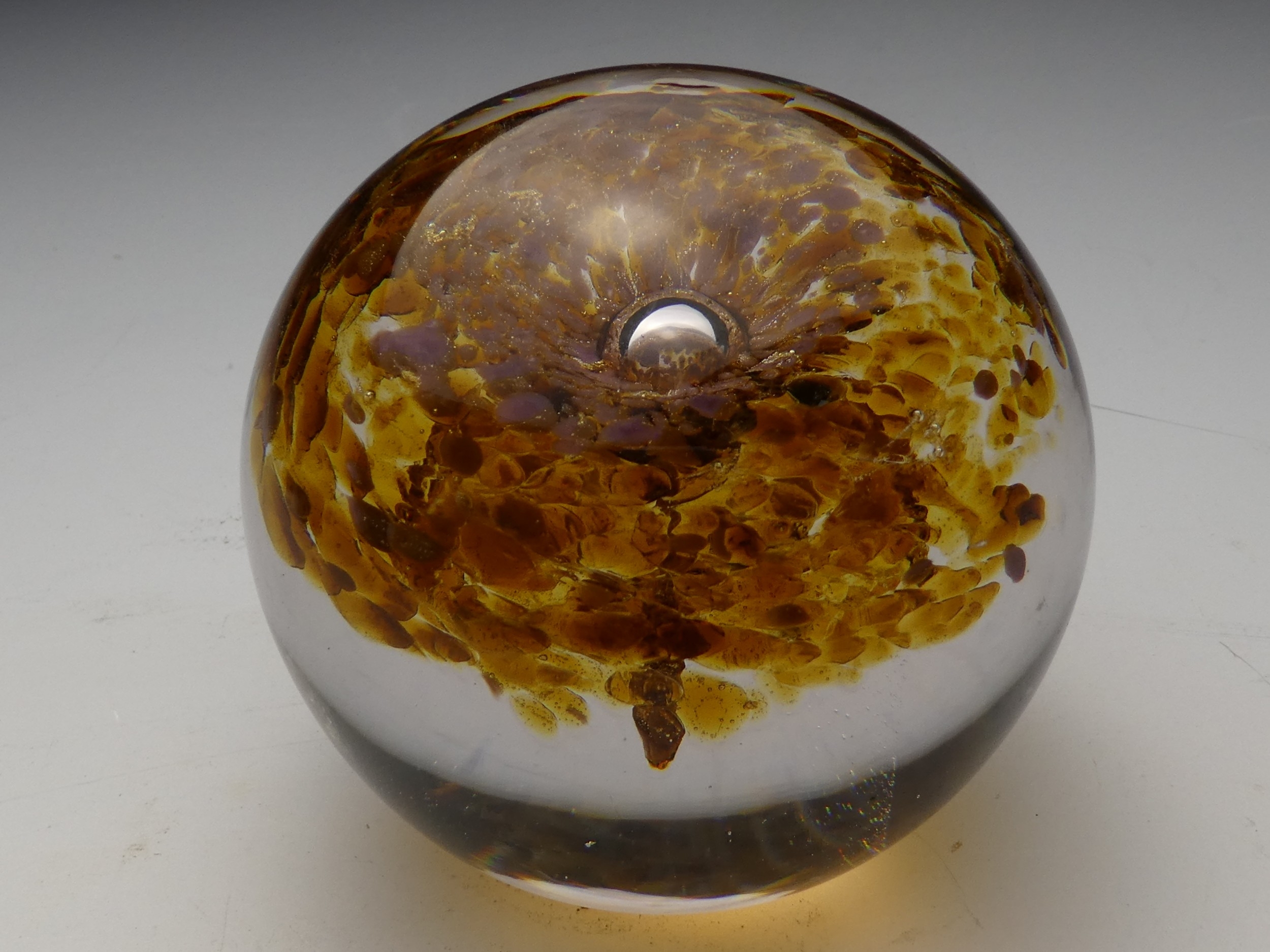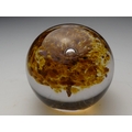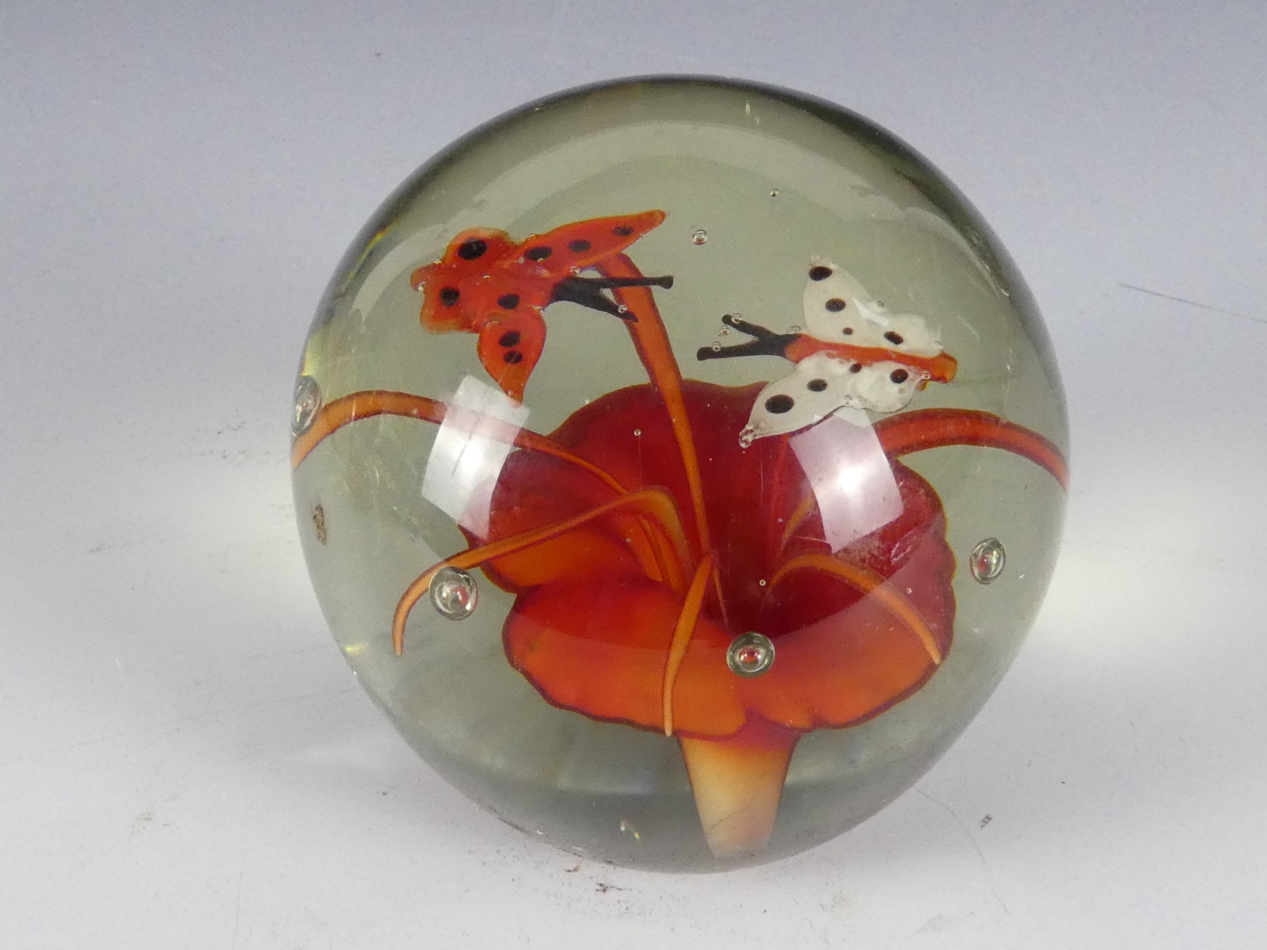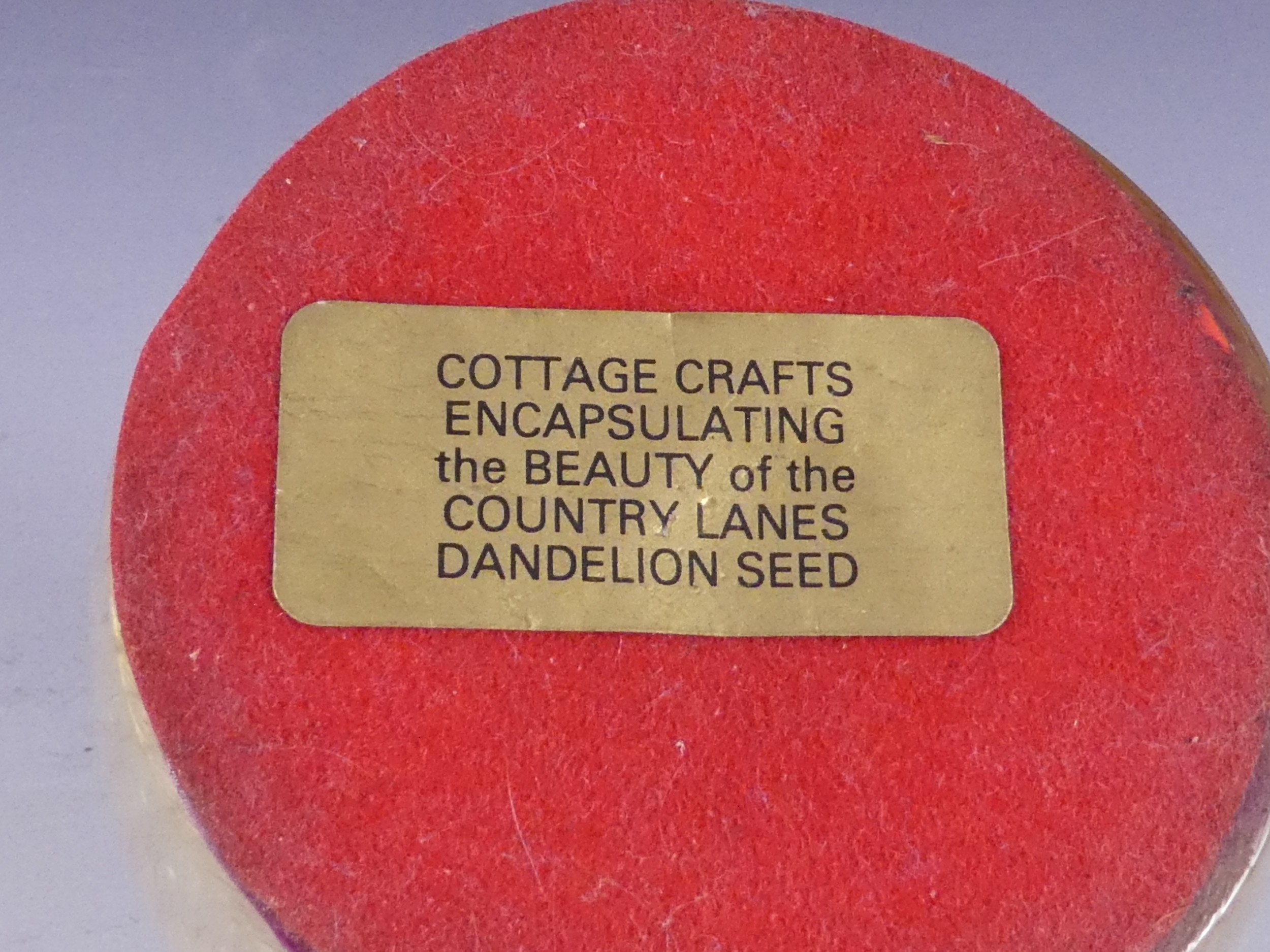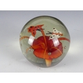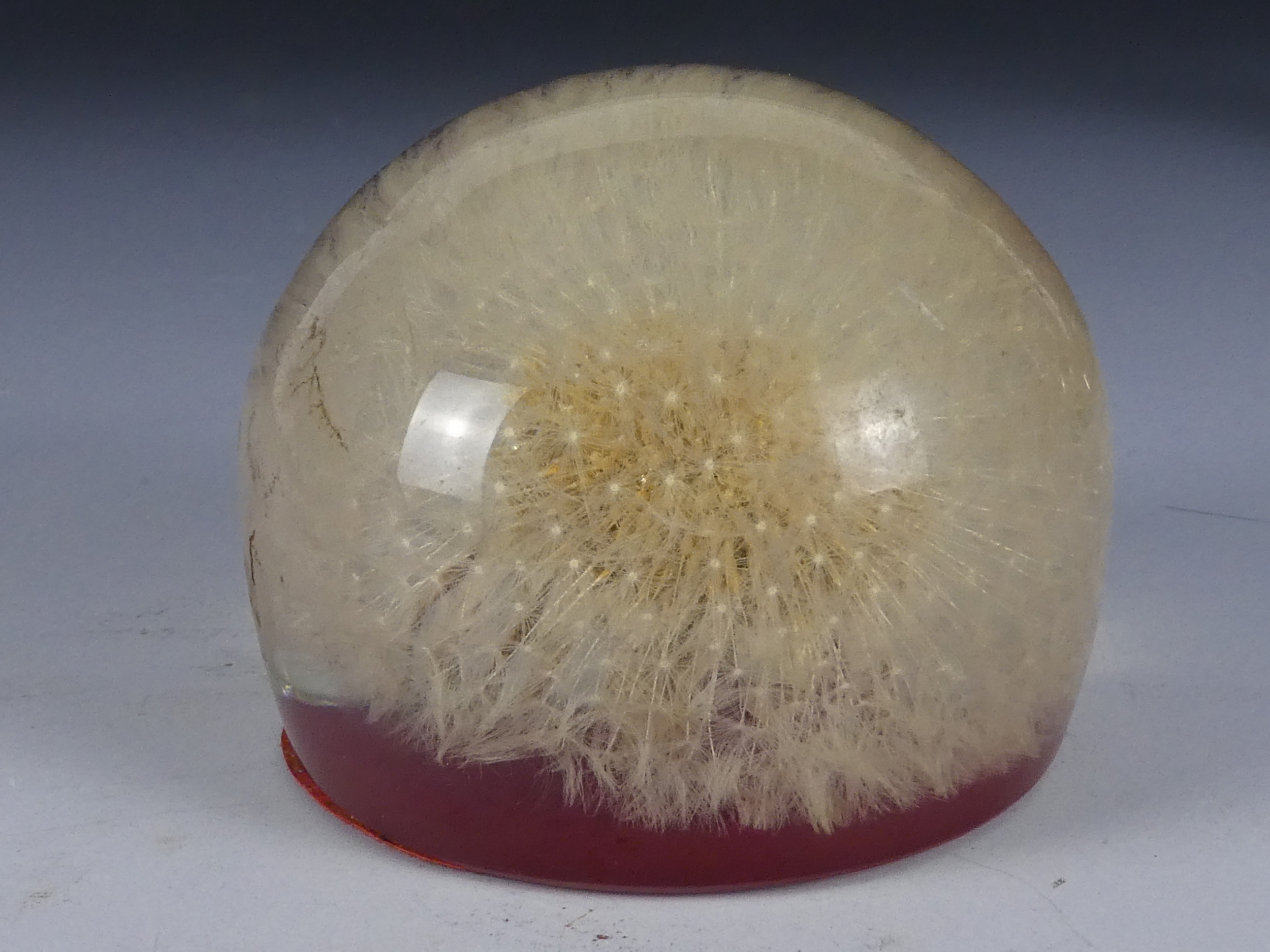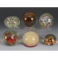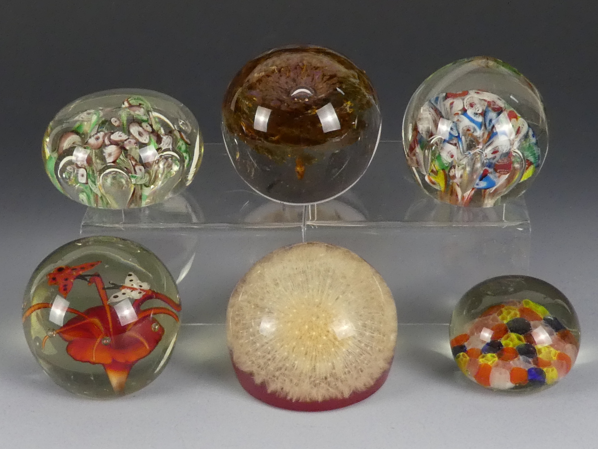 A Wedgwood glass paperweight - set with an amber flower, 7cm diameter, together with four other similar glass paperweights and an acrylic example. (6)