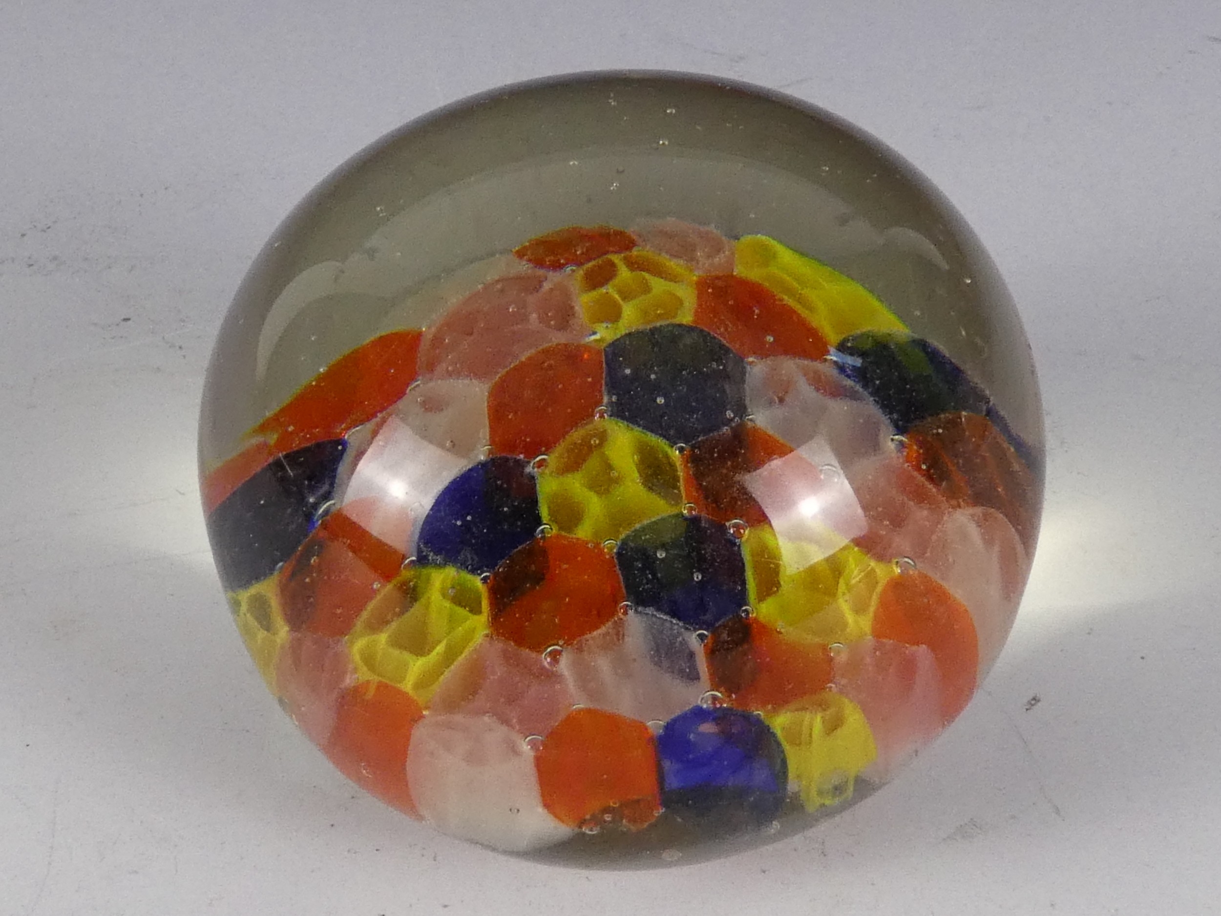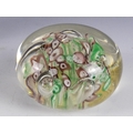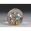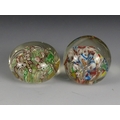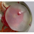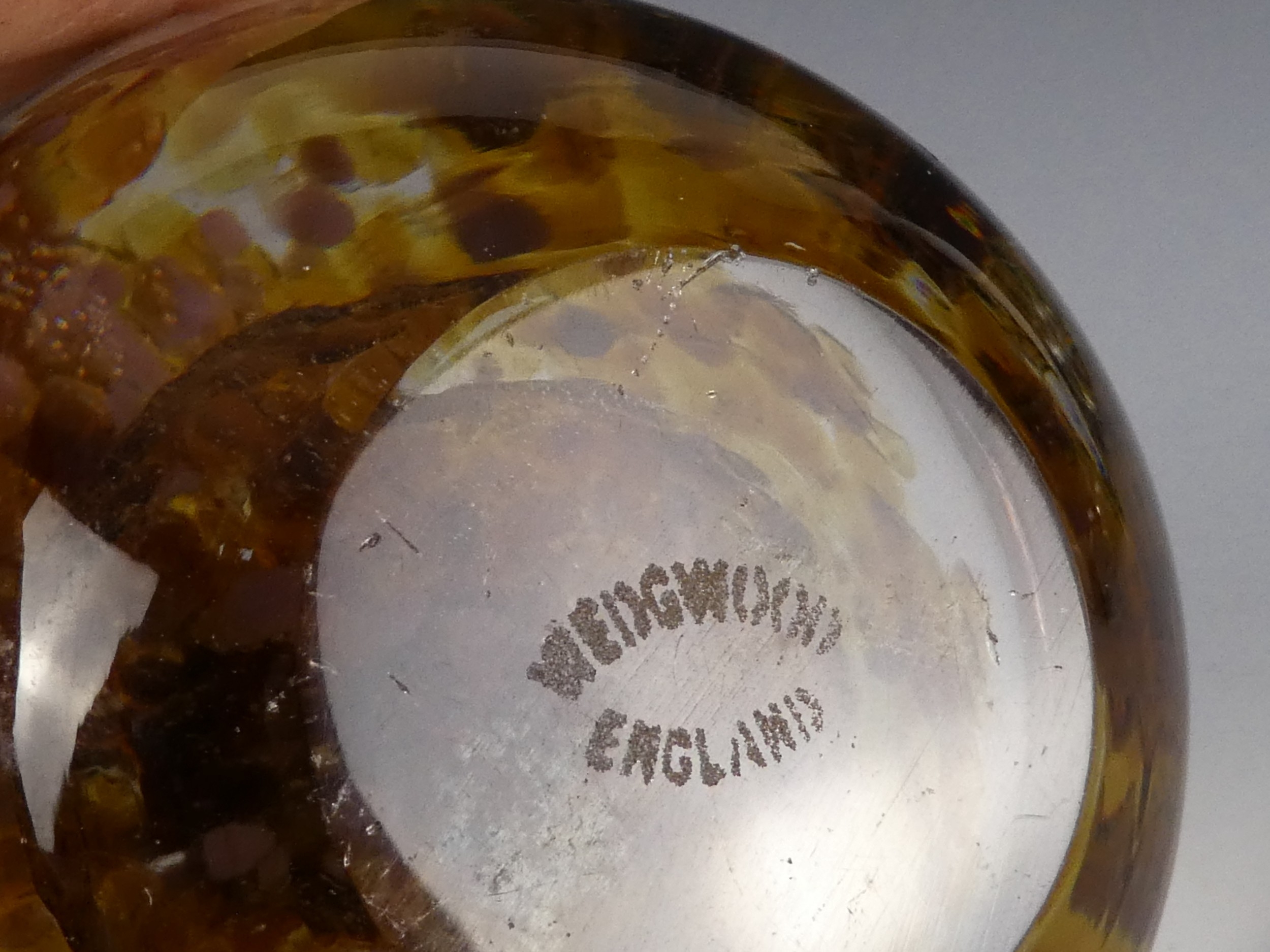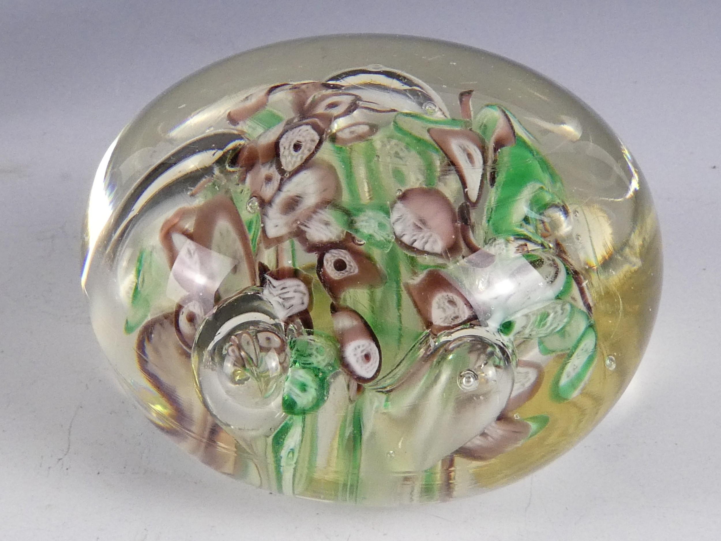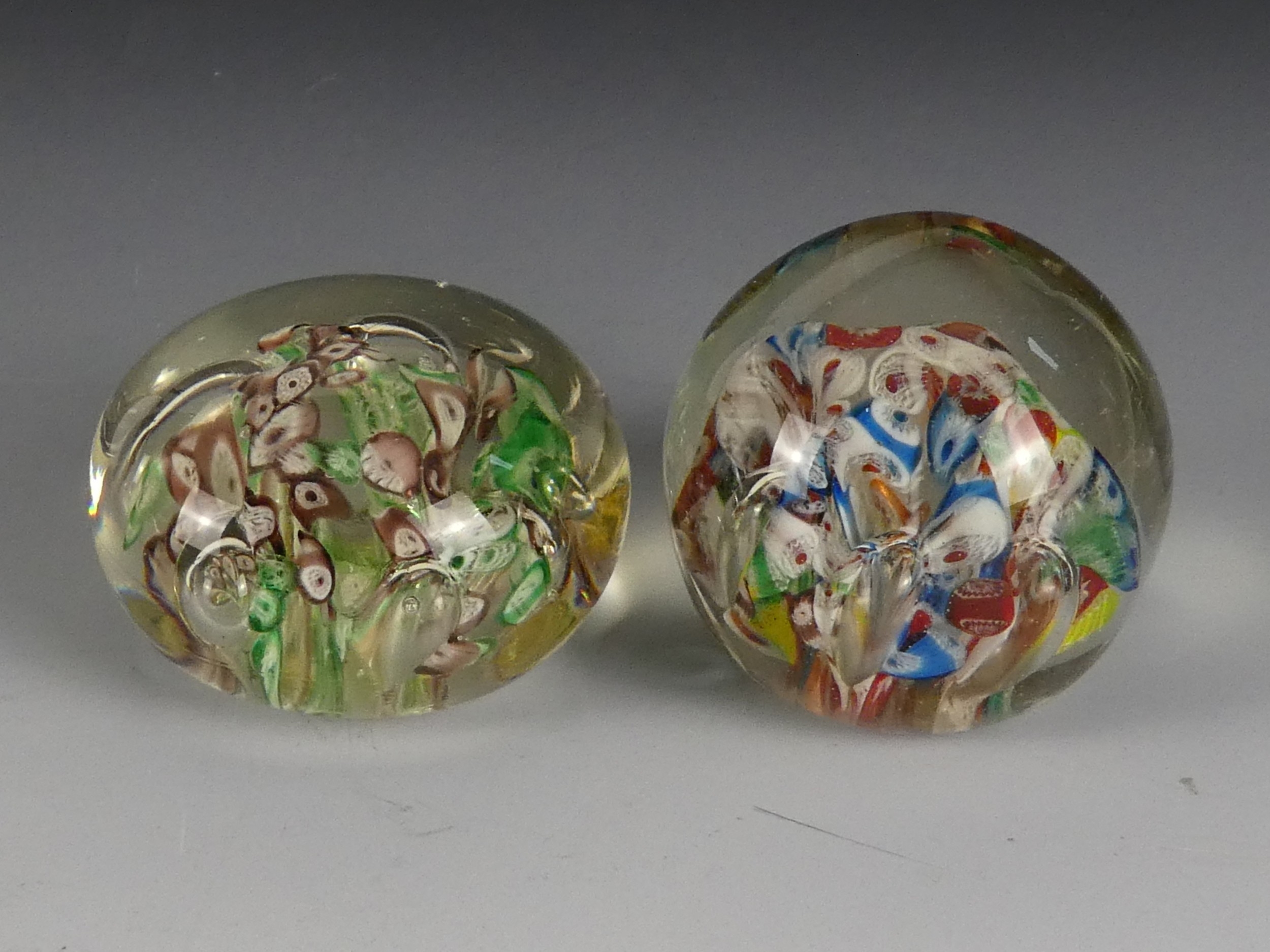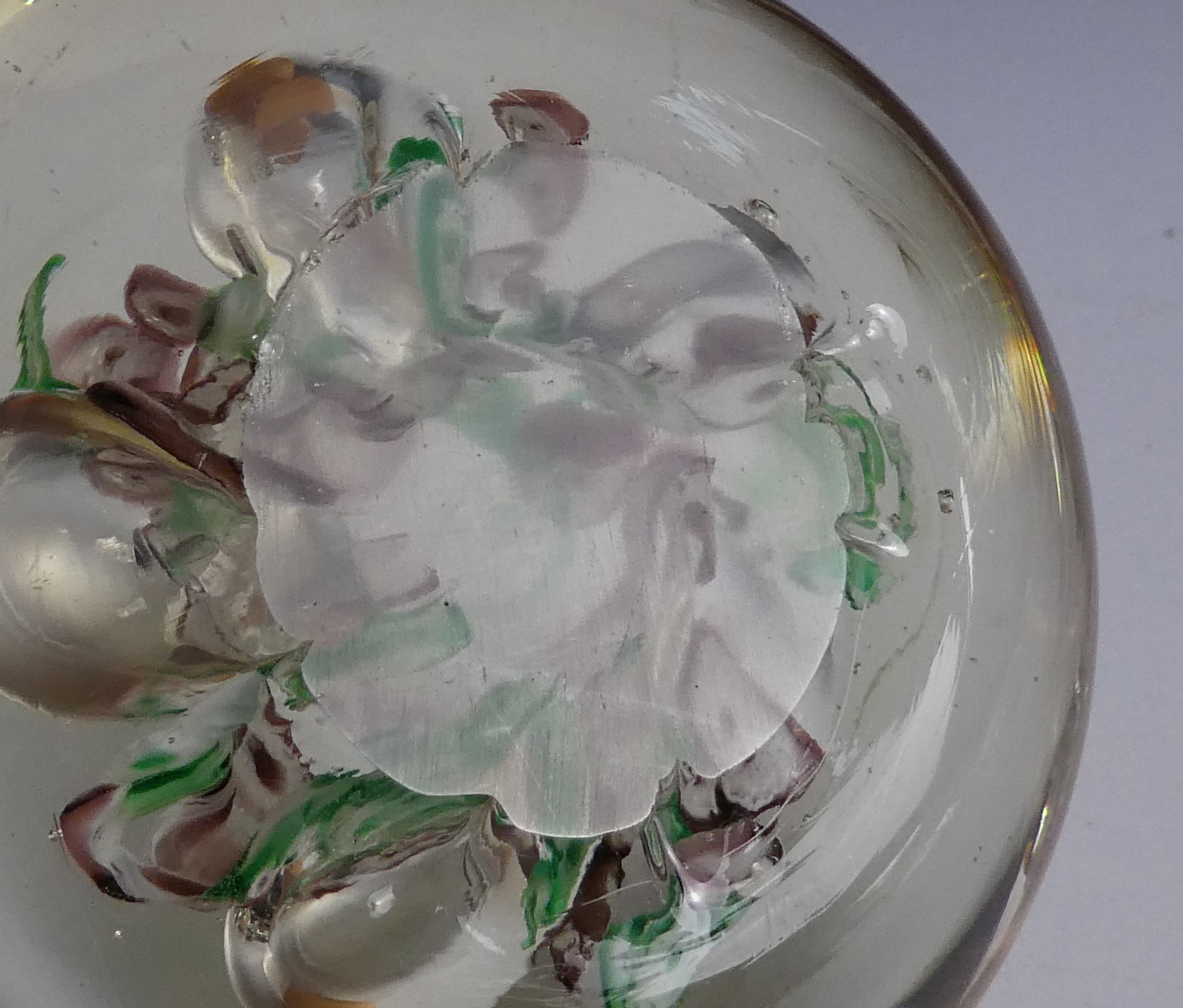 A Wedgwood glass paperweight - set with an amber flower, 7cm diameter, together with four other similar glass paperweights and an acrylic example. (6)