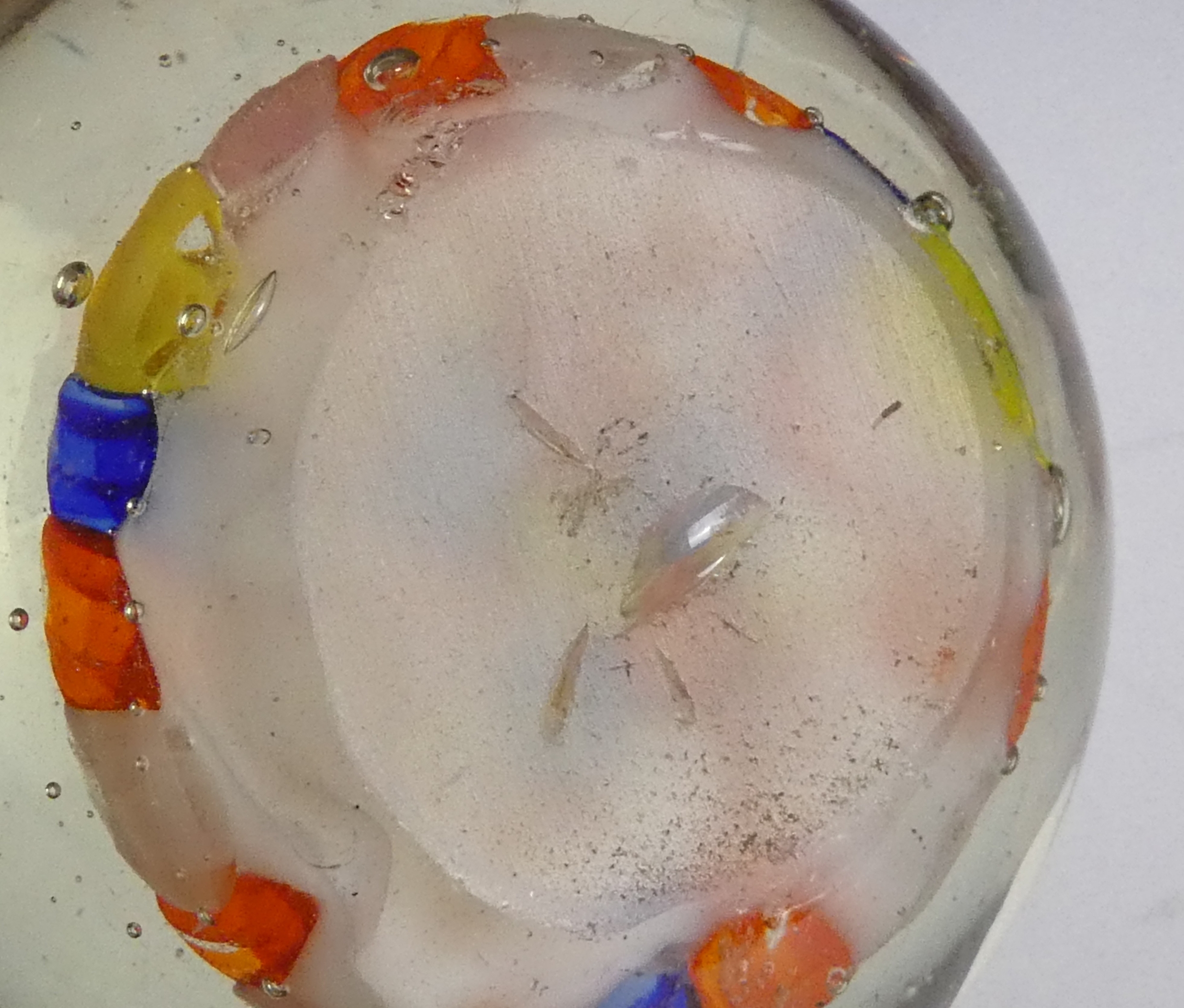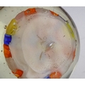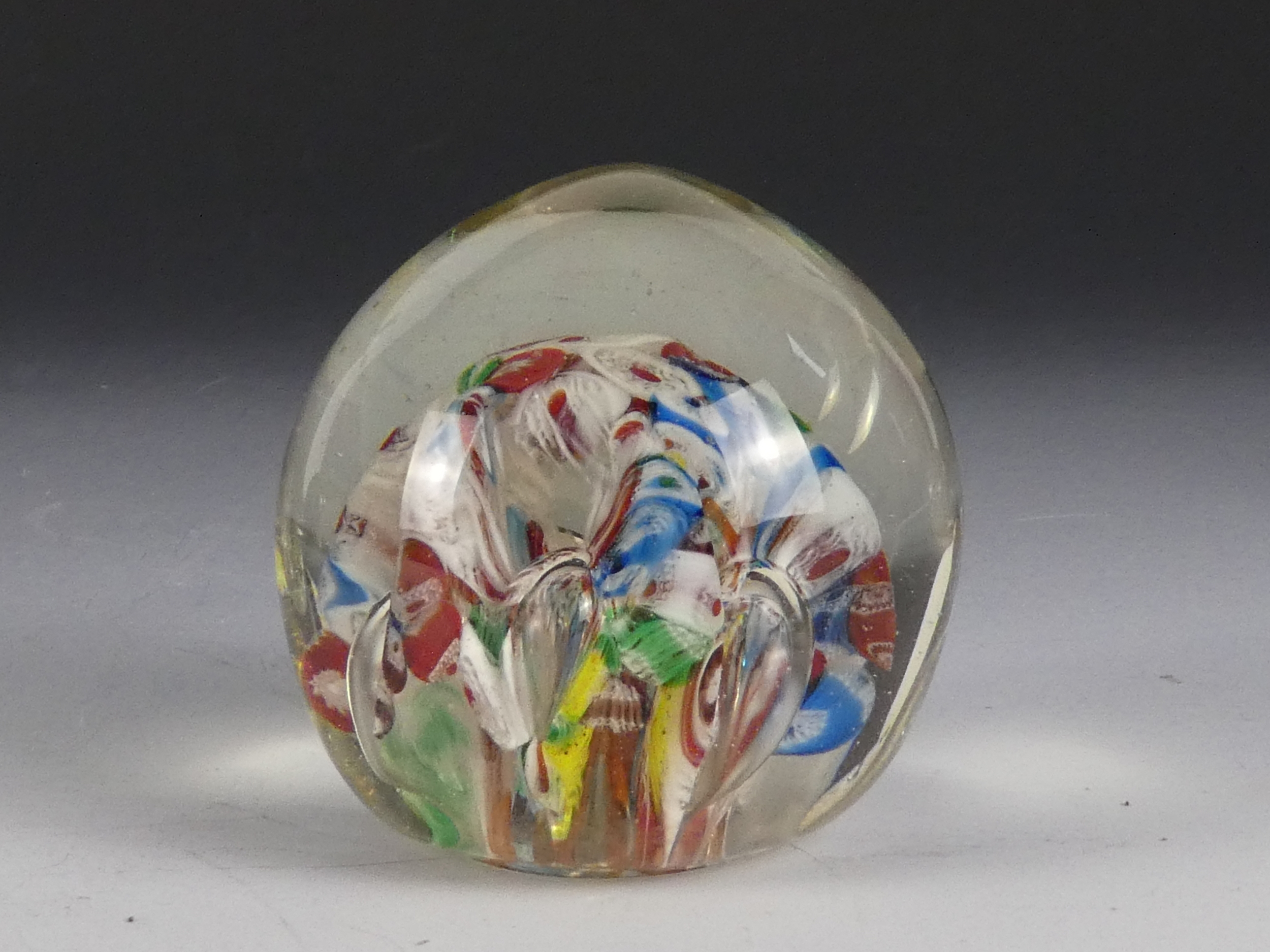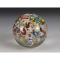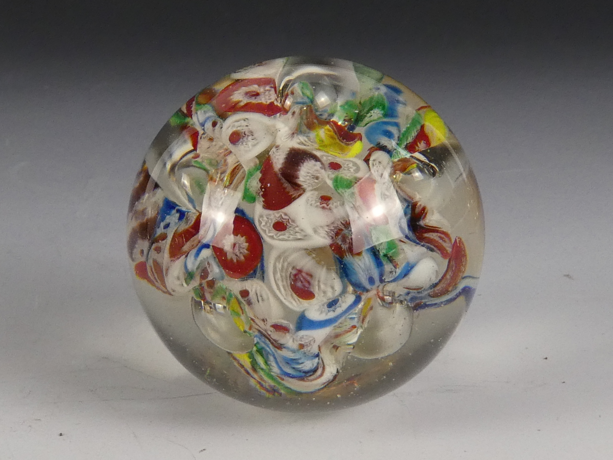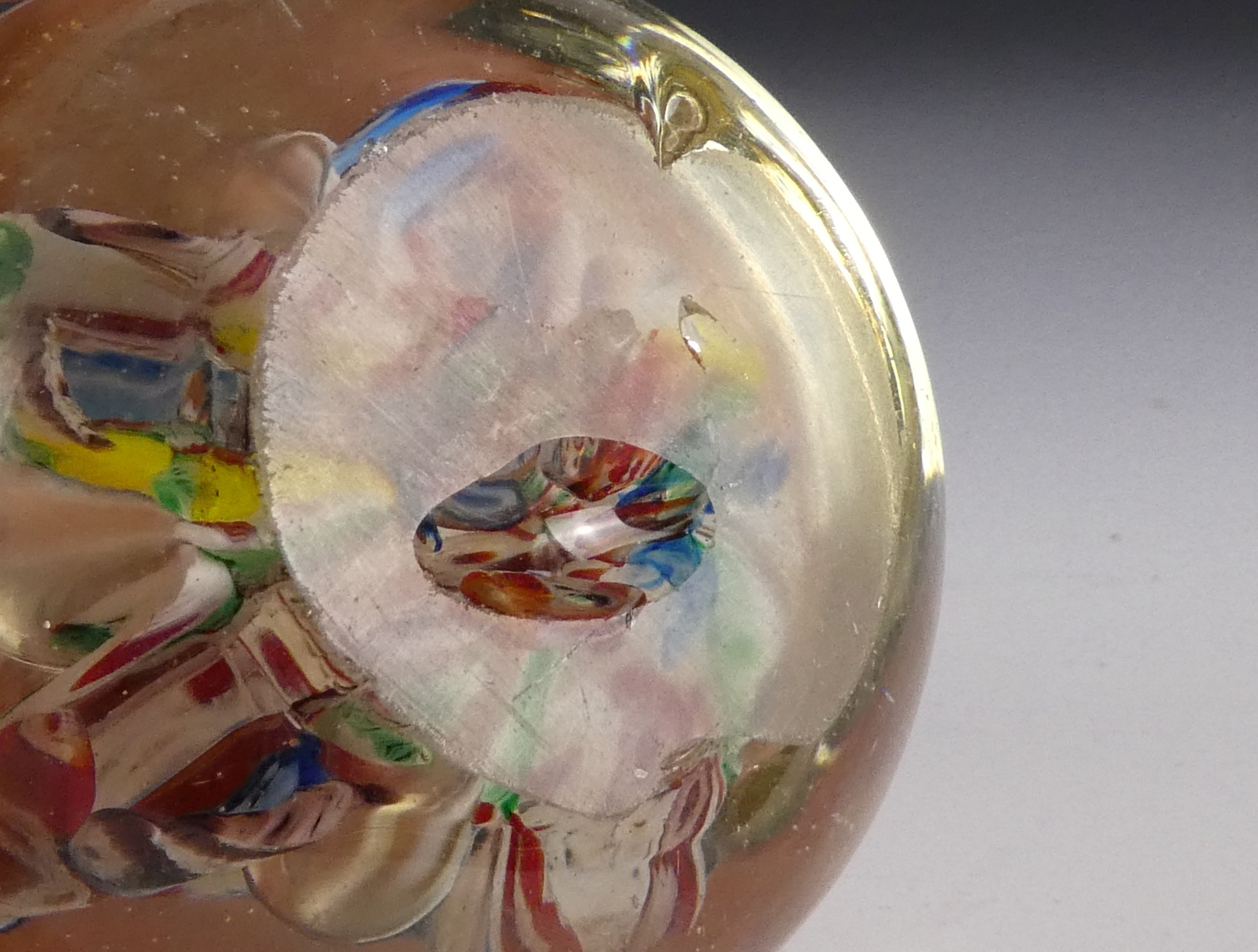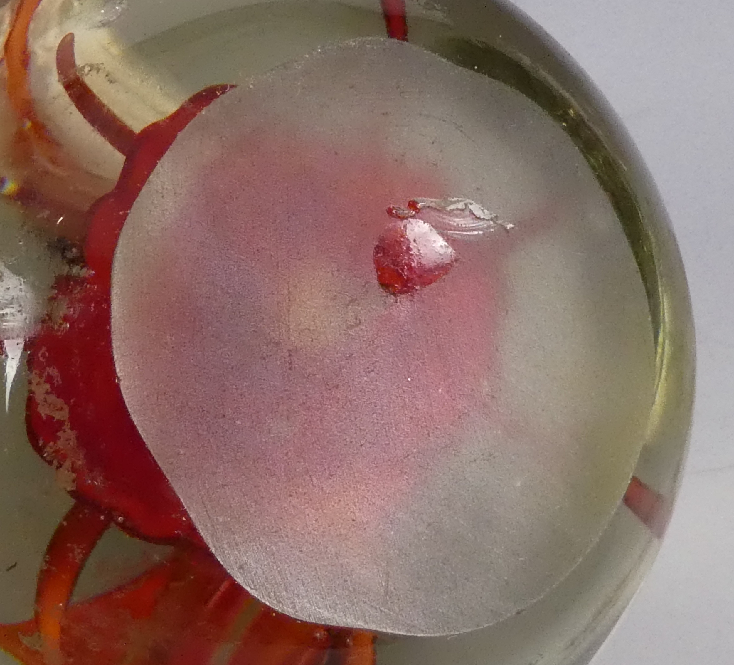 A Wedgwood glass paperweight - set with an amber flower, 7cm diameter, together with four other similar glass paperweights and an acrylic example. (6)