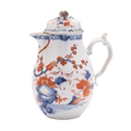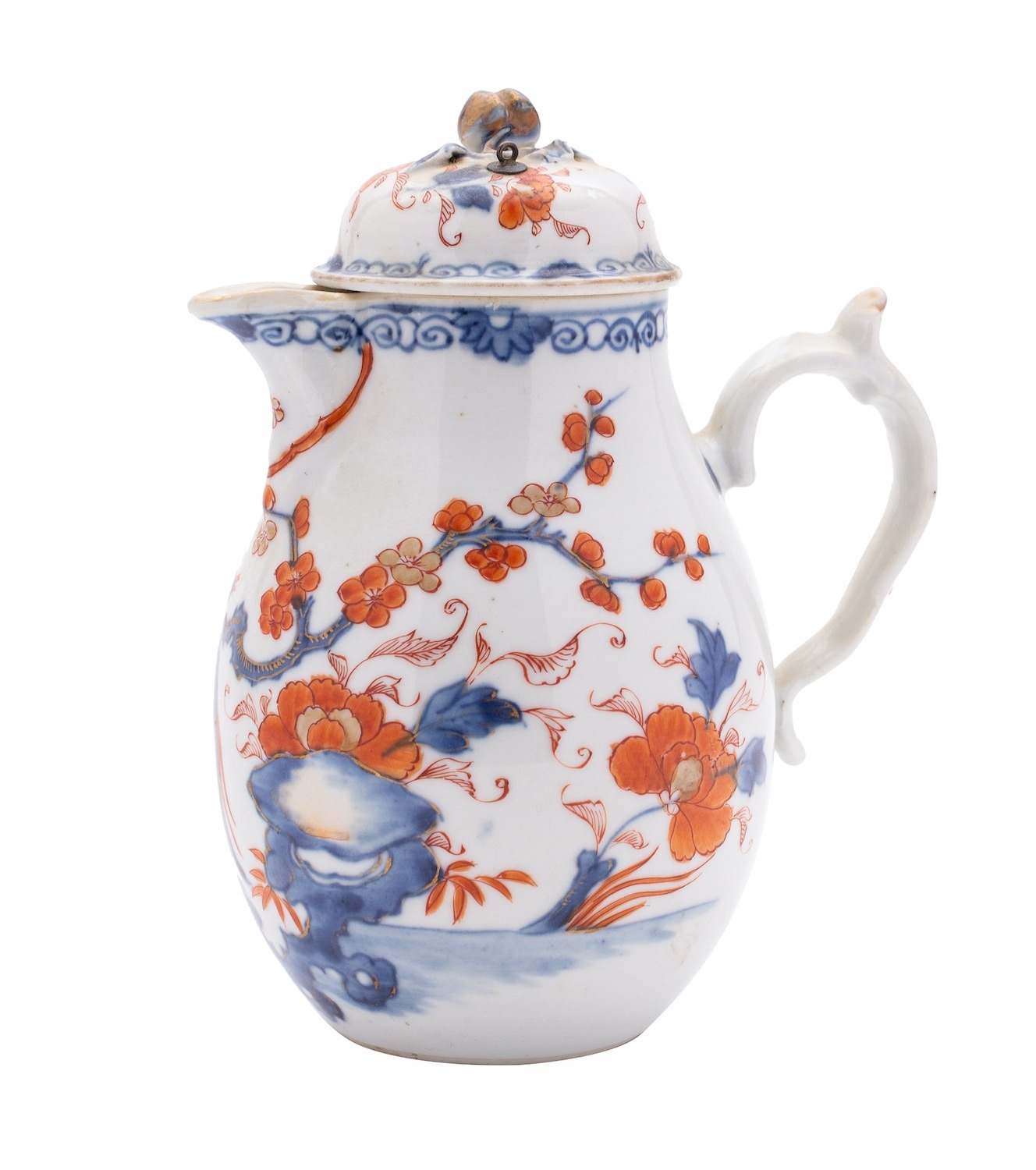 A Chinese Imari jug and cover of baluster form with domed cover, painted with a bird amongst prunus and peonies, pierced rockwork below, Qianlong, 18cm [cover with metal loop for chain].