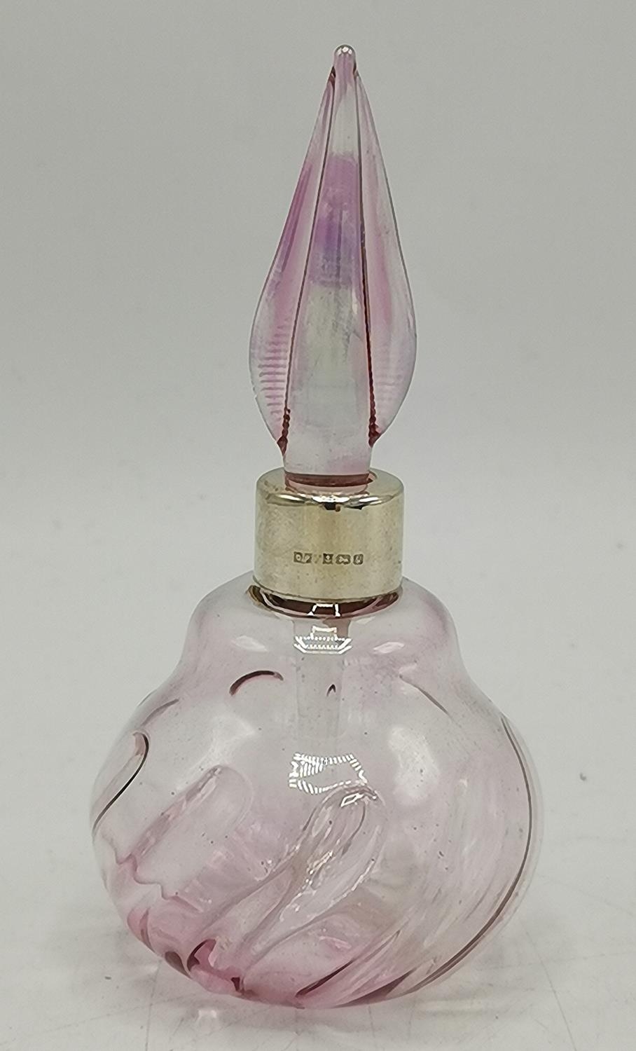 PRESENTED AS A SILVER TOPPED PINK GLASS PERFUME BOTTLE With STOPPER (Hallmarked For Birmingham 1990)