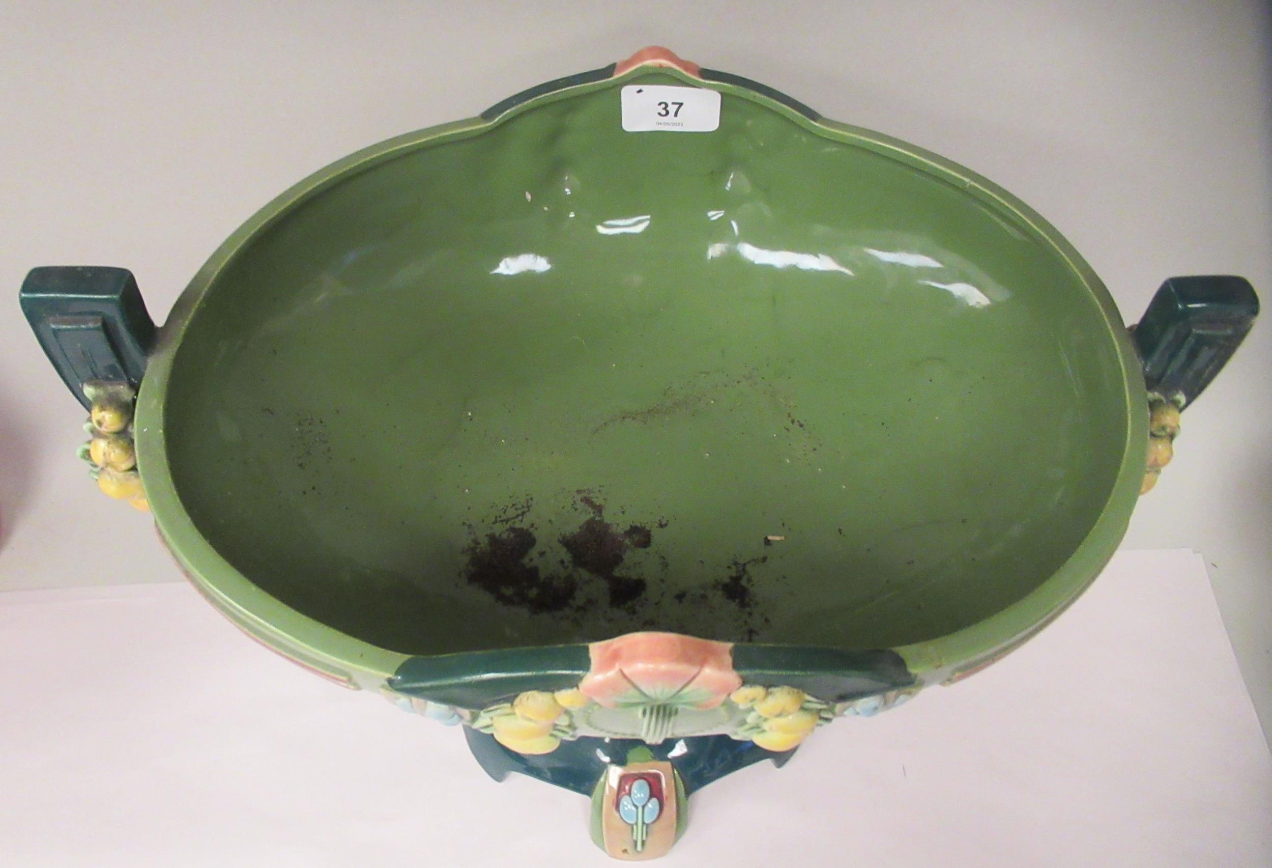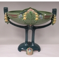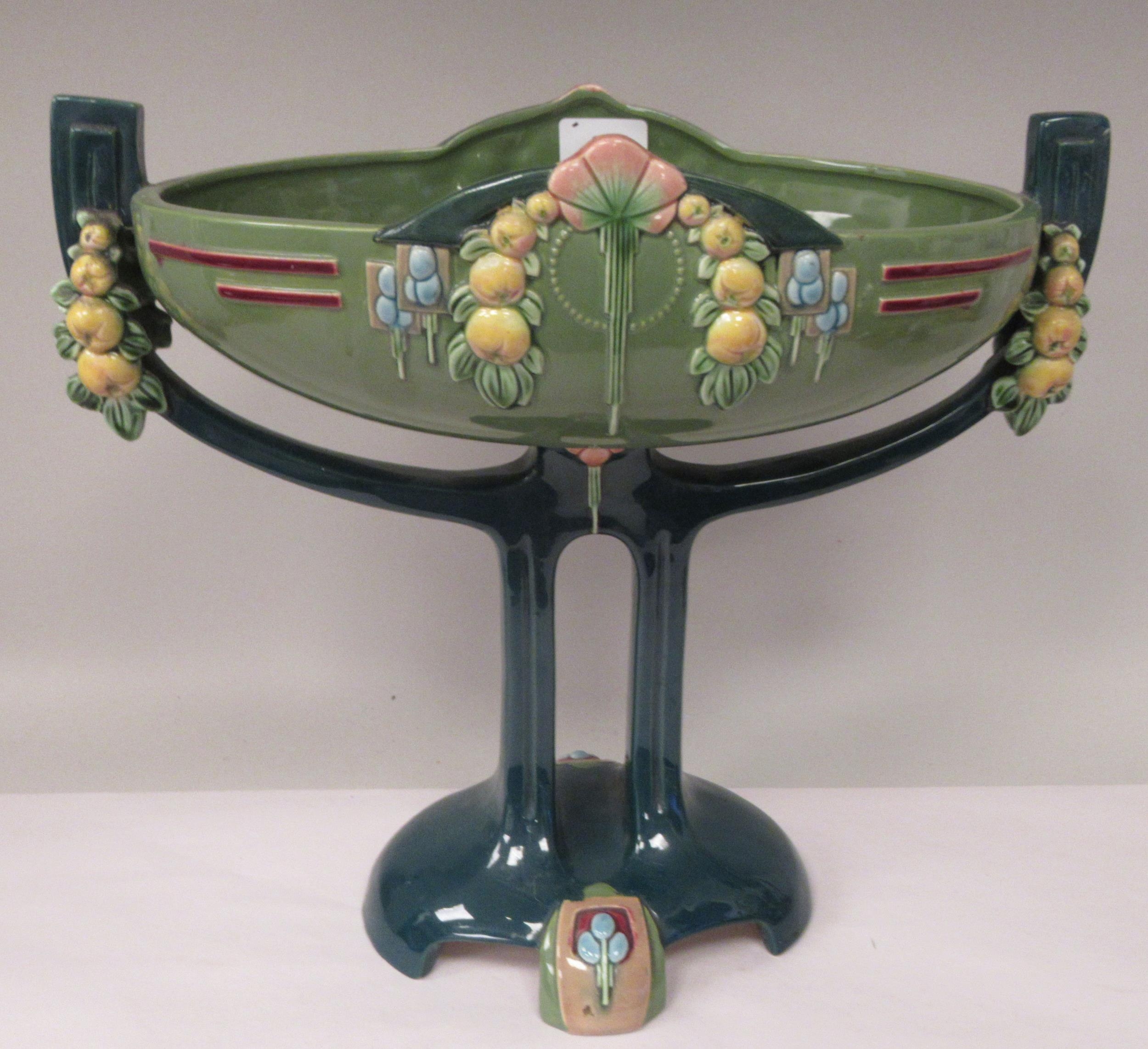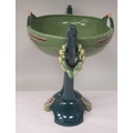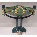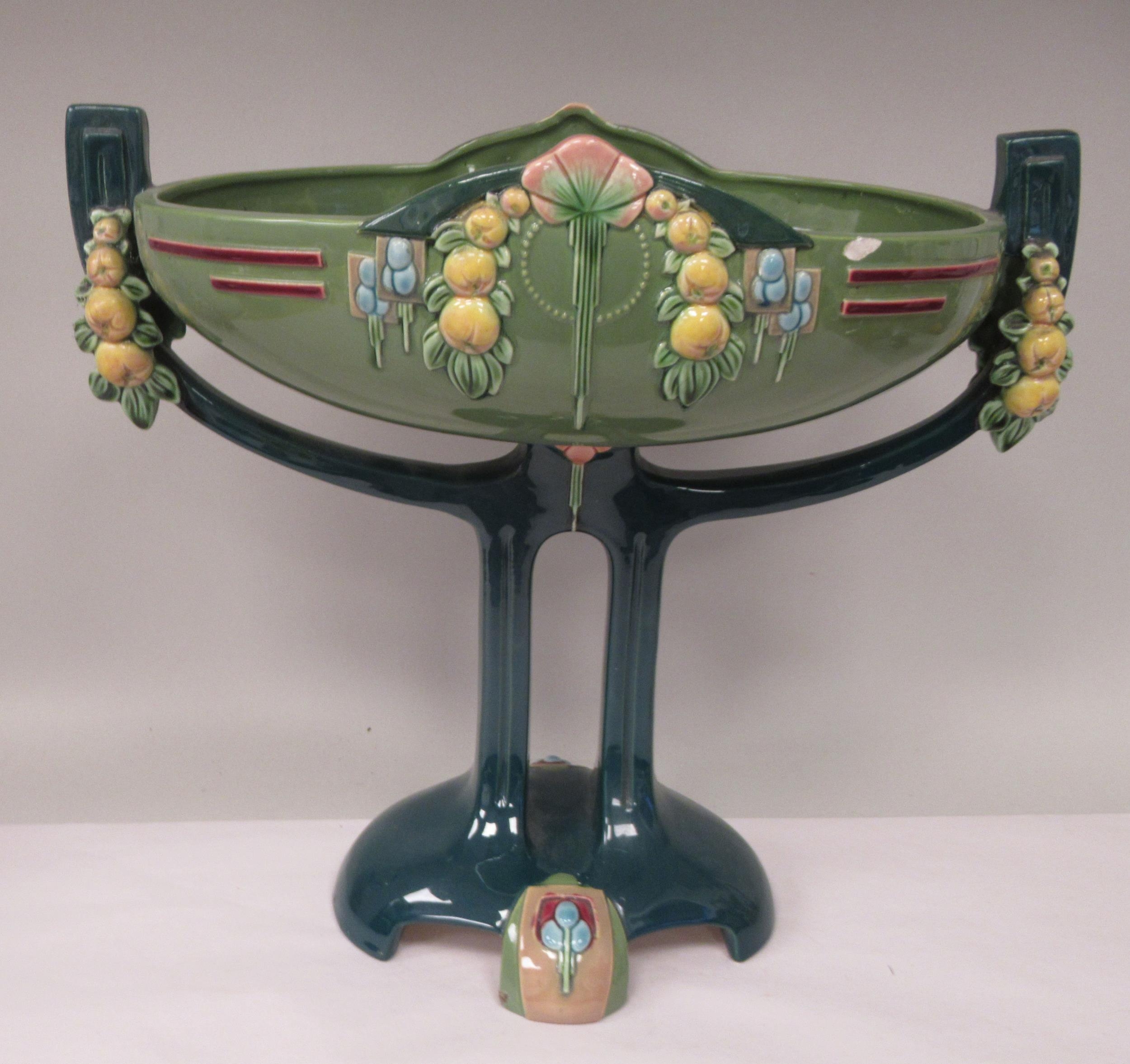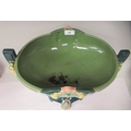 An Art Deco two tone blue/green glazed pottery table centrepiece oval bowl, elevated on a twin pedestal cradle, on a domed base 14"w
