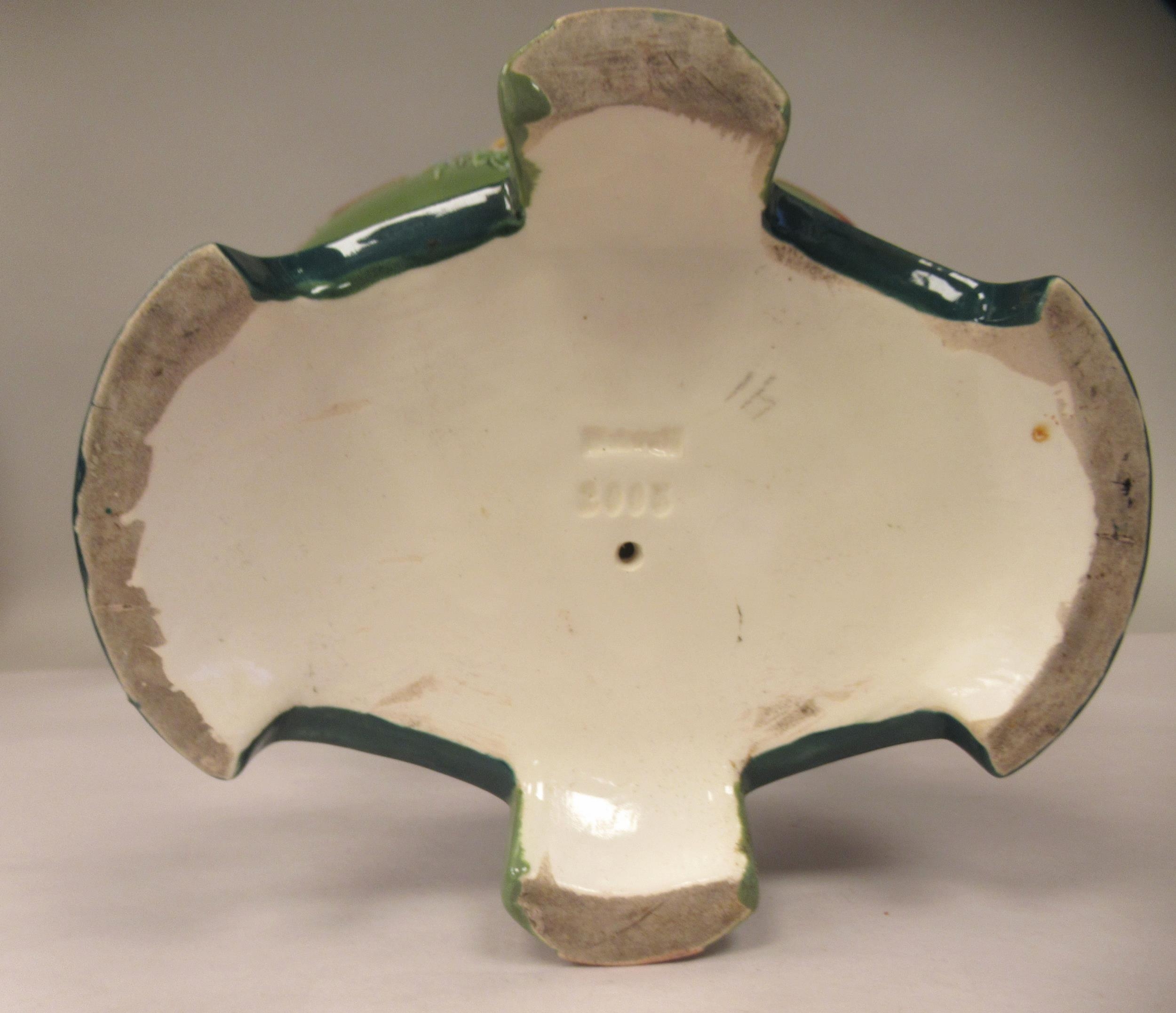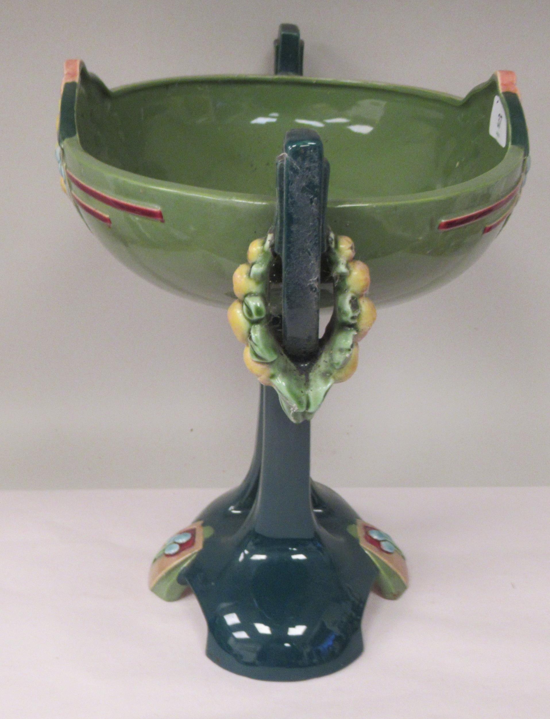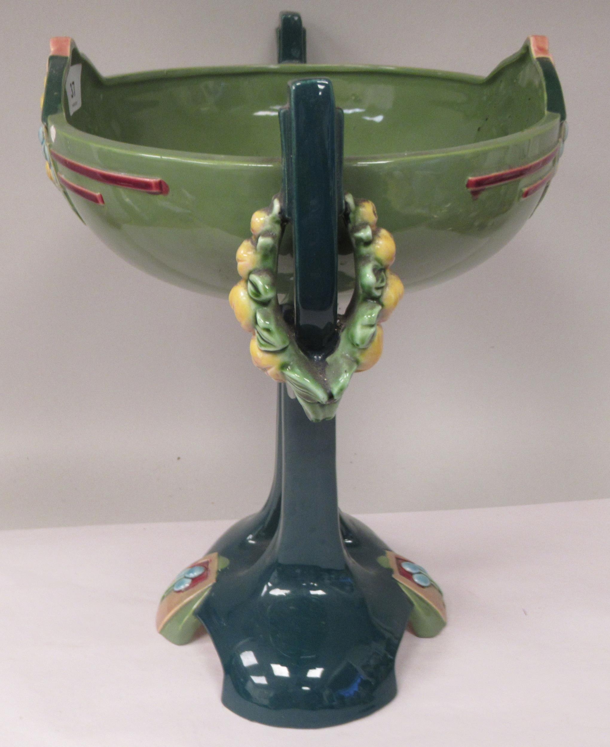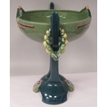 An Art Deco two tone blue/green glazed pottery table centrepiece oval bowl, elevated on a twin pedestal cradle, on a domed base 14"w