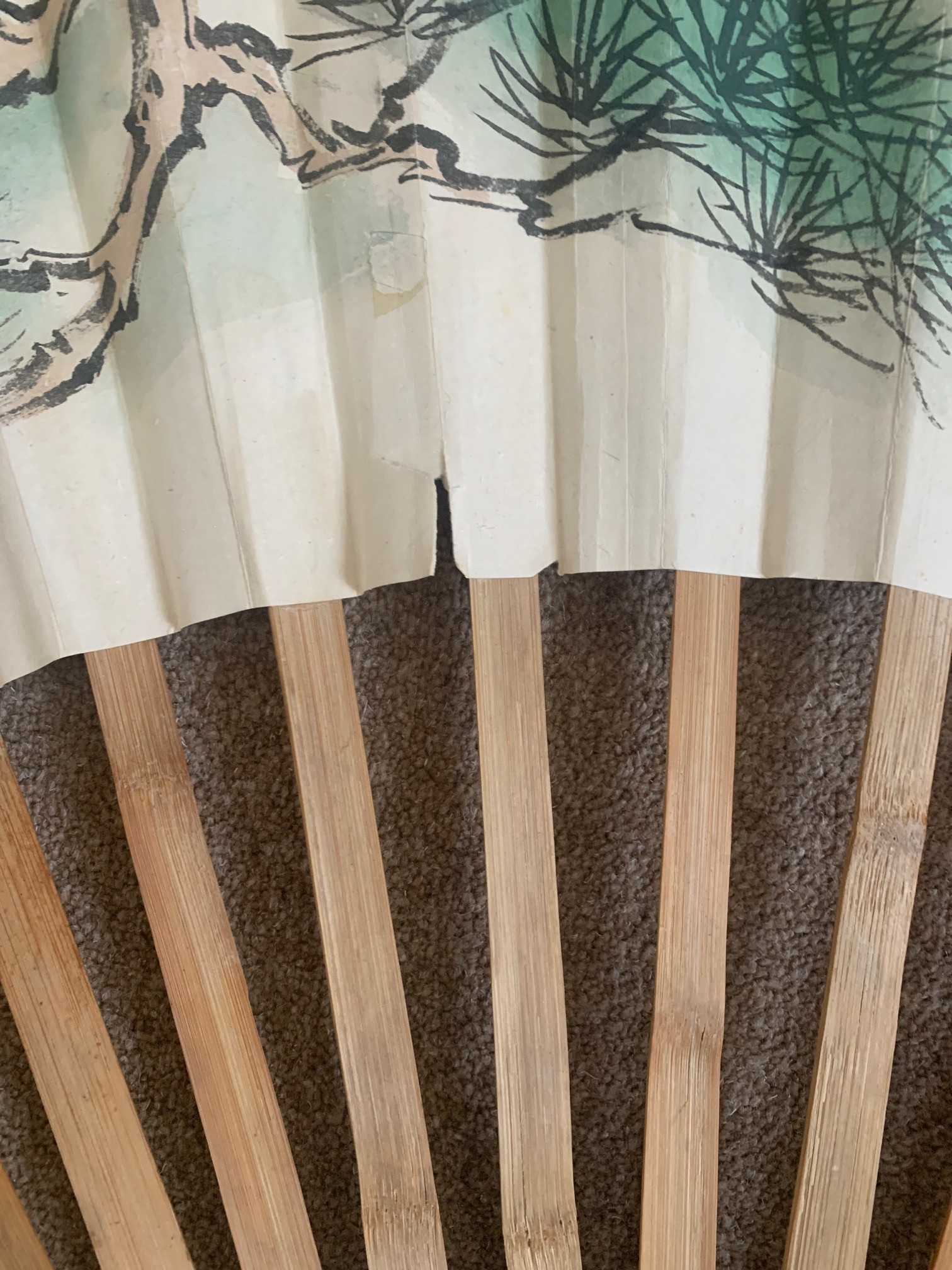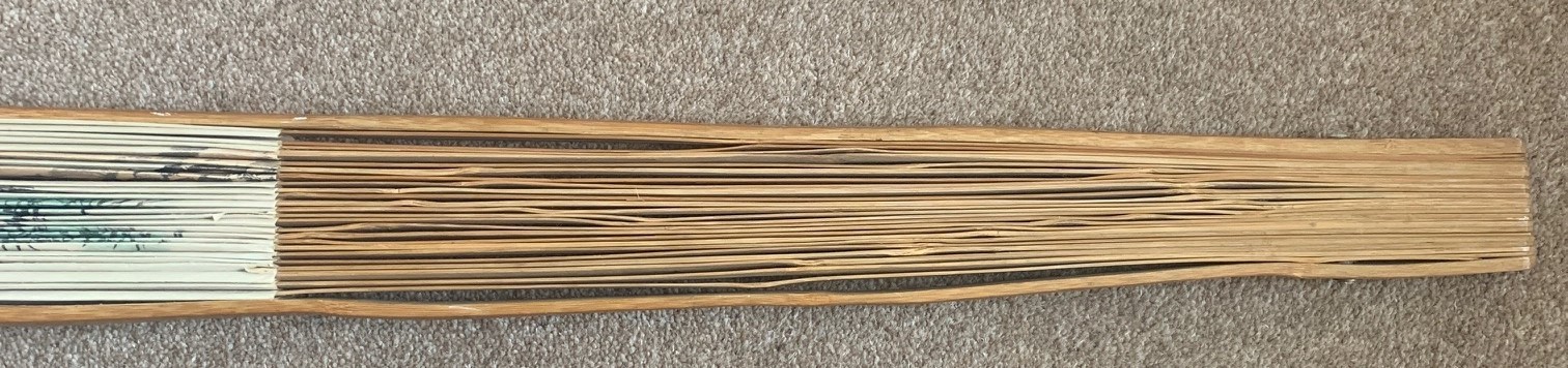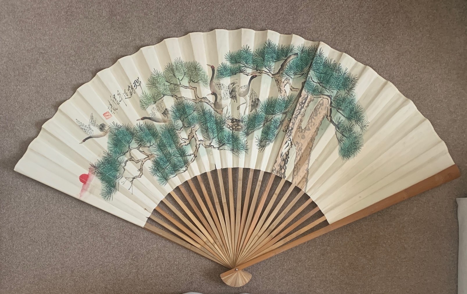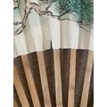 Chinese hand painted and bamboo opera fan, decorated with flying birds amongst trees, 22 bamboo sticks, with artist's red seal mark and inscription, 97 x 173 cm.