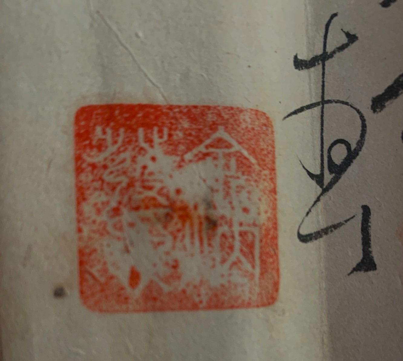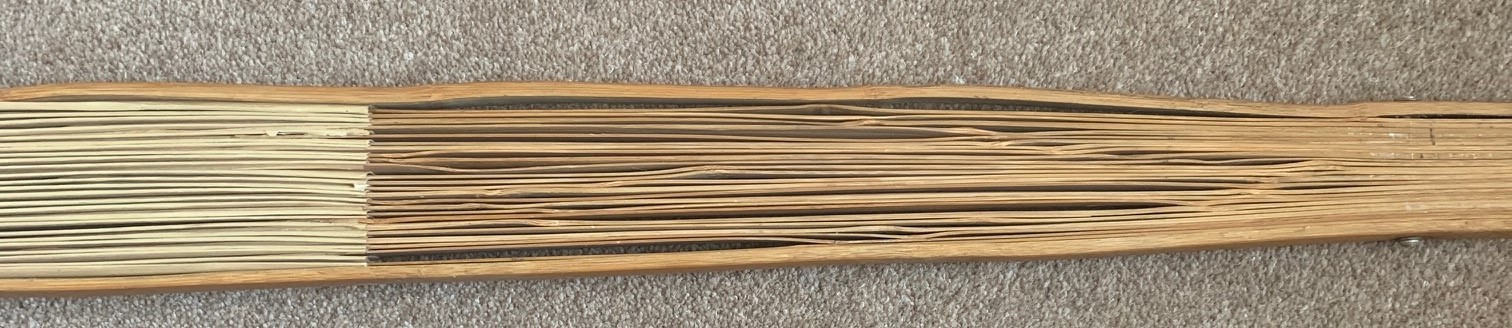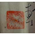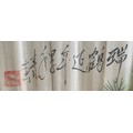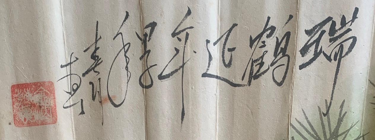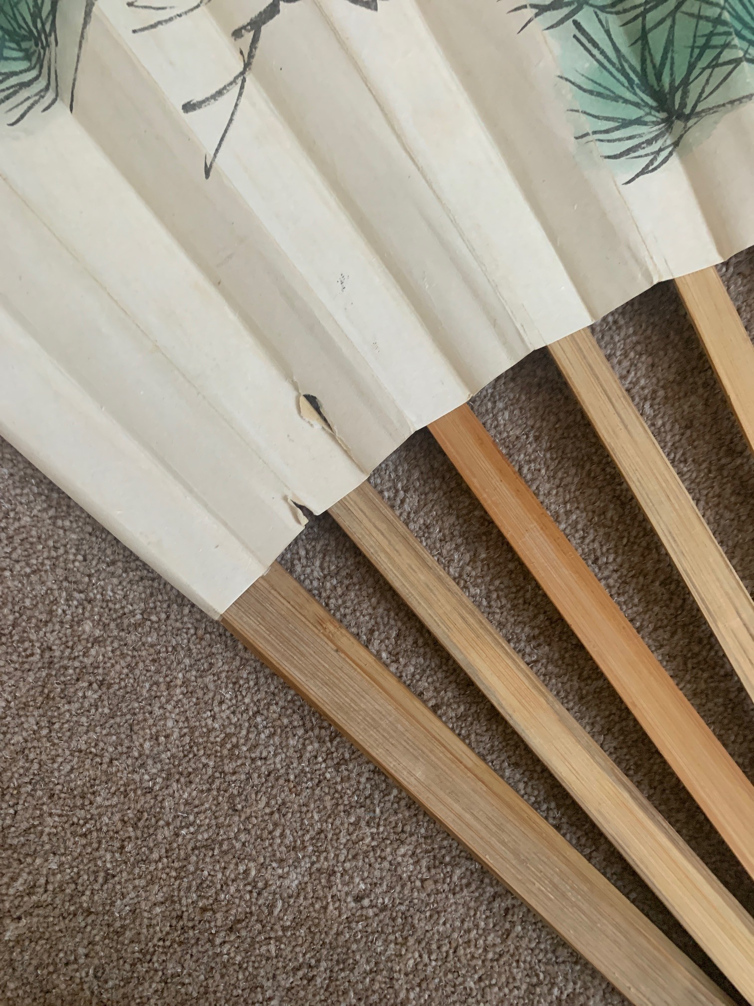 Chinese hand painted and bamboo opera fan, decorated with flying birds amongst trees, 22 bamboo sticks, with artist's red seal mark and inscription, 97 x 173 cm.