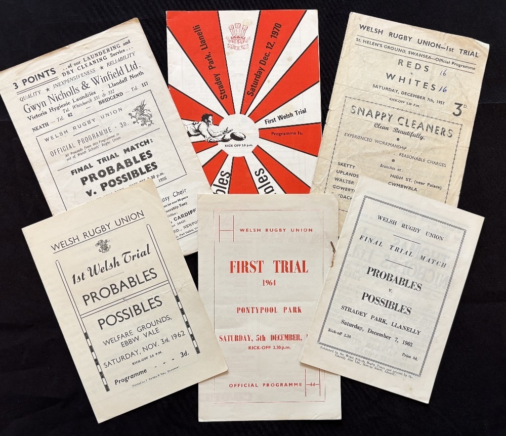 1955-70 Welsh Trials Rugby Programmes (6): 1st trials 1957 (Swansea), 62 (E Vale), 64 (Pontypool), 70 (Llanelli); Final trials 55 (Cardiff) and 63 (Llanelli)