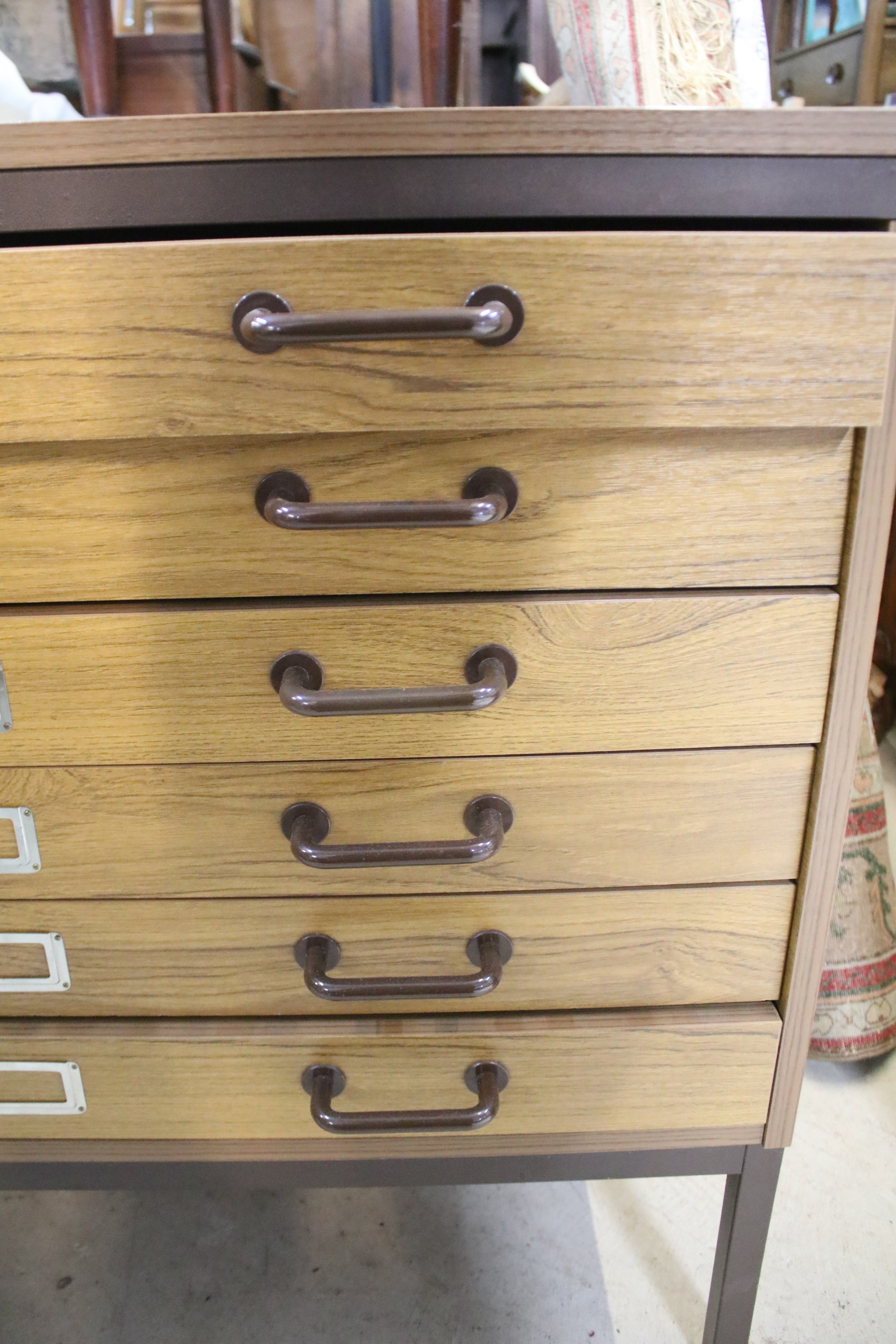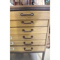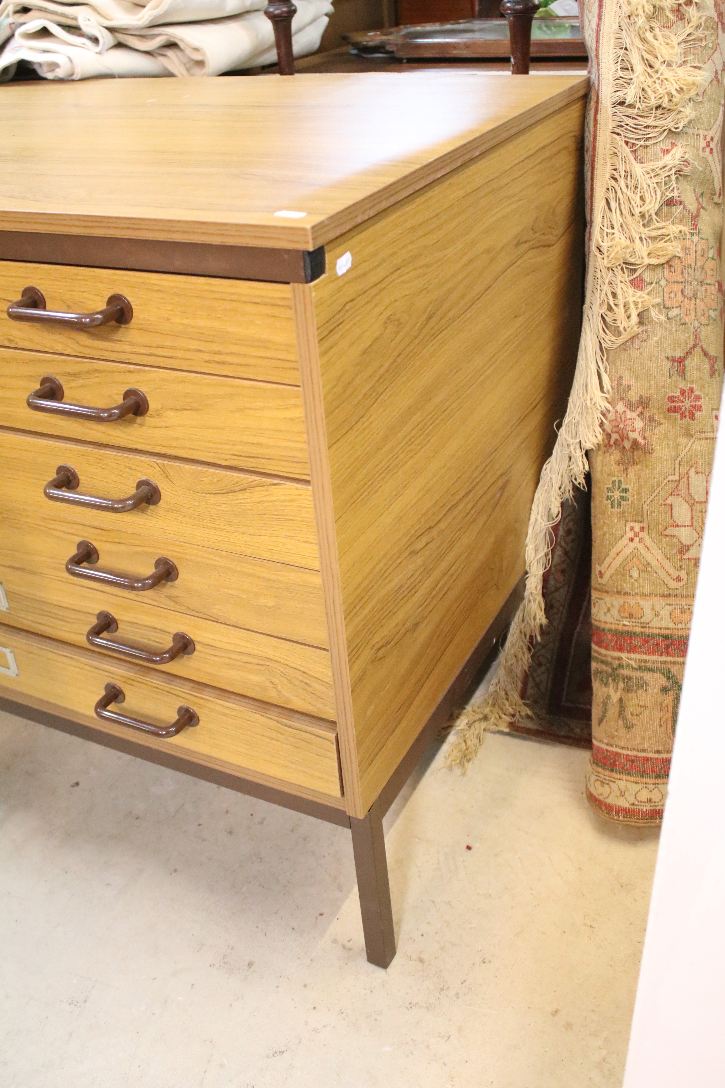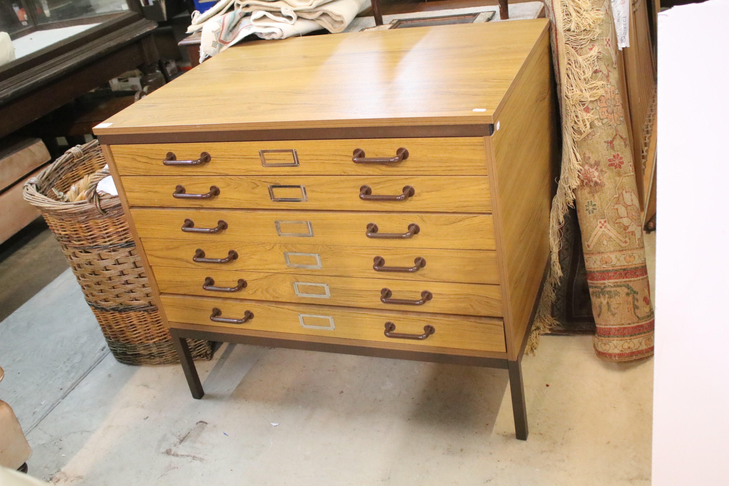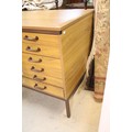 20th century industrial design plan chest, having six long drawers raised on metal legs, W 95cm x D 70cm x H 84cm