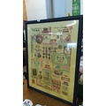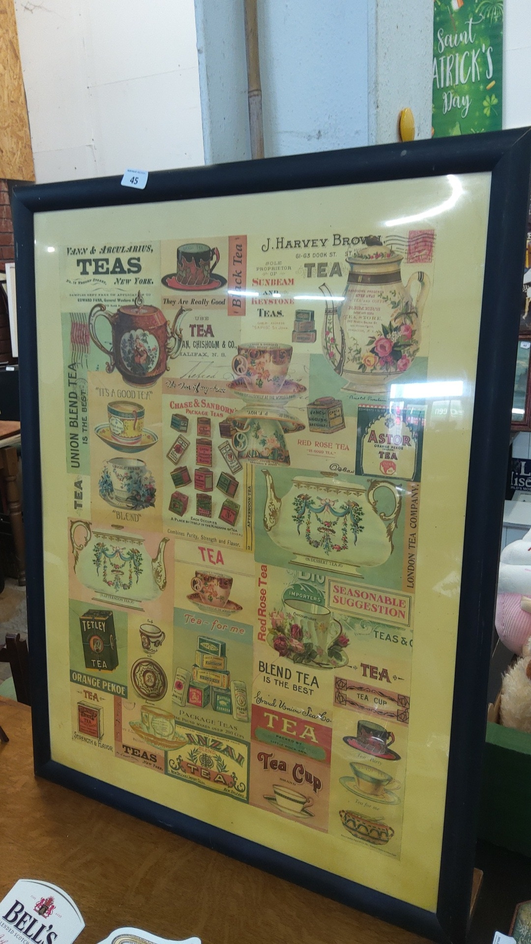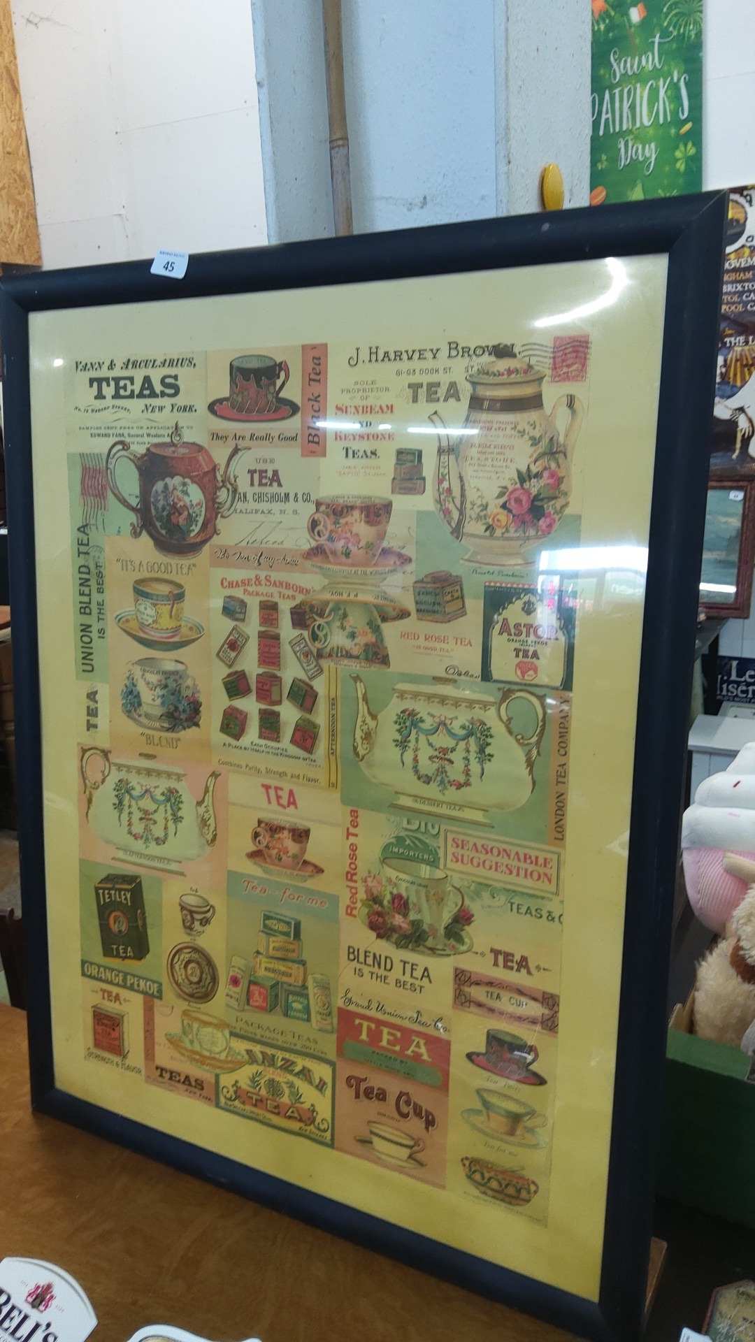 Framed colour lithographic collage poster of tea trade labels and packaging, with teaware vignettes and printed brand names including J. Harvey Brown, Astor, Tetley, Red Rose, and Chase & Sanborn, under glazed black frame.