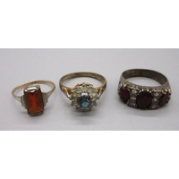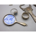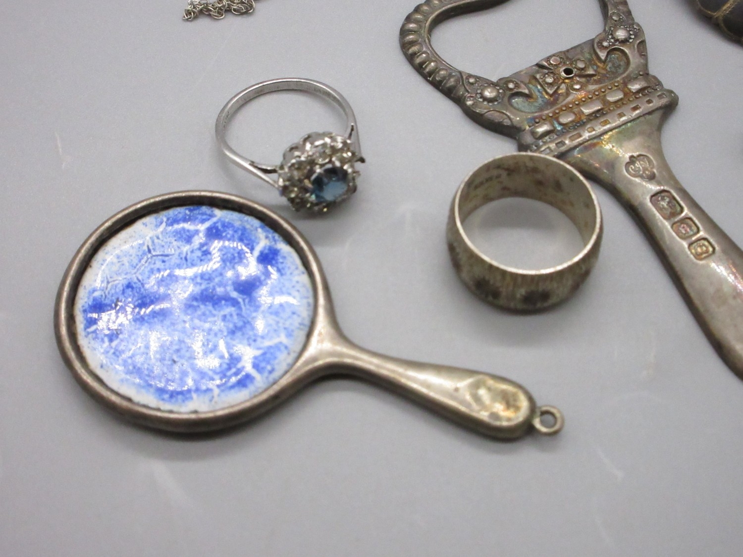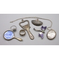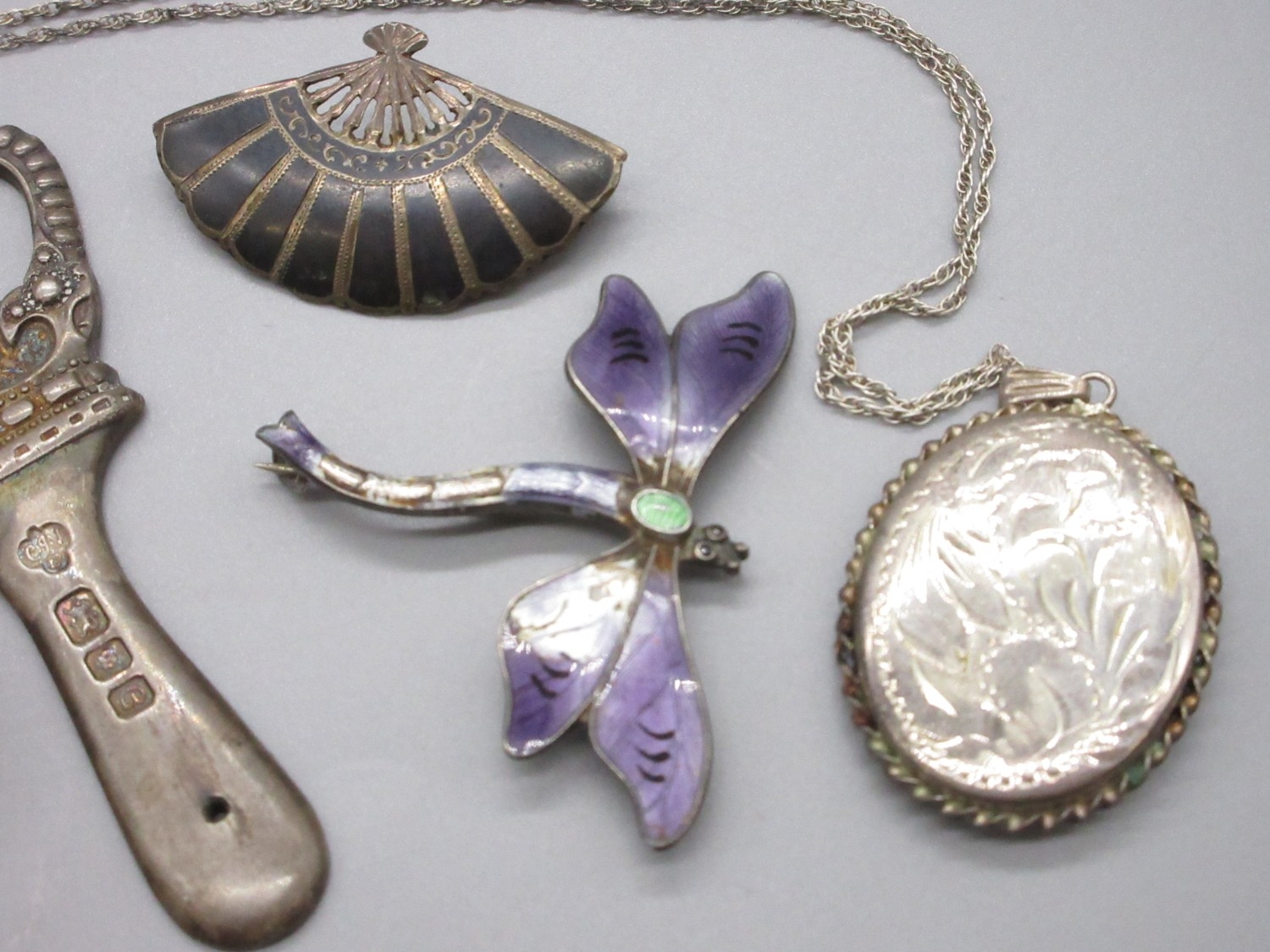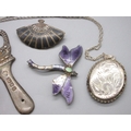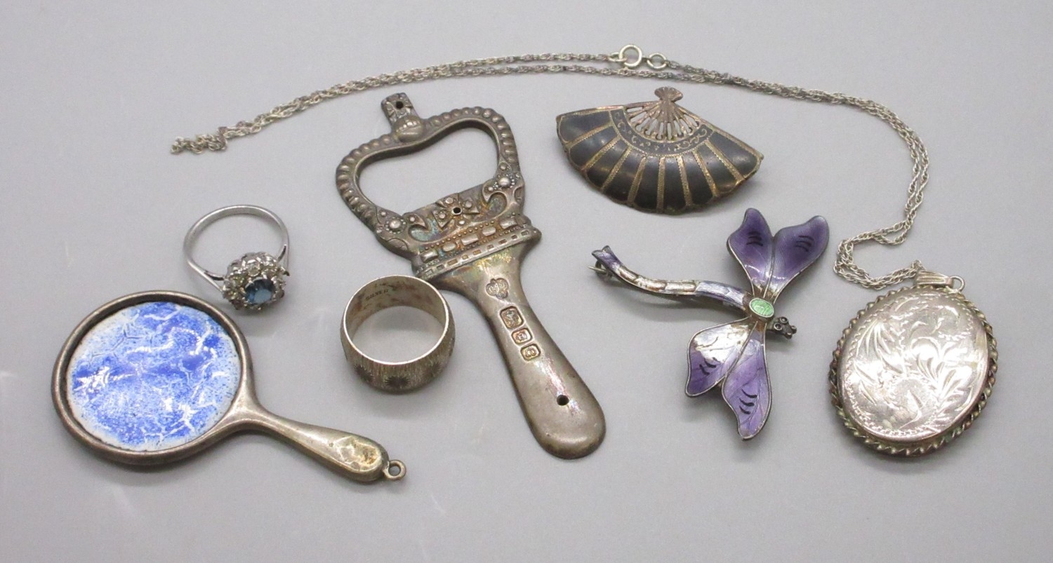 Collection of silver hallmarked/stamped items to inc. cluster ring size N, another silver stamped ring, size O, silver stamped necklace with locket, silver hallmarked bottle opener, sterling silver John Atkins & Sons dragonfly brooch, silver hallmarked mini mirror and a sterling silver fan brooch (gross 2.1ozt)