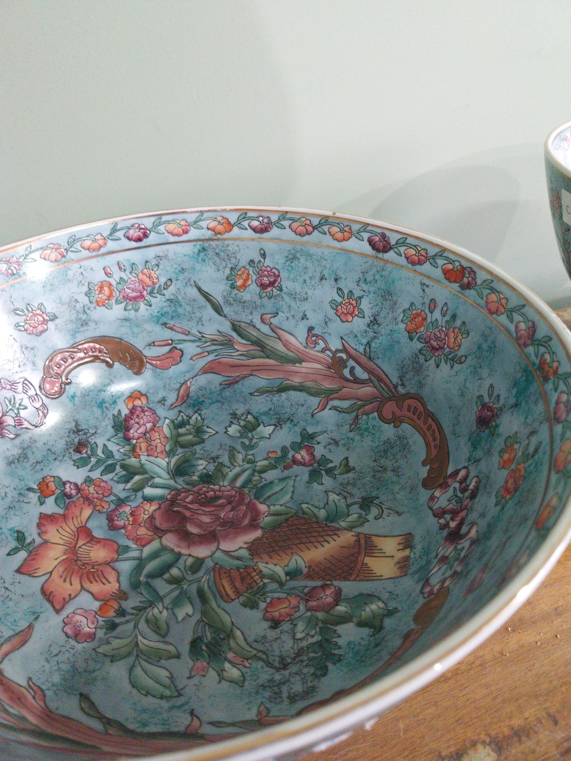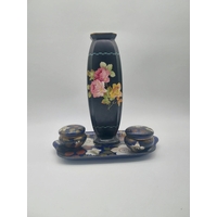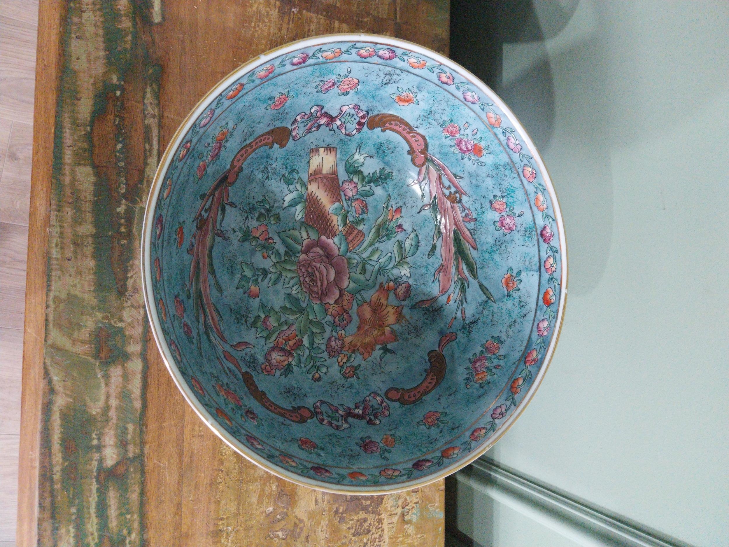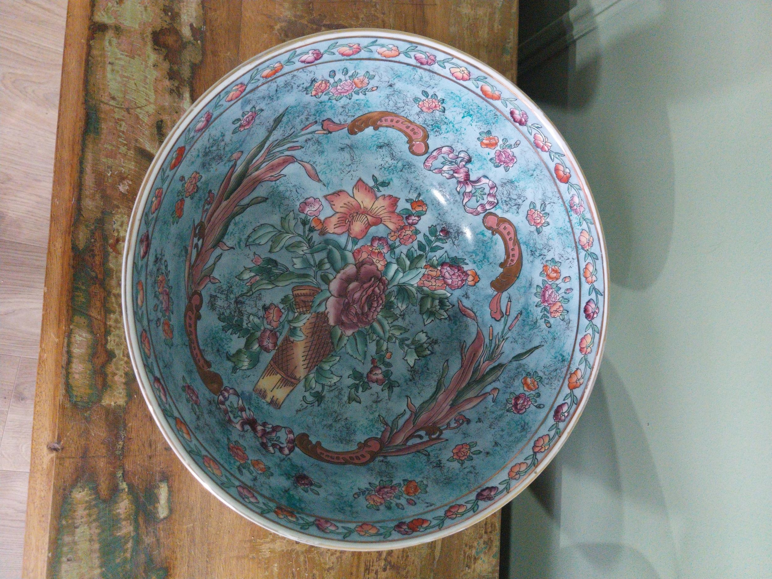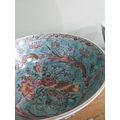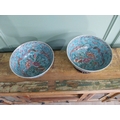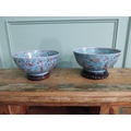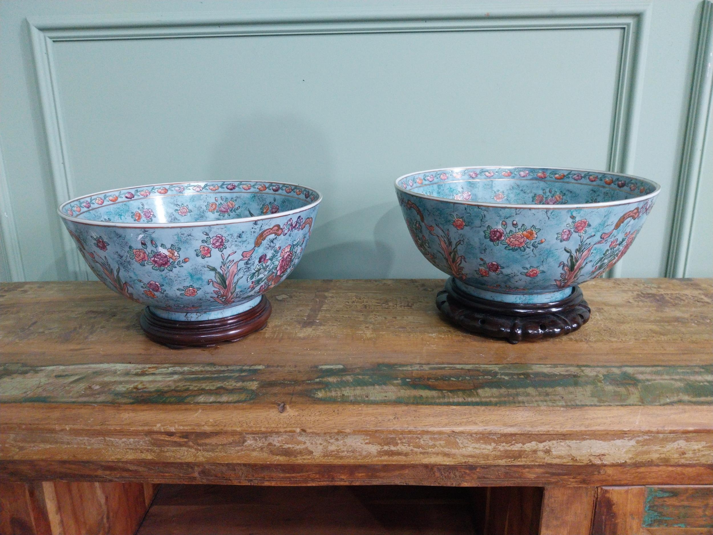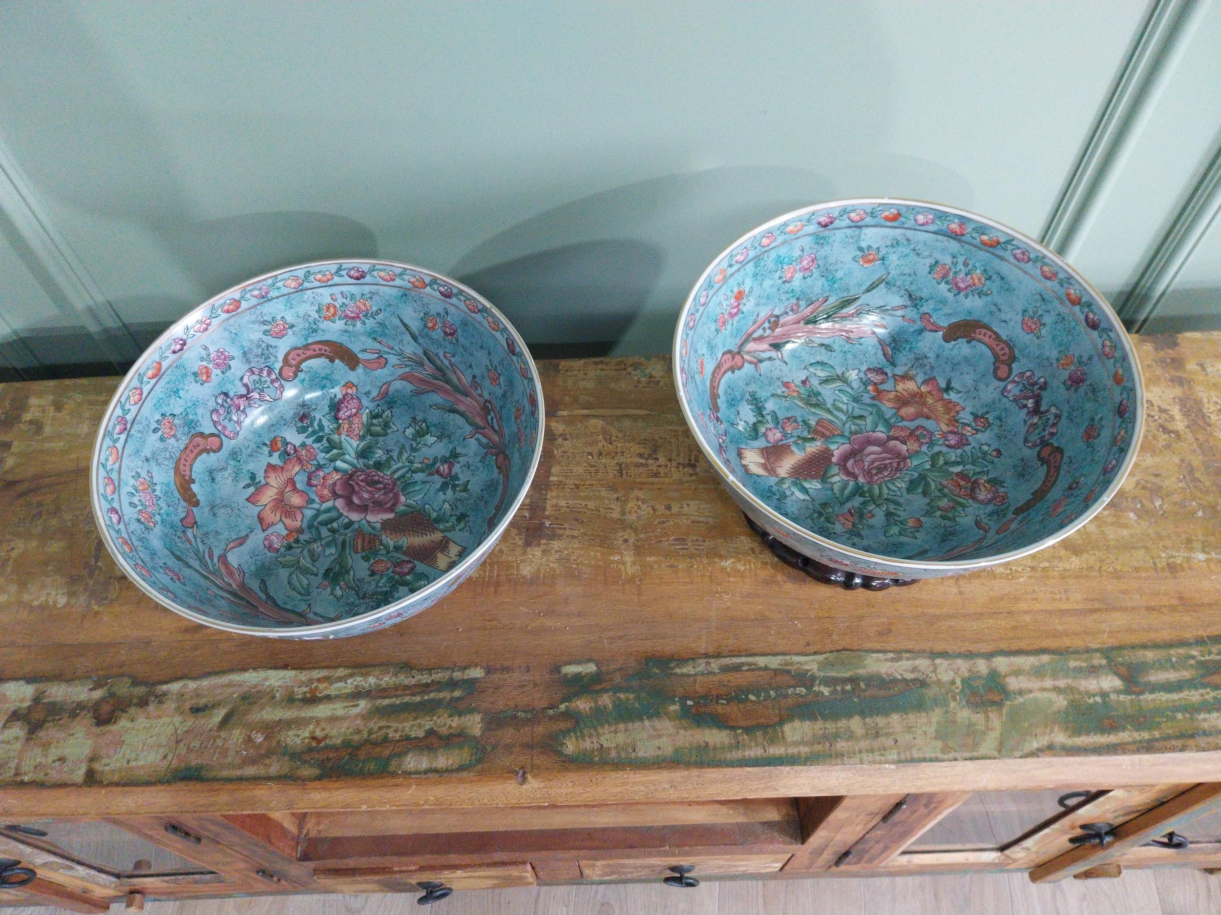 Pair of good quality Oriental hand painted ceramic vases mounted on hardwood stands {18 cm H x 31 cm Dia.}.