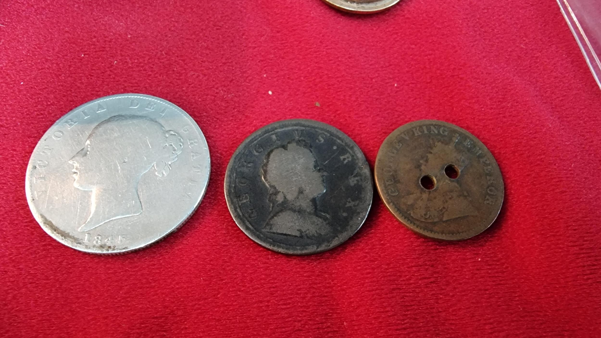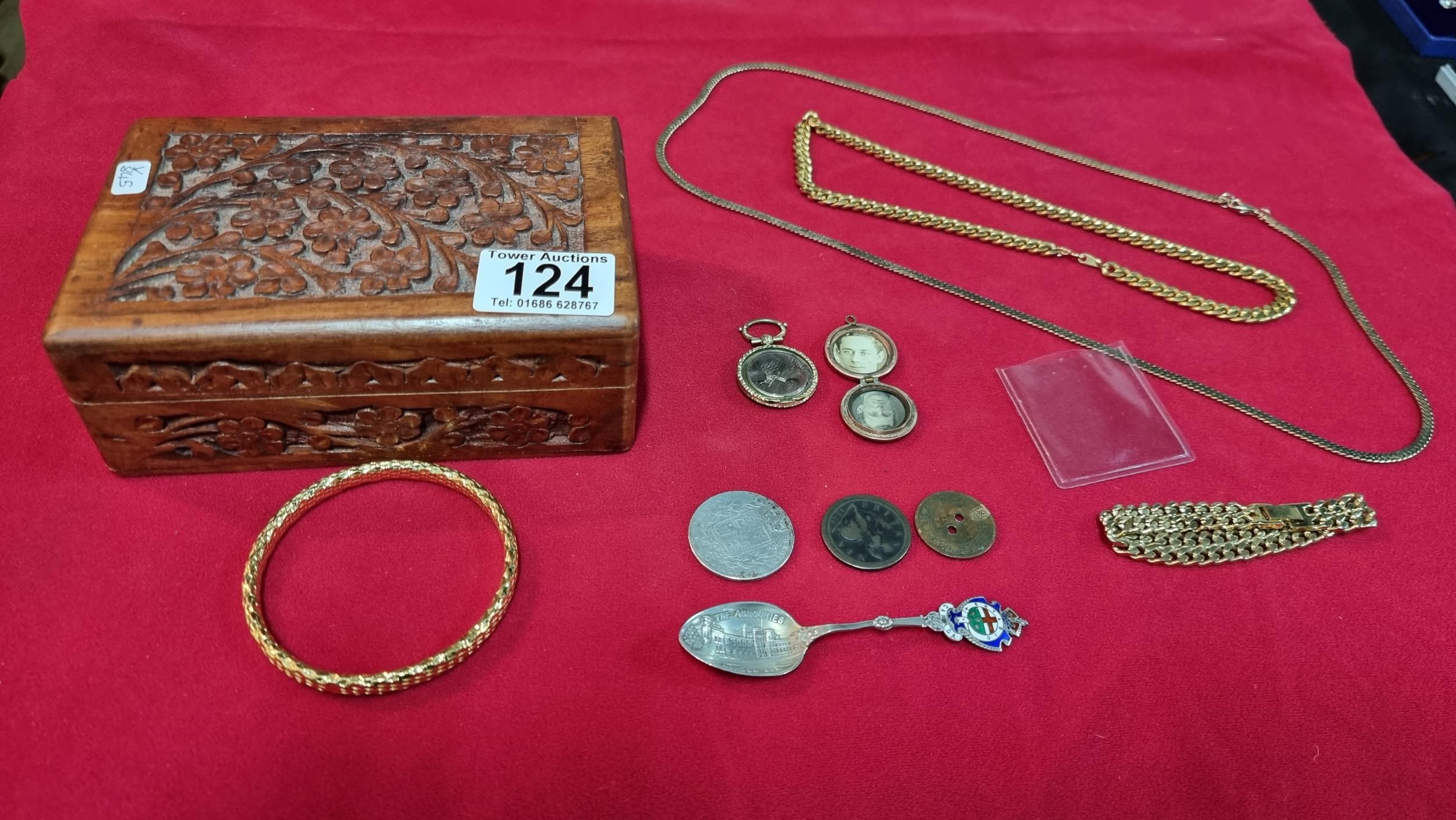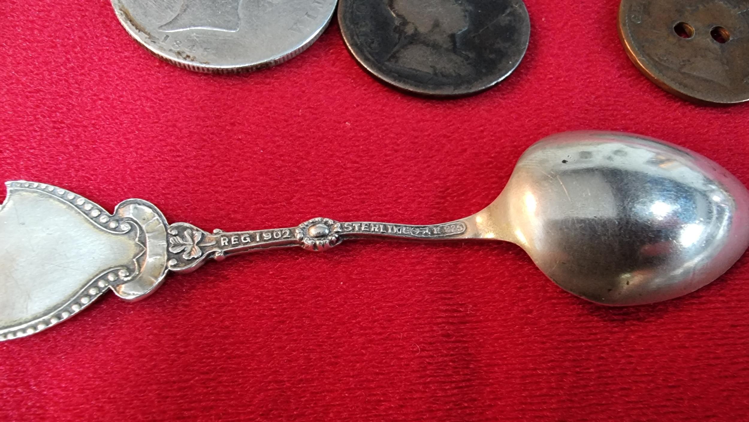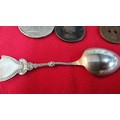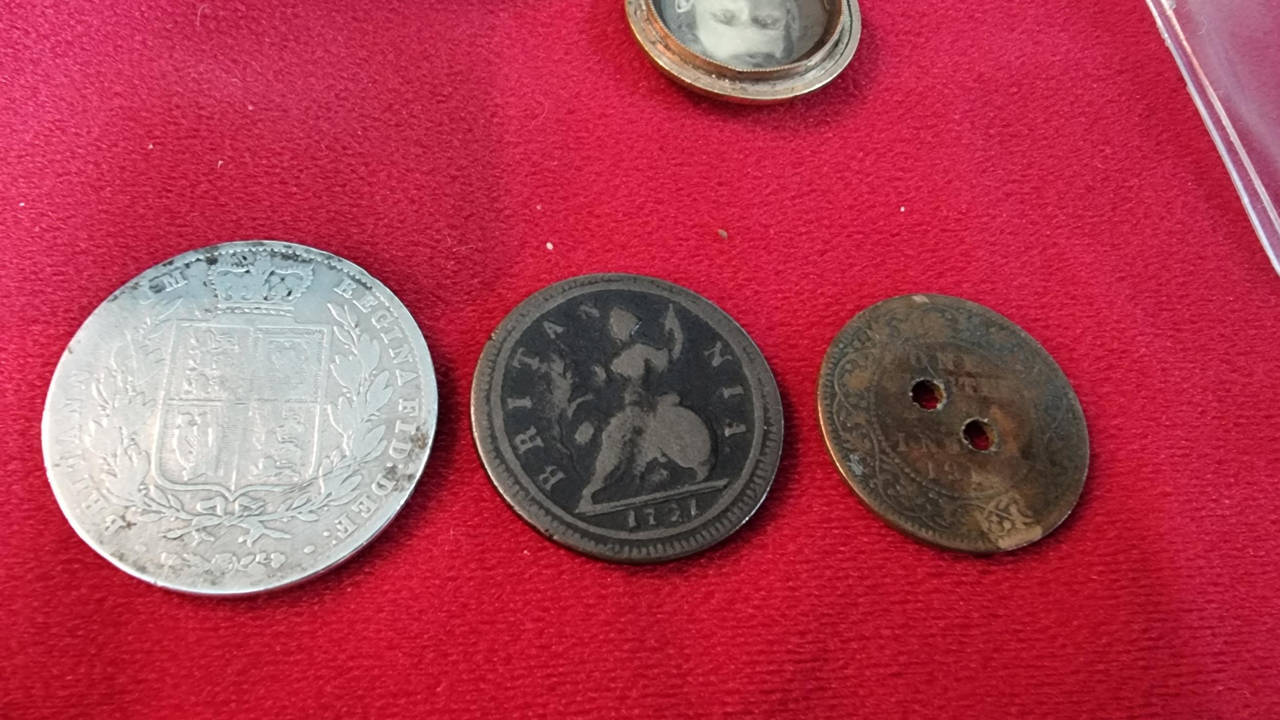 Small box of collectables inc a Sterling silver spoon, antique coins inc 1721 penny, 1845 silver Coin, Mourning lockets etc